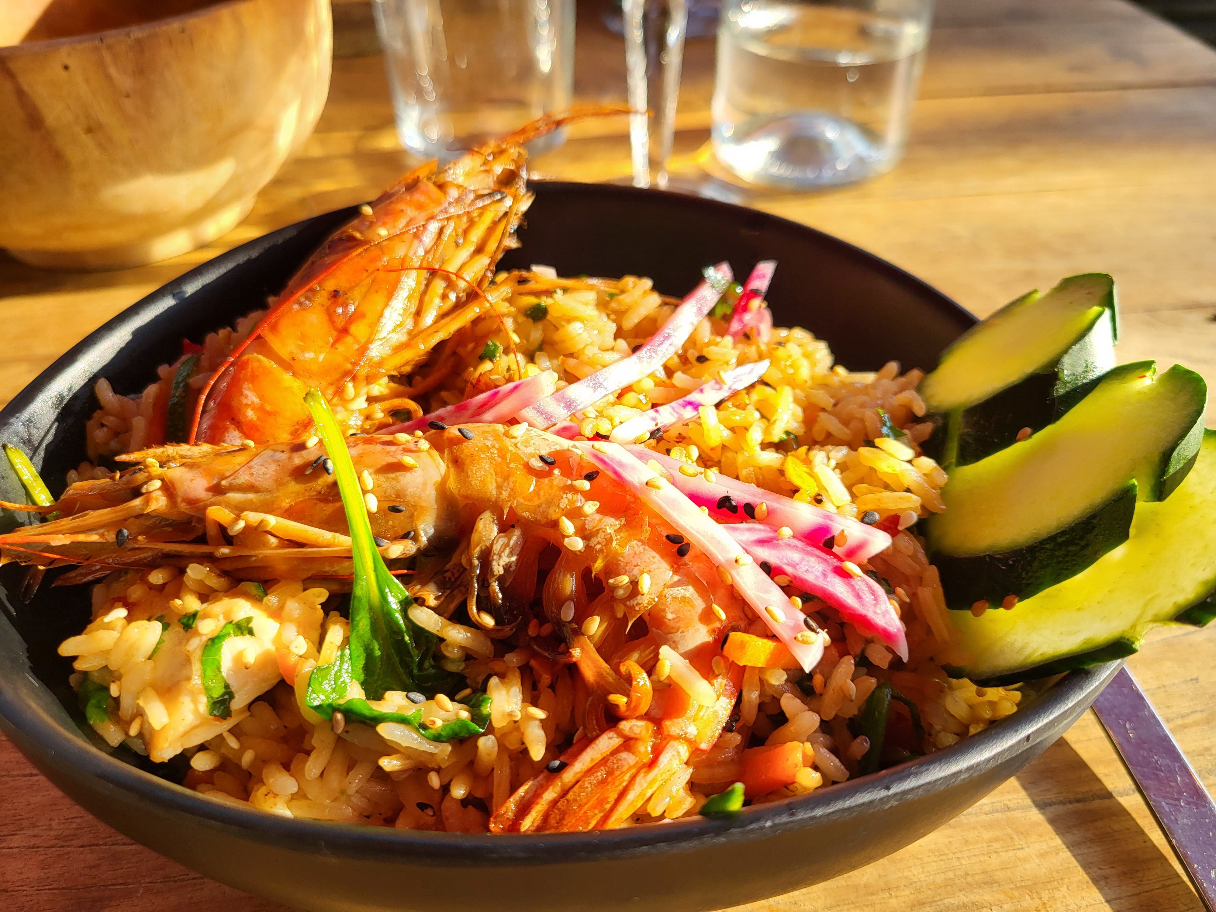 Une bonne ambiance conviviale avec le partage des tables. Cuisine variée empreinte d'originalité aux saveurs locales et asiatiques.