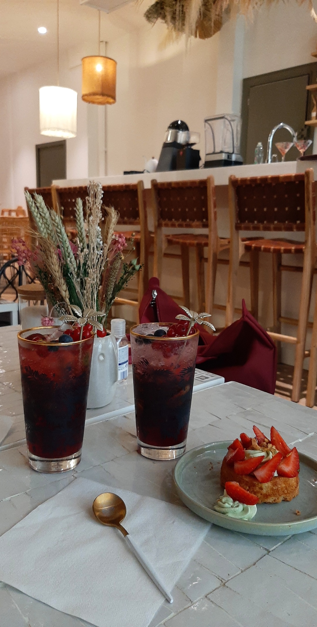 Sous le charme de ce café ! Déco très sympa. Par précaution pour le covid-19, carte numérisée. Les cocktails sont aussi beaux à voir que bons. La tarte aux fraises n'est pas mal (très belle présentation/manque de fraîcheur). Service super et les prix sont correctes. Je vous recommande vivement d'y aller !