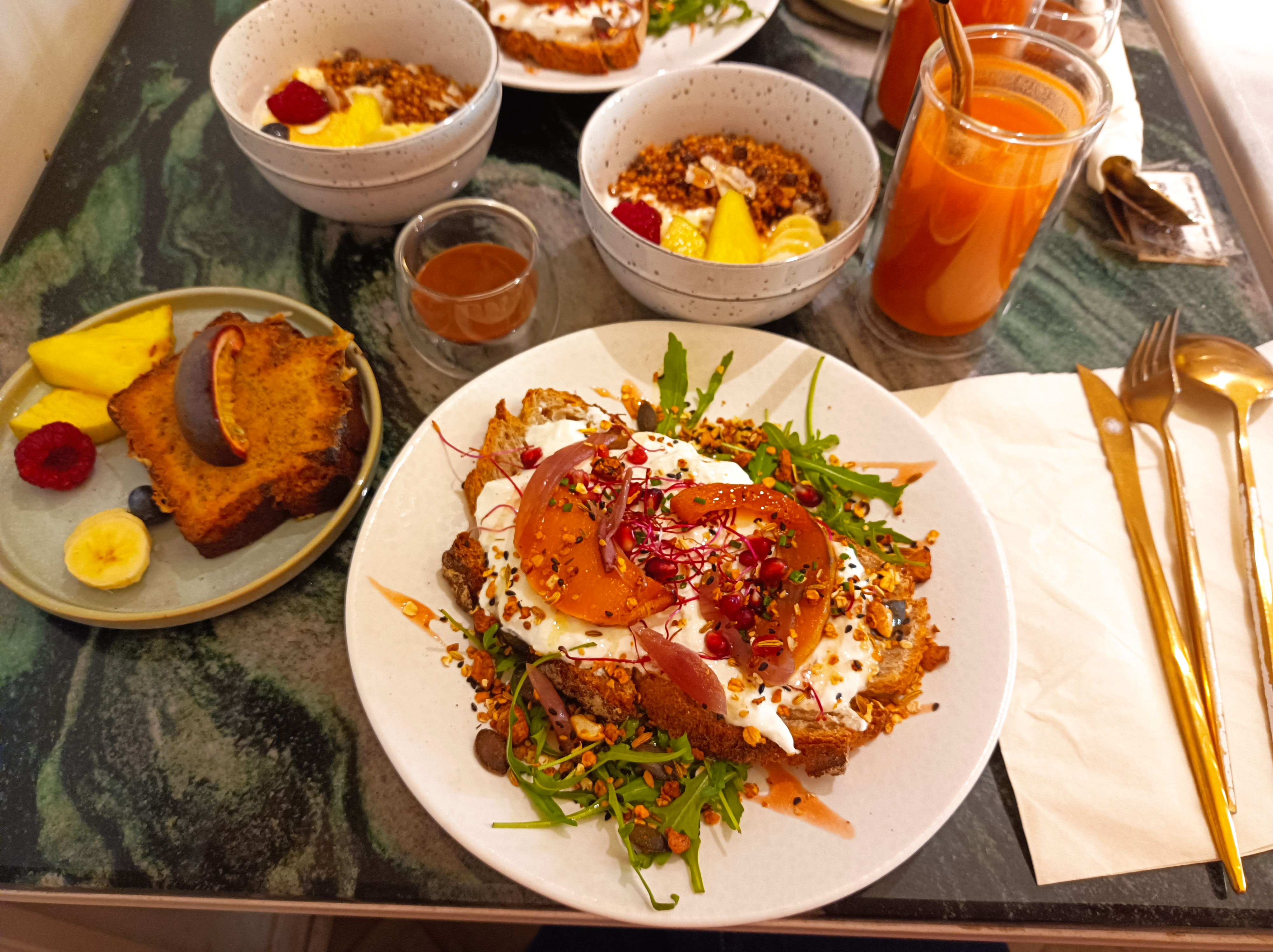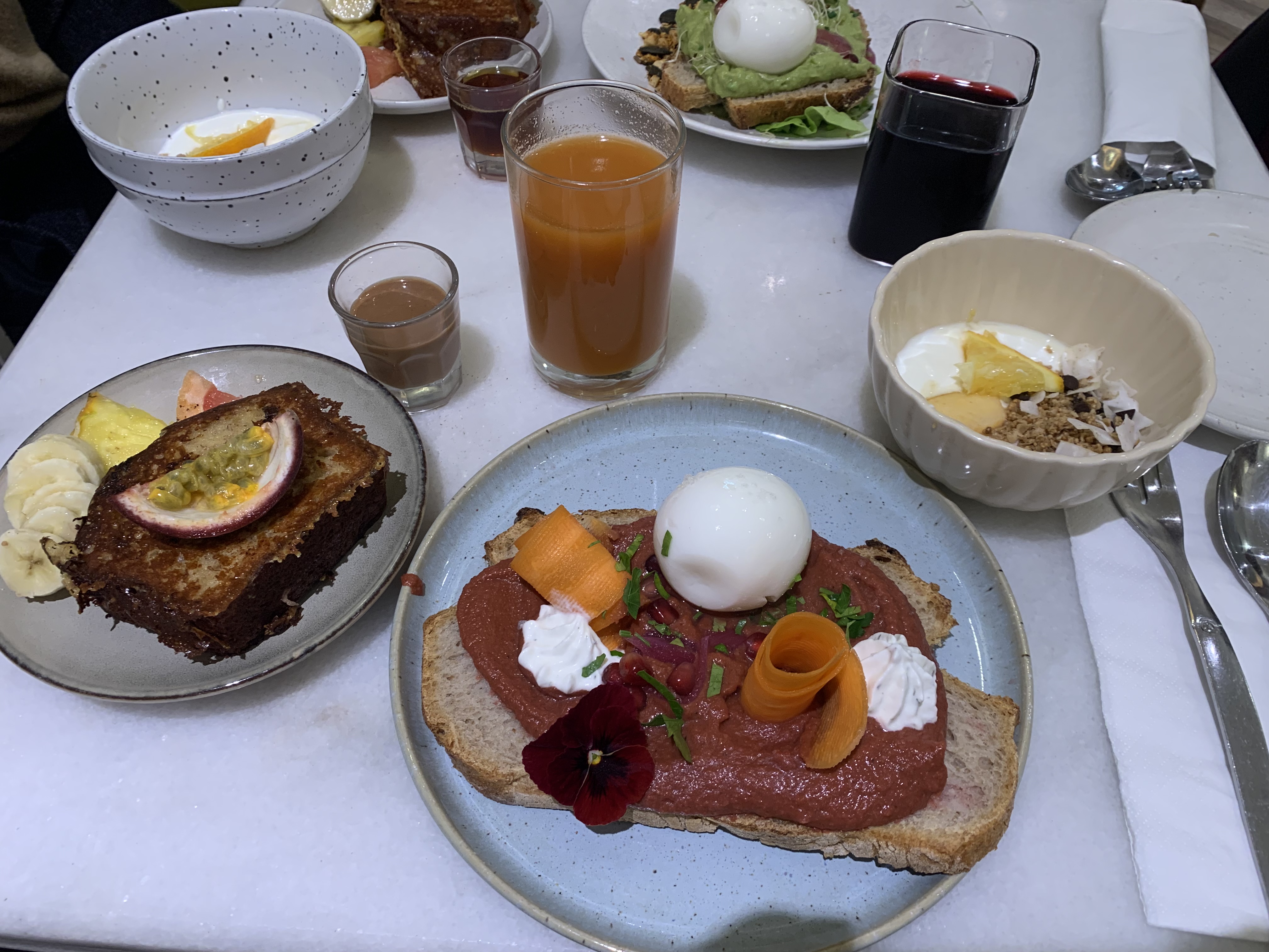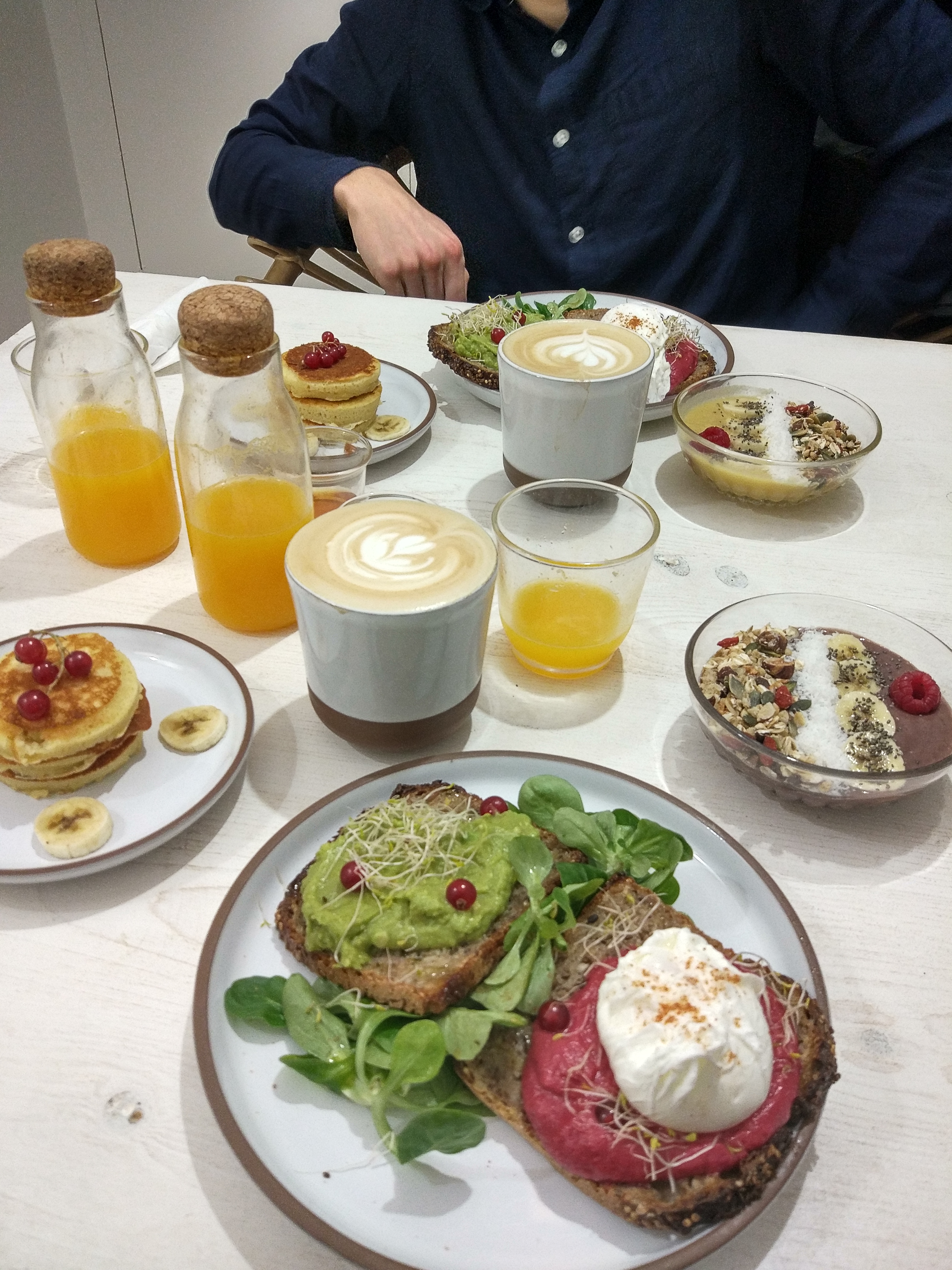 Un brunch aux goûts variés avec des tartines généreuses et parfumées, un jus d'orange pressé vraiment frais et un bowl impeccable. Mention spéciale pour les pancakes et leur épaisseur livrant une tendresse et une douceur impressionnante.