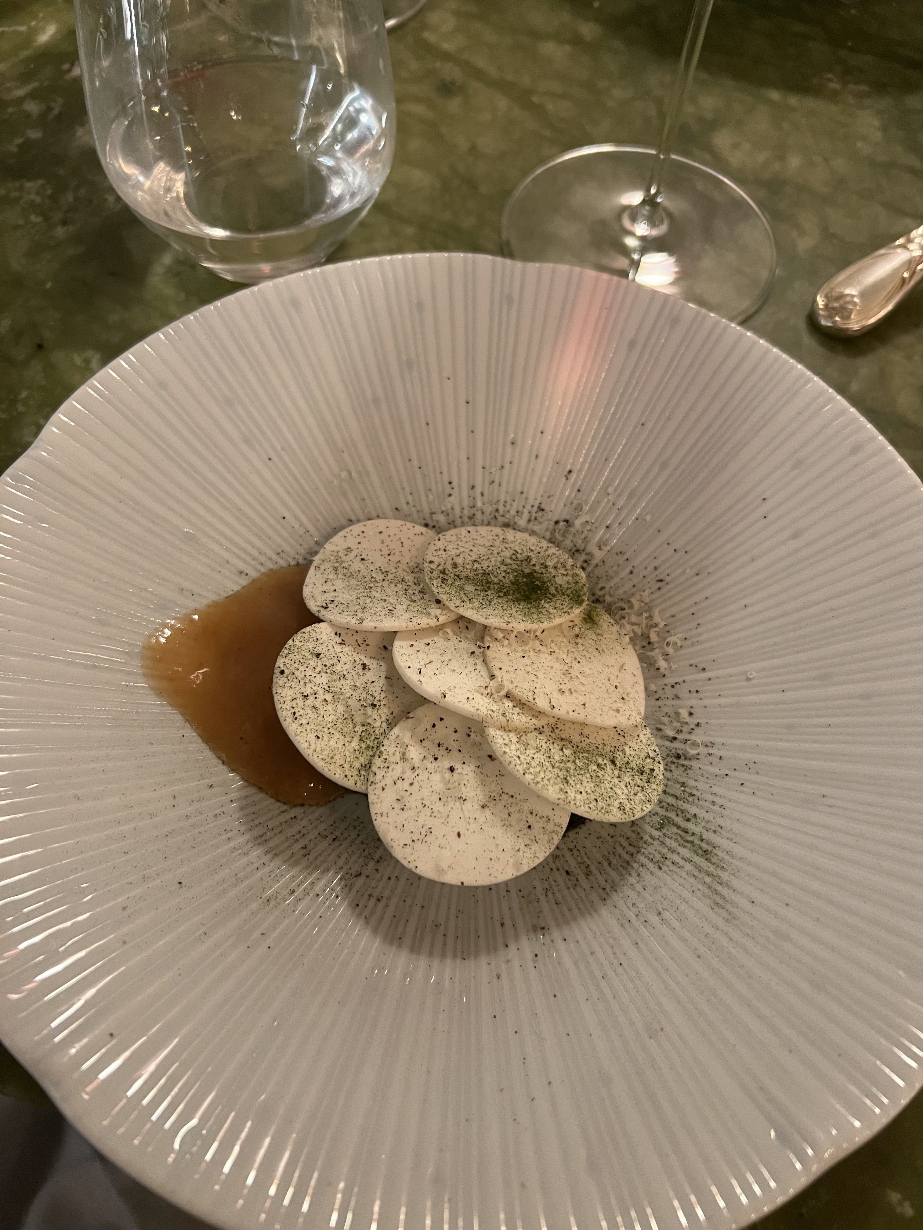 Le tout était un petit peu décevant. La pluie en terrasse n'a pas aidé, et je ne la reprocherai évidemment pas au restaurant (même si des parasols chauffants auraient pu être pertinents (nous sommes restés en manteau et avions froid...). Le plus gros problème était que les plats comprenaient des portions trop petites, on avait faim à la fin du repas. Les plats étaient en soi assez bons et présentaient un minimum de technique, mais nous en avons tout de même eu pour 150+€ pour deux sans dessert avec simplement une entrée, un plat, et un verre chacun, et à ce prix là, nous n'avons eu aucun effet wow. D'autres restaurants gastronomiques vendent souvent plus de rêve pour moins cher... Donc globalement, nous trouvons que nous n'en avons pas eu pour notre argent.