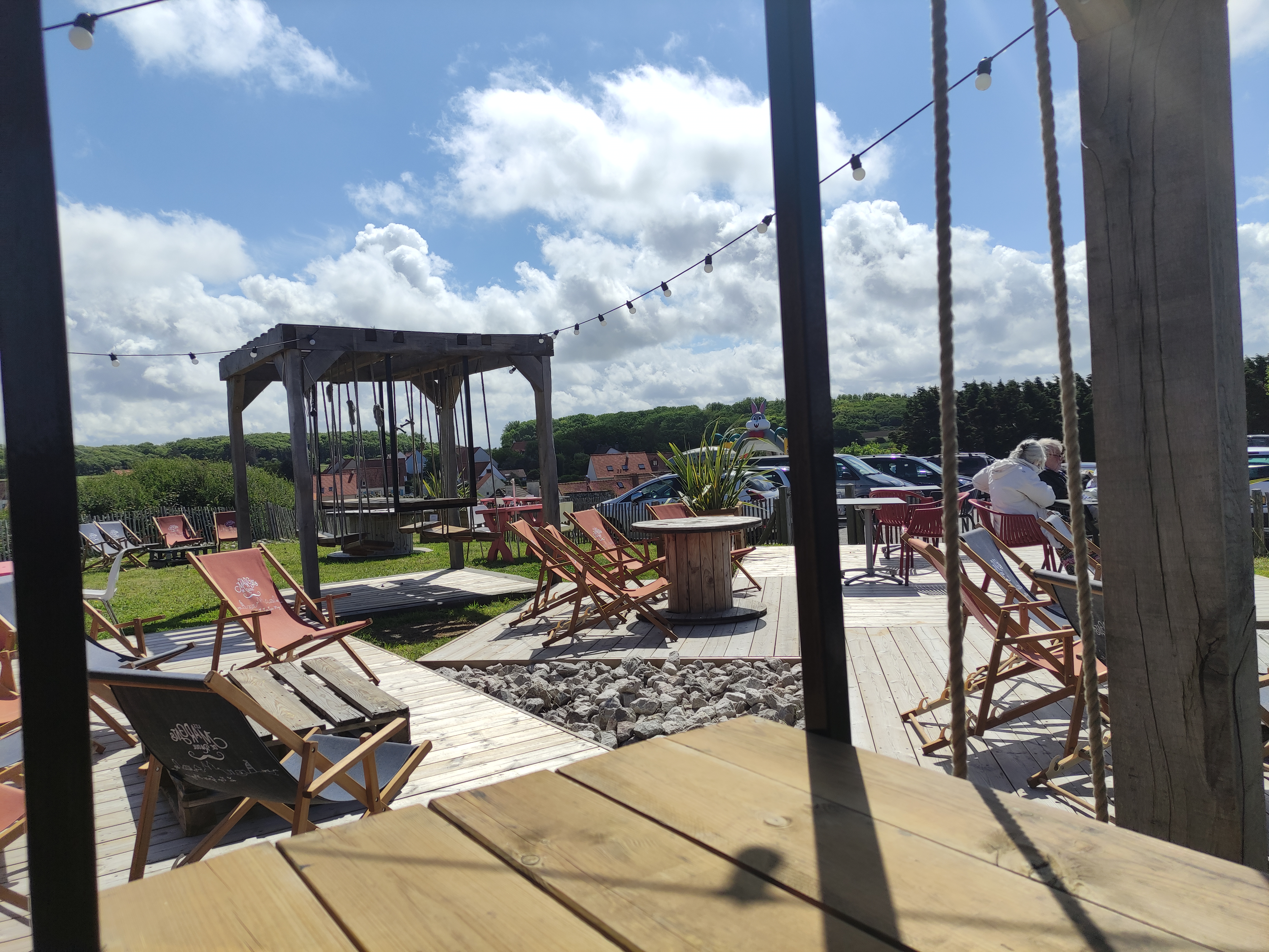 Très bel endroit pour petits et grands pour manger et boire. Belle mise en place. Chaises à bascule, objets de jeu et chaises de plage. Nous avons mangé des frites et bu quelque chose. Agréable à combiner avec le point de vue sur l'Angleterre.