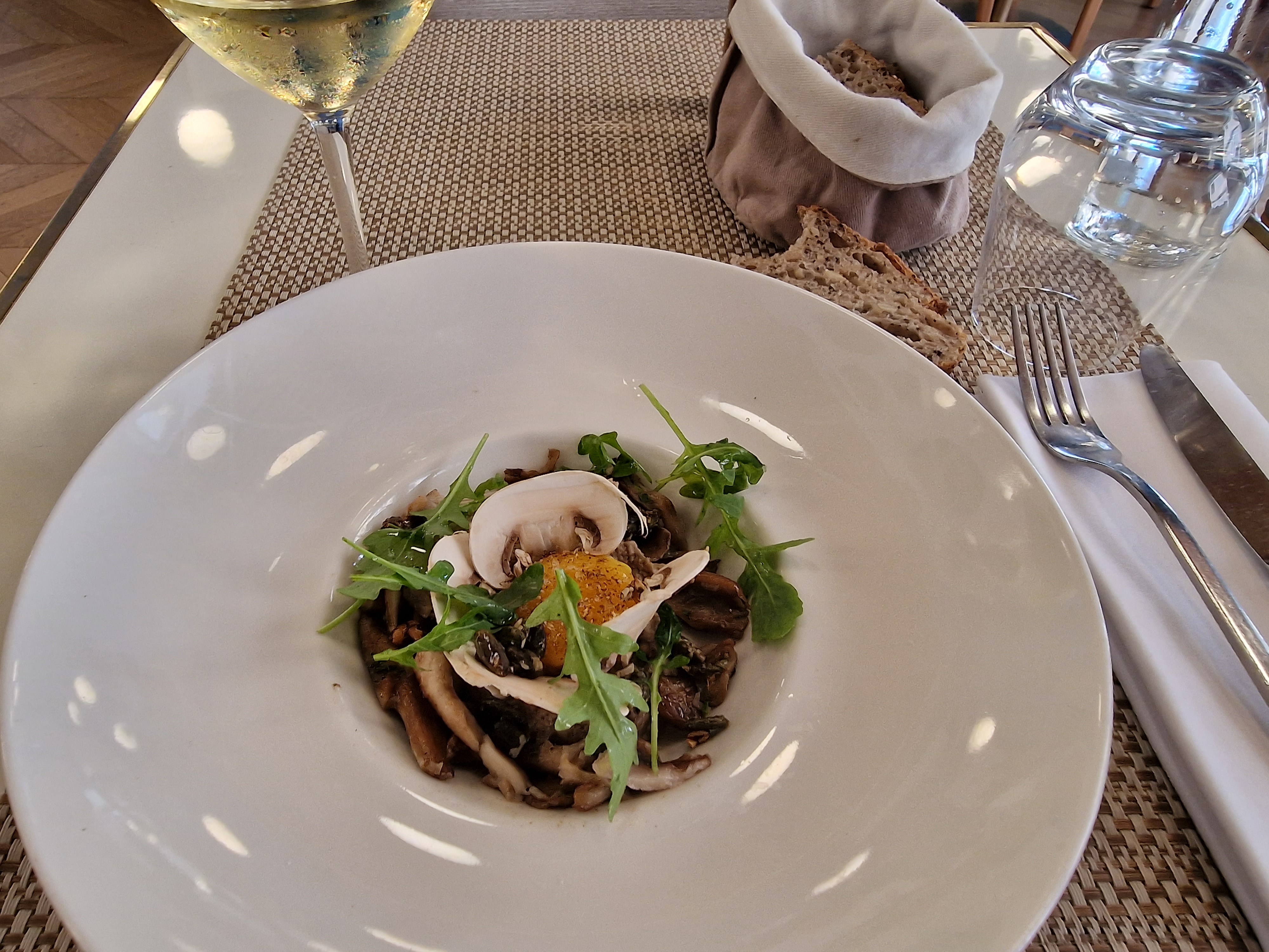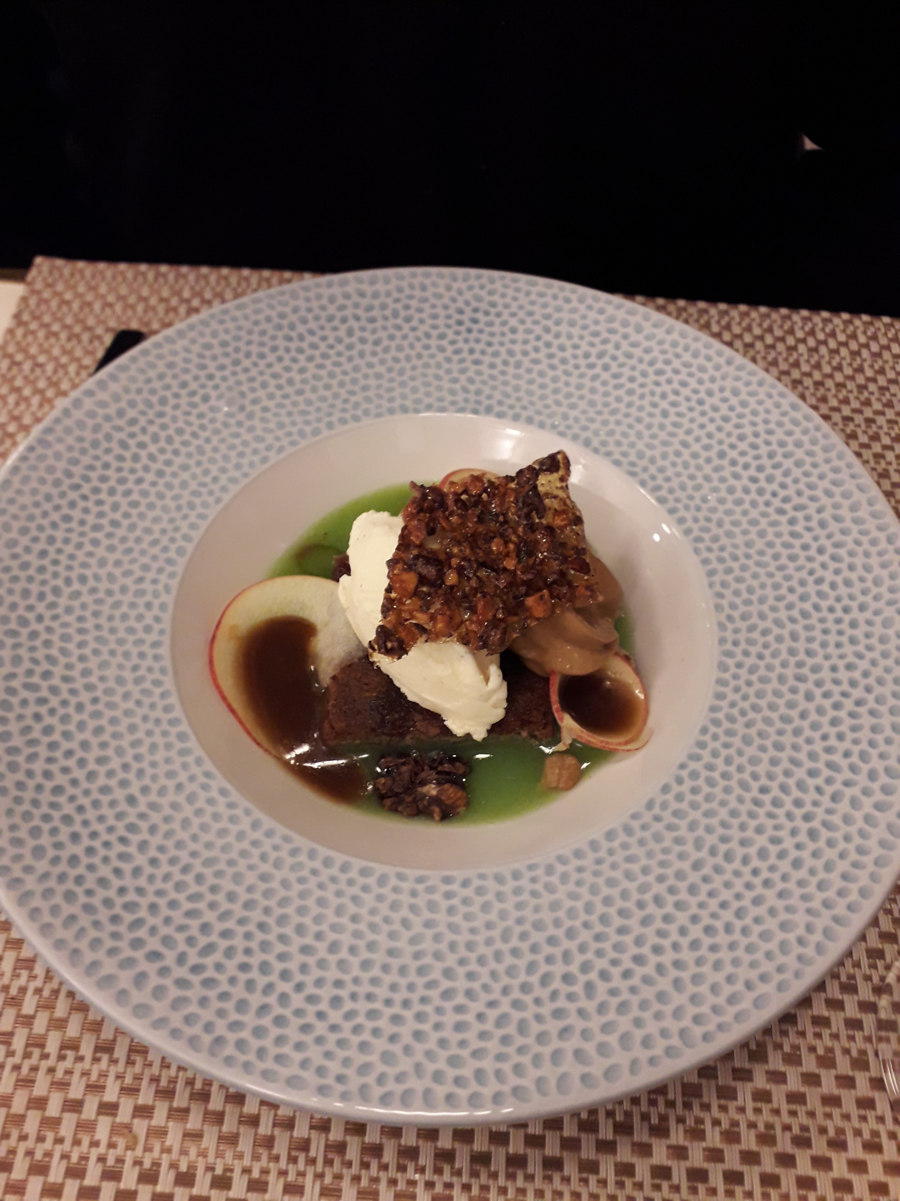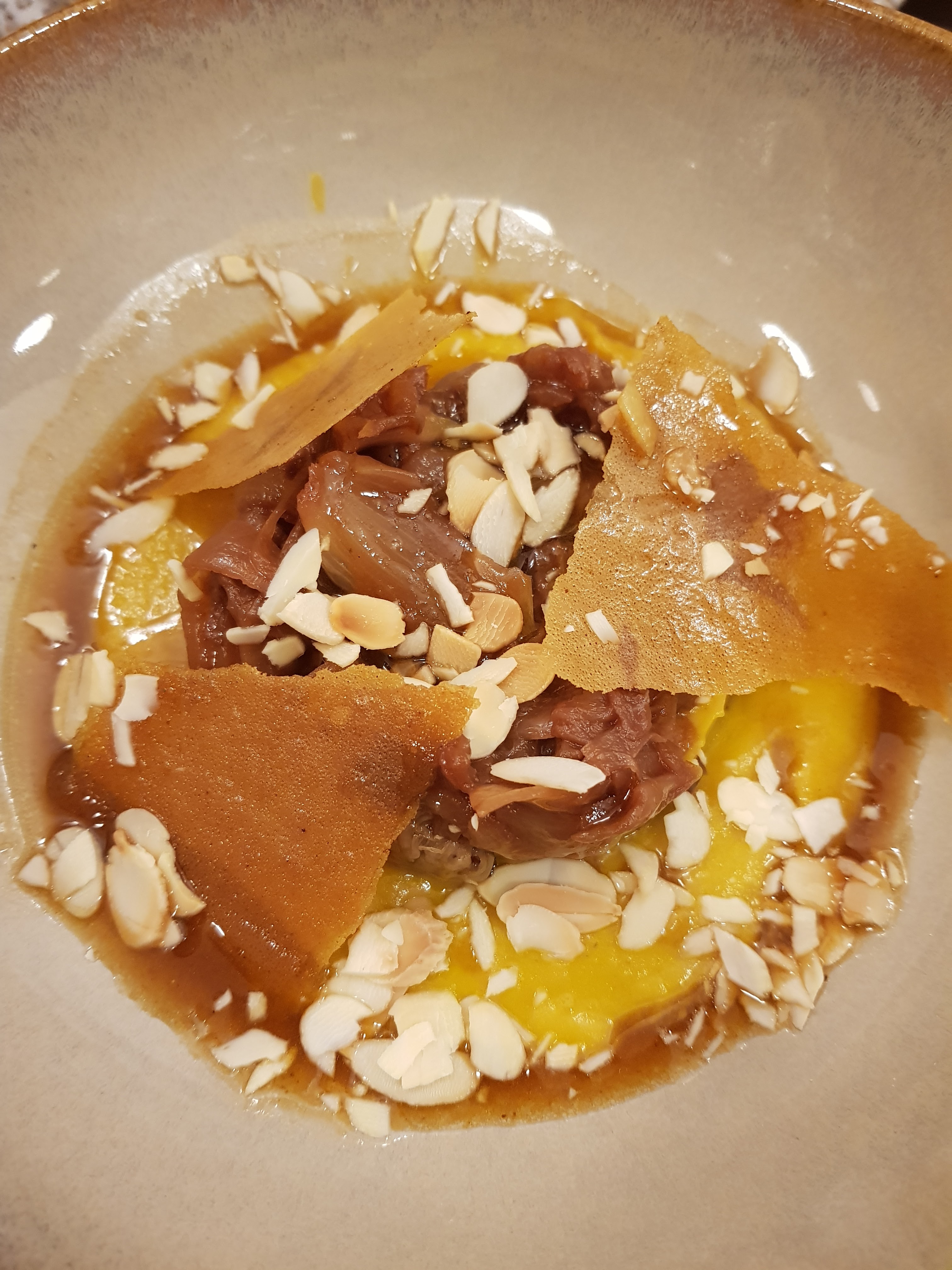 J’ai pas compris le plat principal de poulpe confit. Pourquoi autant de sauce ? J’ai mangé mon plat à la cuillère à soupe et j’ai mangé du pain pour me caler car très peu de riz noir. La personne avec moi n’a pas non plus compris l’oeuf mollet car bcp de coriandre qui primait sur tout le reste. Rien de grave, j’ai sans doute fait le mauvais choix ce jour-là.