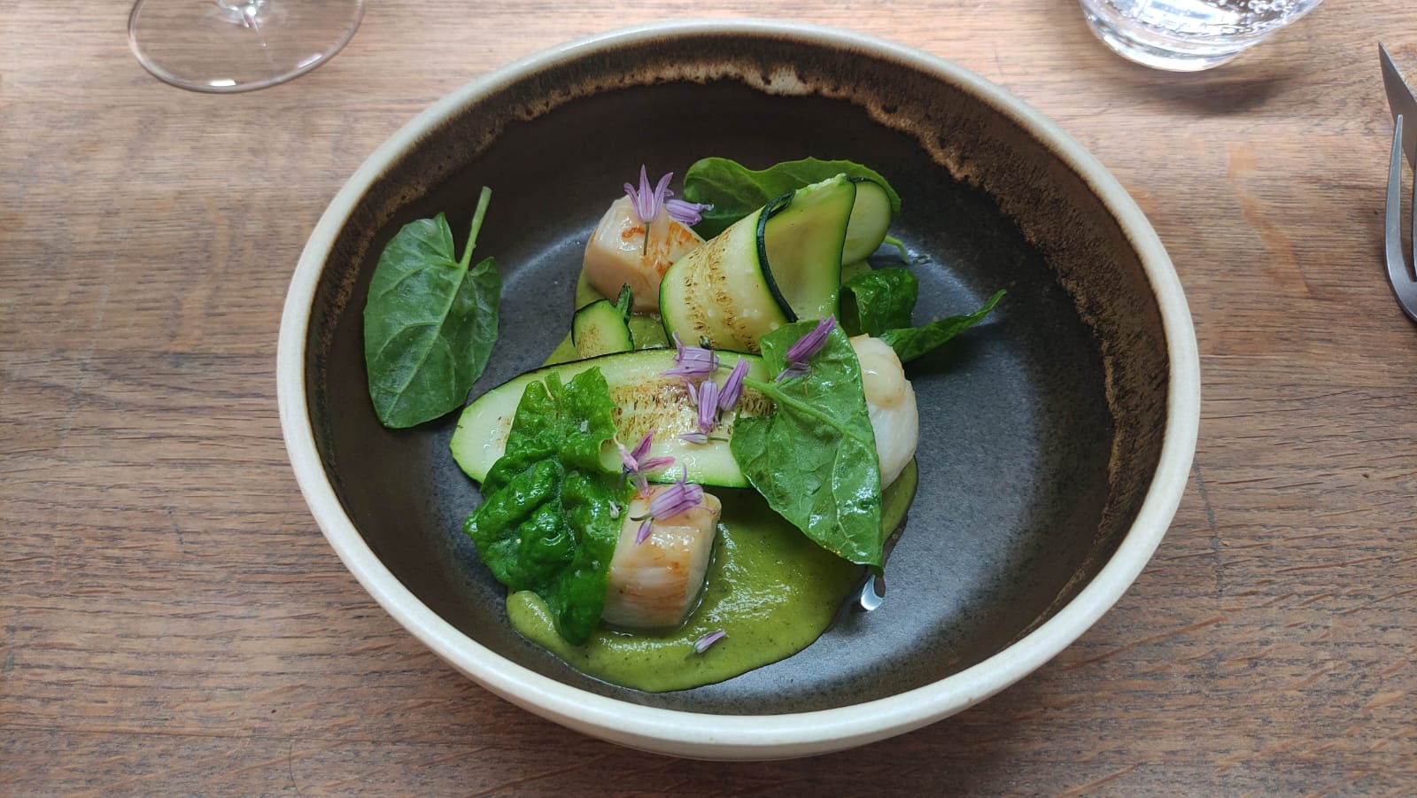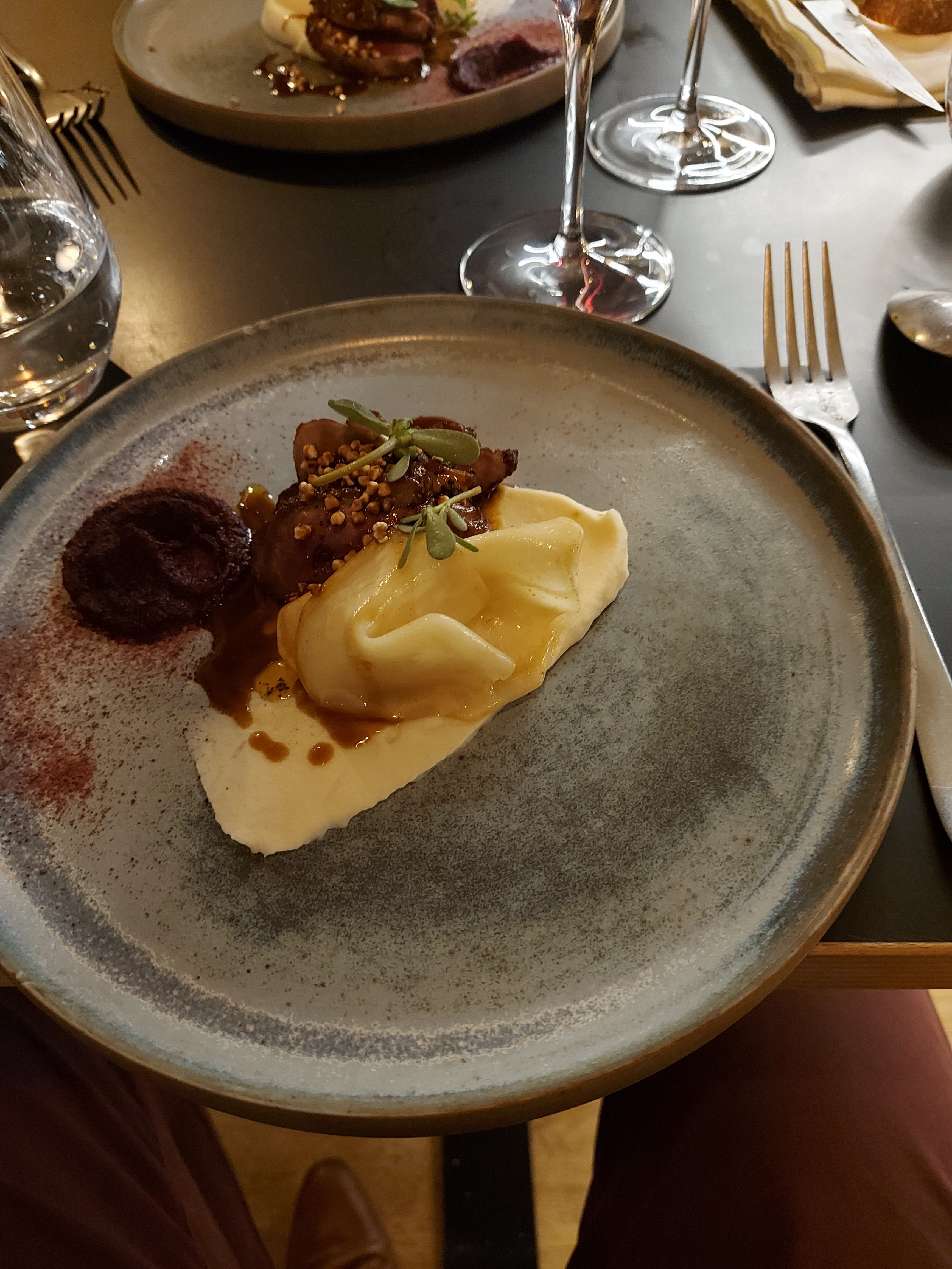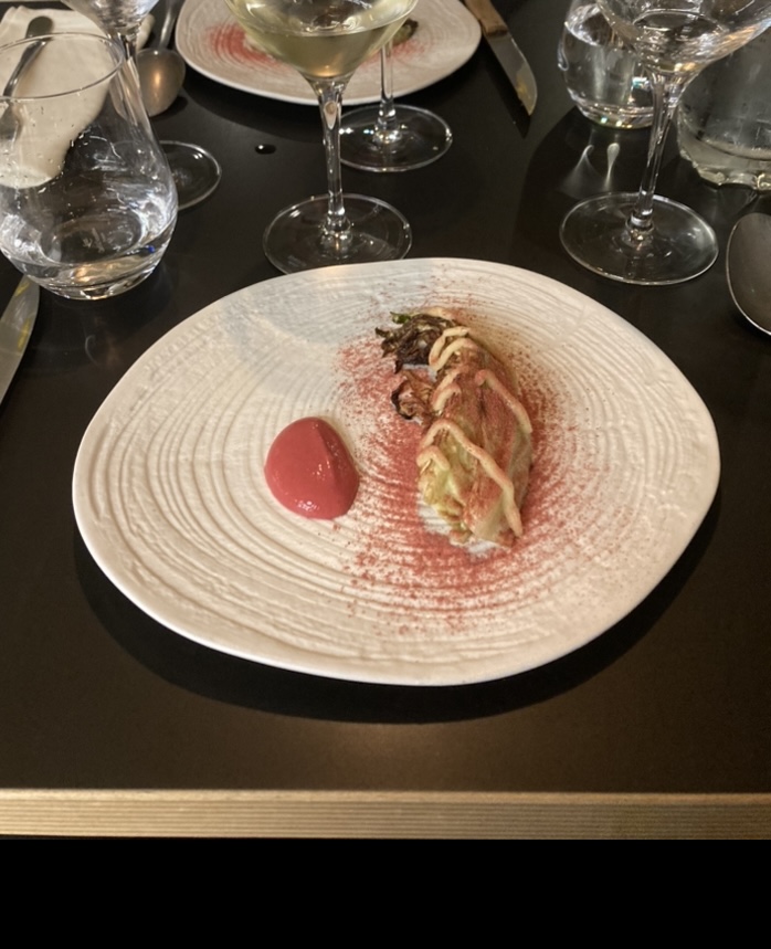 C'était absolument exquis ! Rien n'est laissé au hasard visuellement et gustativement parlant. La présentation, le service, la cuisine. Une petite salle très agréable avec banquette et coussins. Nous avons été très bien reçus. Pas d'accord mets et vins pour nous et un menu dégustation en 4 temps justement décliné pour le régime alimentaire spécifique : craquelin et poireaux, endive braisée champignons et crème de tomme, noix de Saint-Jacques snackées ail des ours et blettes, purée de céleri lieu jaune/canette et algues, dessert aux agrumes cédrat et citron confit sarrazin et noisettes, tarte fraise rhubarbe. Tous ces plats généreux ont ravi nos papilles. Merci à toute l'équipe de nous avoir offert ce moment précieux.