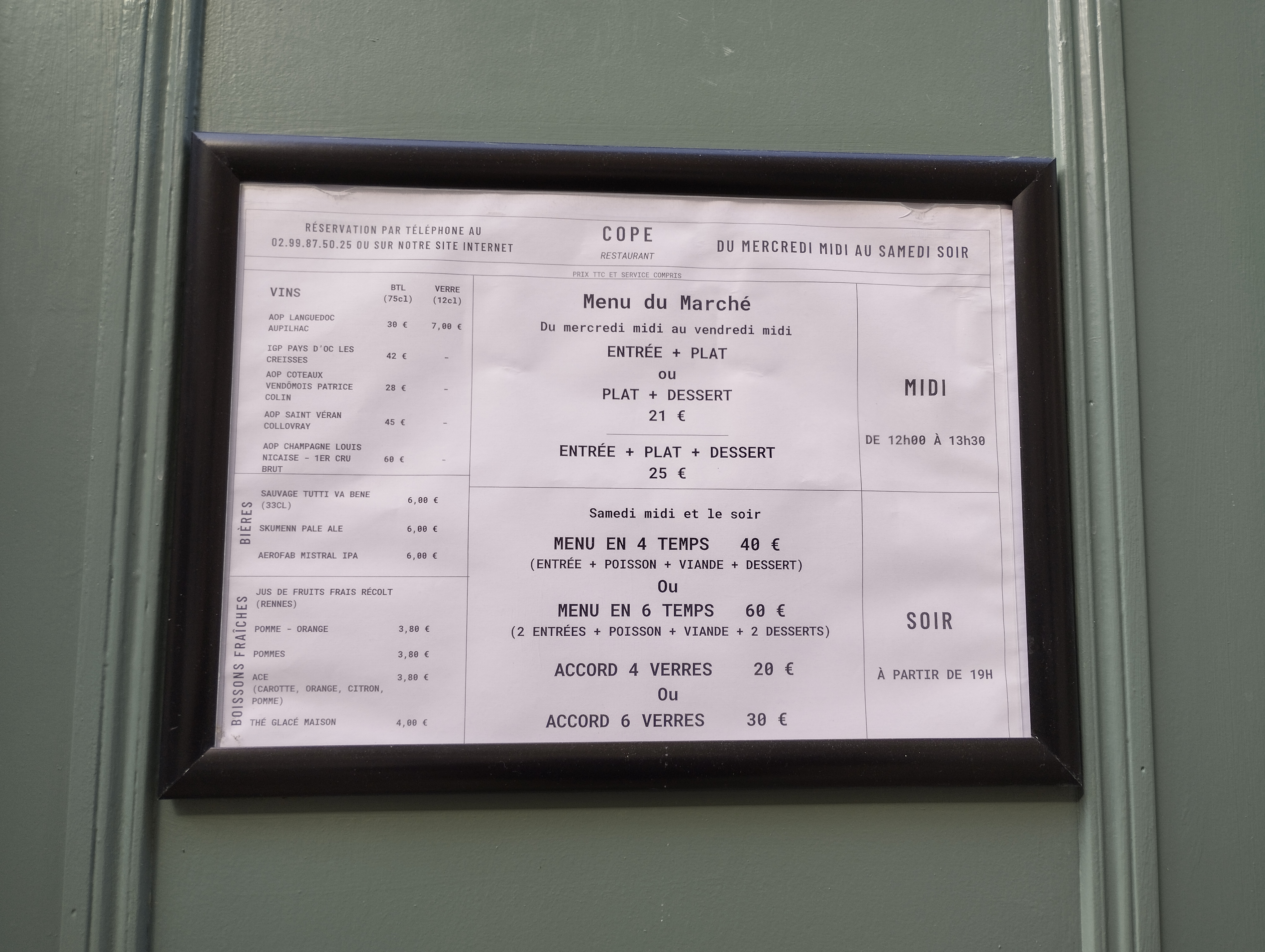 Merci beaucoup. Ce message à l’attention des futurs gourmands mais surtout pour l’équipe de Cope. Tout est pensé pour passer un excellent moment, de la devanture avec la pancarte design dans cette rue piétonne, du rideau cocooning d’entrée qui empêche les courants d’air, aux petites serviettes individuelles dans les WC, à la vaisselle soignée et artisanale, à la dégustation des vins avant de servir un verre entier, à la propreté et l’intimité du lieu, à la transparence sur la cuisine et l’origine des produits, aux 4 professionnels investis souriants, discrets mais aussi accessibles, à la connaissance des produits, à l’eau pétillante ou plate à volonté, à cette explosion de saveurs dans les assiettes, aux voyages à travers nos belles régions françaises. Nous avons adoré votre identité et votre lieu. Bravo et bonne continuation!