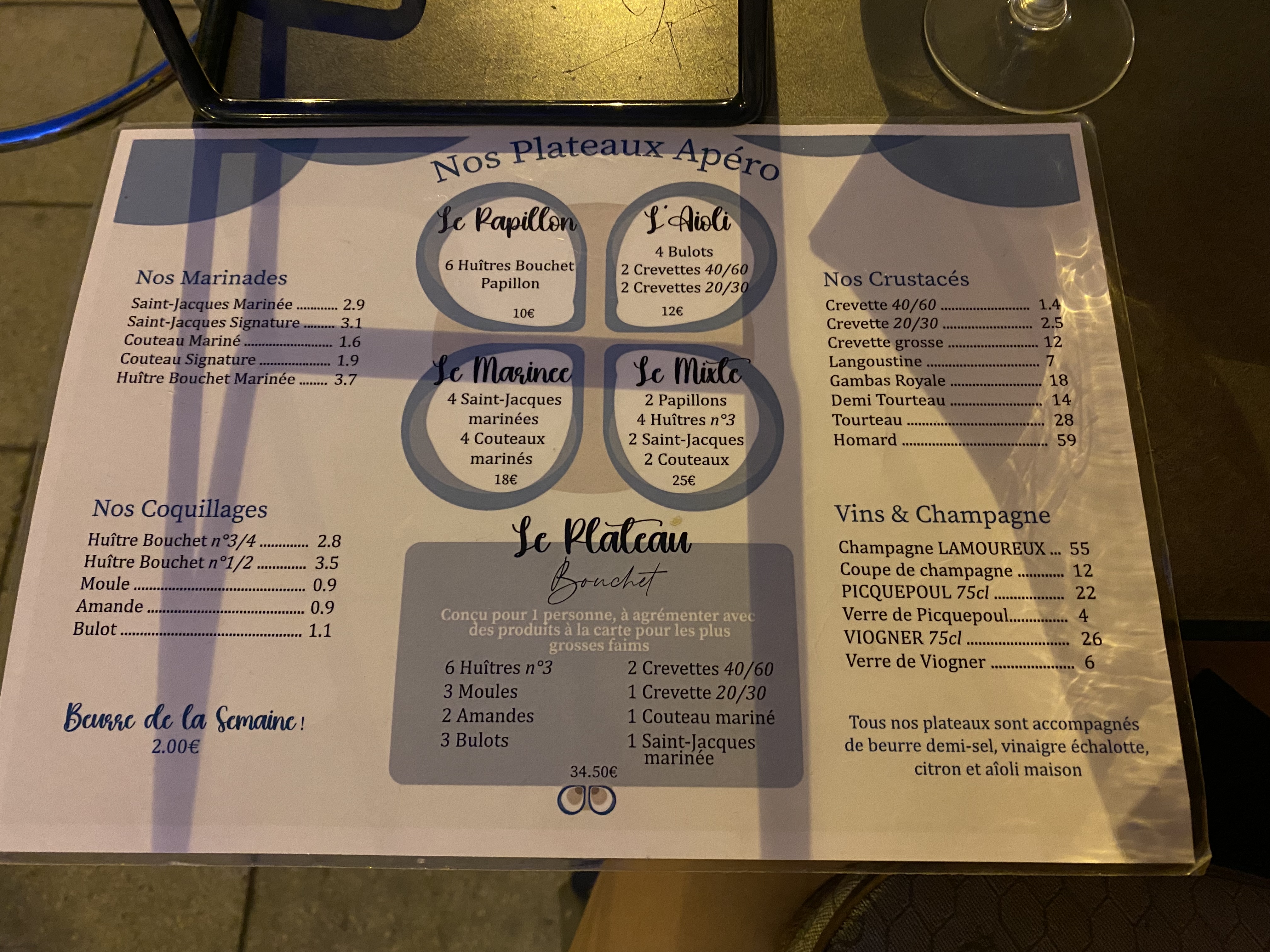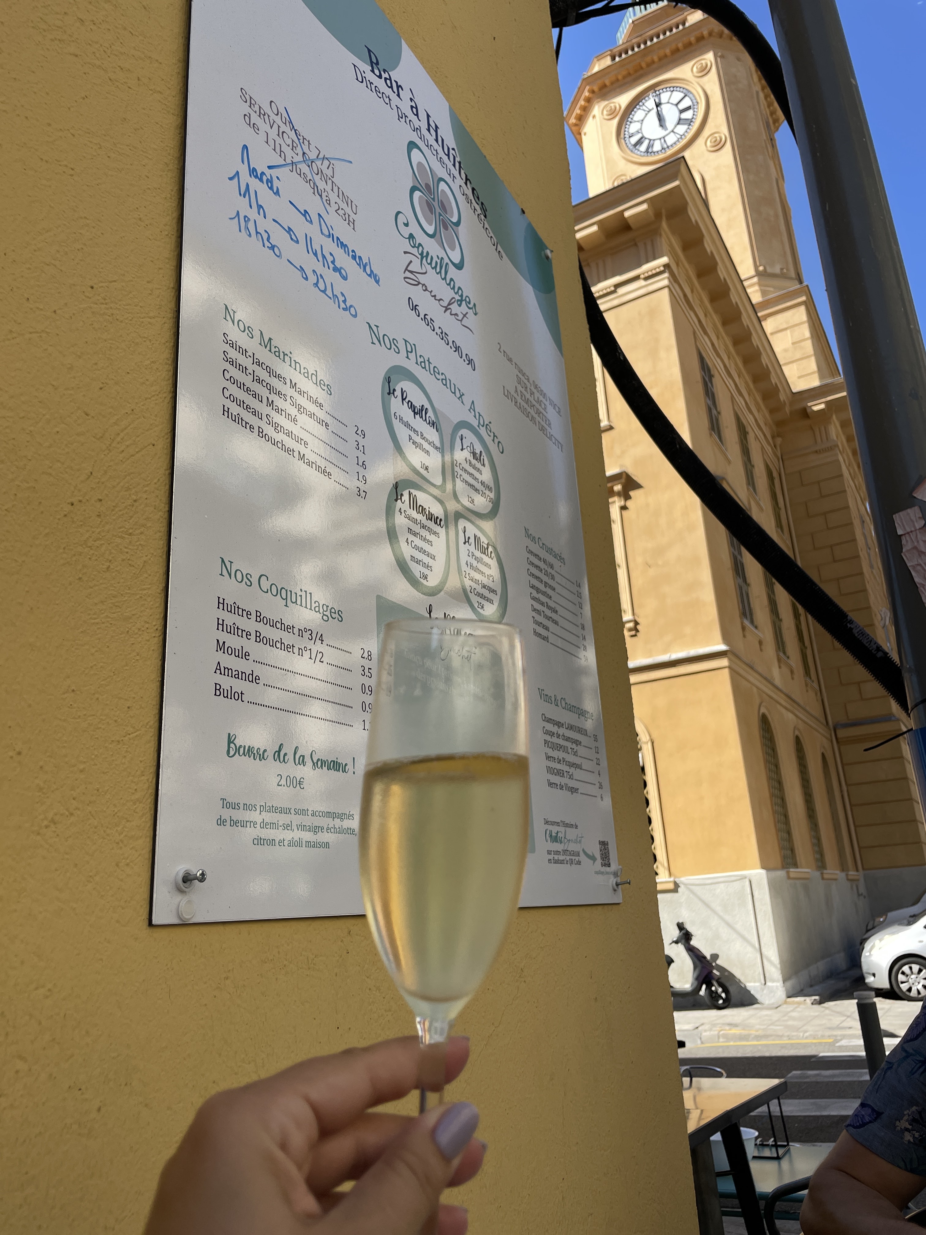 Premier soir pour apparemment l’ouverture, je cherchais un restaurant à Nice pour faire un vrai apéritif dînatoire avec mes beaux-parents. Je voulais que ce soit bon et qu’ils soient marqués, j’ai donc choisi de prendre un plateau de fruits de mer. J’ai cherché et je ne trouvais rien de disponible et de surtout bon et j’ai donc essayé ce soir les coquillages Bouchet et je peux vous dire que je sais ce que je prends la prochaine fois que les beaux-parents viennent ! (Je tiens à féliciter Nicolas et Hugo les deux fondateurs de ce beau projet pour leur accueil et le conseil sur la composition de mon plateau)