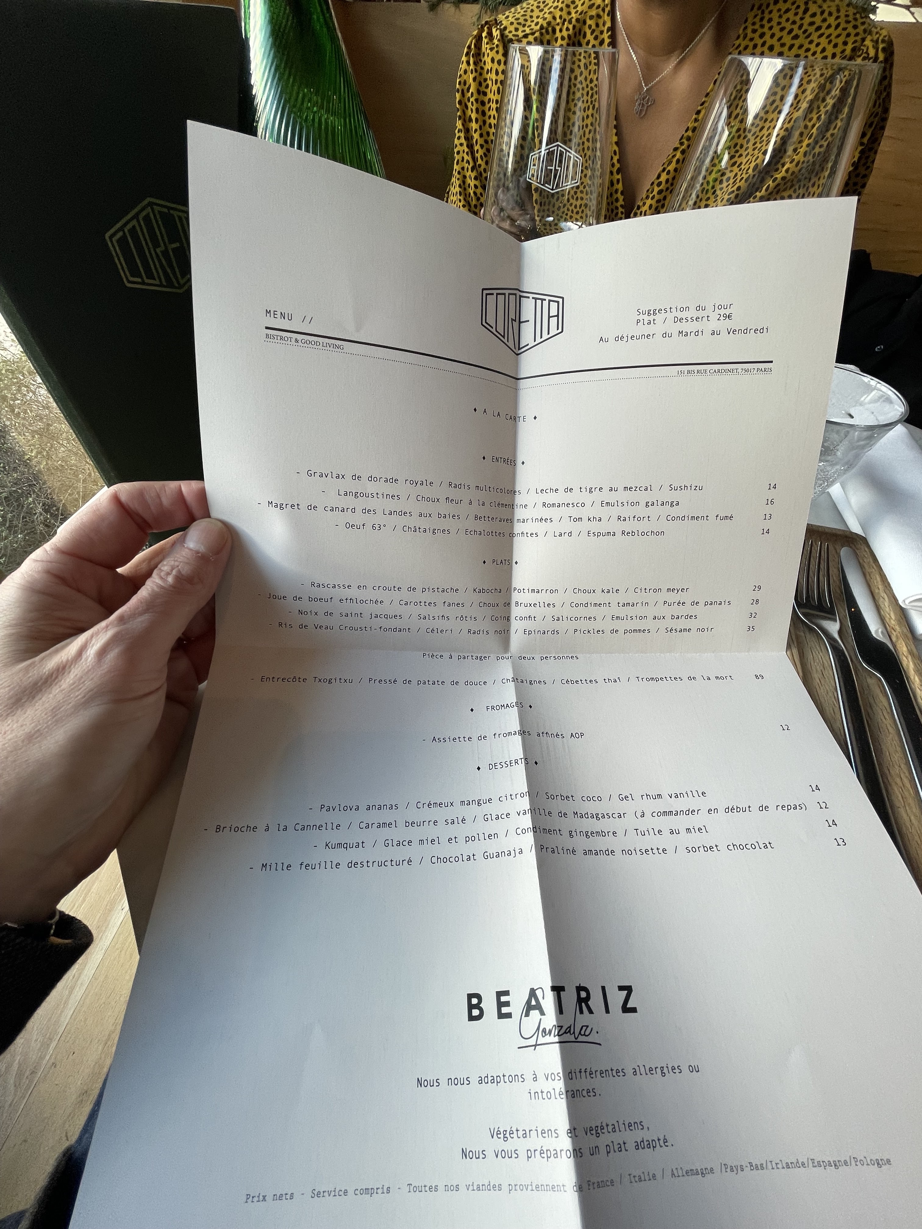 On a passé un excellent moment chez Coretta! Le repas était vraiment très bon, de l’entrée jusqu’au dessert. Mention spéciale au tartare de saint Jacques et à la mousse au chocolat avec sa tuile au miel ultra régressive : un régal ! Vin très bon, et pour couronner le tout un service parfait. On reviendra !! Merci !