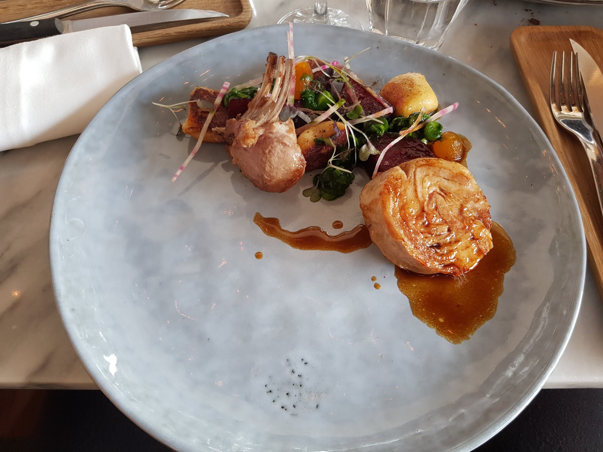 la nourriture était incroyable. J'ai eu le premier plat de raviolis et le plat principal du carré d'agneau. si vous avez faim, prenez l'agneau et la brioche en postre. la saveur était incroyable.