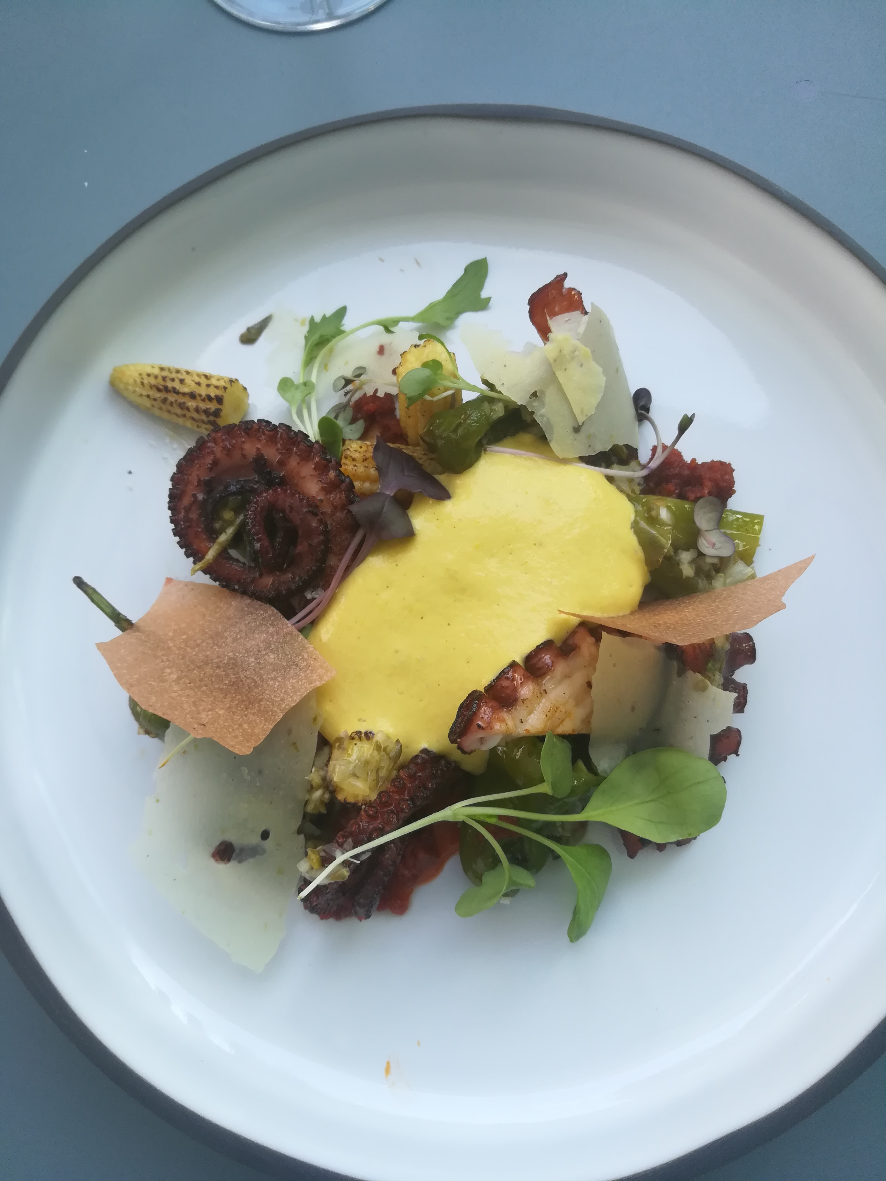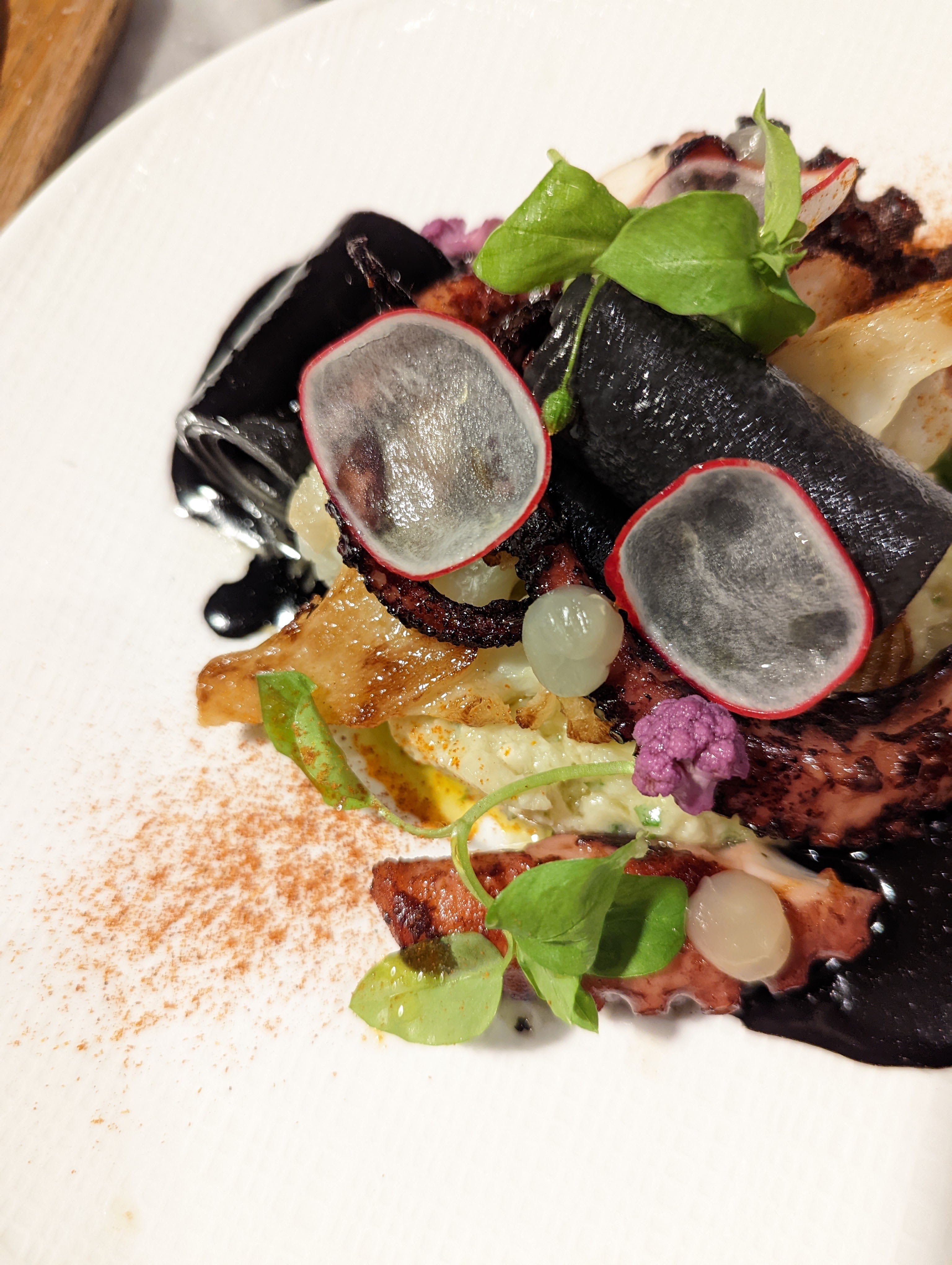 En entrée, la poulpe très très bonne, cuisson parfait, sauce délicieux. En plat, le cabillaud demi-sel, cuisson parfait, avec les concombres cuits d'inspiration chinoise + une sauce vraiment délicieuse mais il manquait une touche en plus à mon goût. Mes convives ont apprécié le veau dans tous ses états.