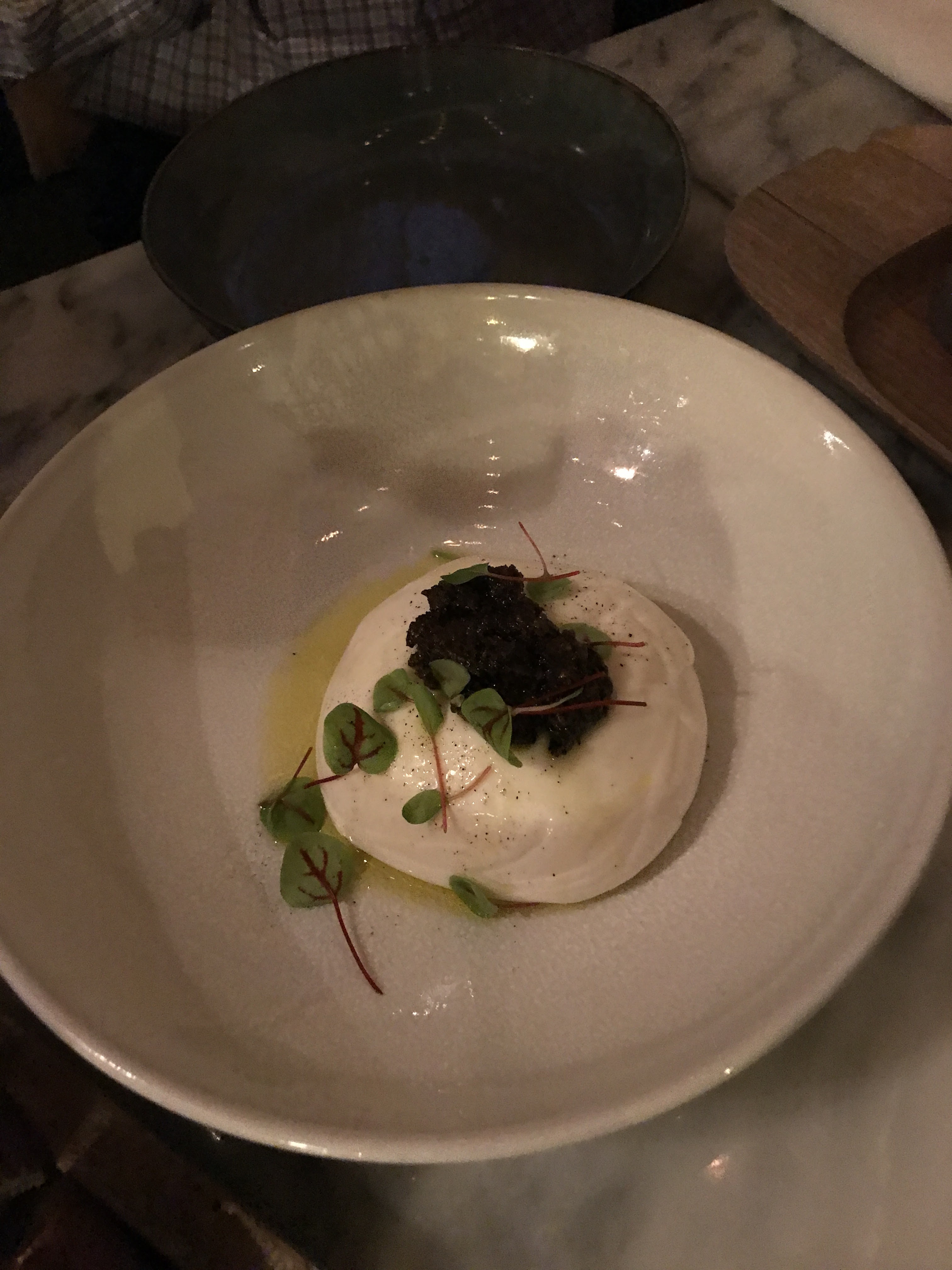 J'ai dégusté un délicieux menu de déjeuner avec mon filleul dans son joyau local préféré à Paris 17e 😋 A seulement 17 ans, il connaît déjà les meilleurs spots ! - Bruschetta au pain de campagne / Stracciatella / Sardines fumées / Noisettes / Combava (sorte d'agrume) - Carré de porc ibérique / Haricots verts / Saindoux Colonnata / Cerises / Jus de viande - Truite grillée / chou-fleur multicolore - Dessert déconstruit Forêt-Noire avec sorbet cerise Le menu du déjeuner comprend le plat principal et le dessert du jour et coûte 32 euros. On dirait qu'ils adorent les bleuets dans ce restaurant ! Chef : c’est un peu répétitif.