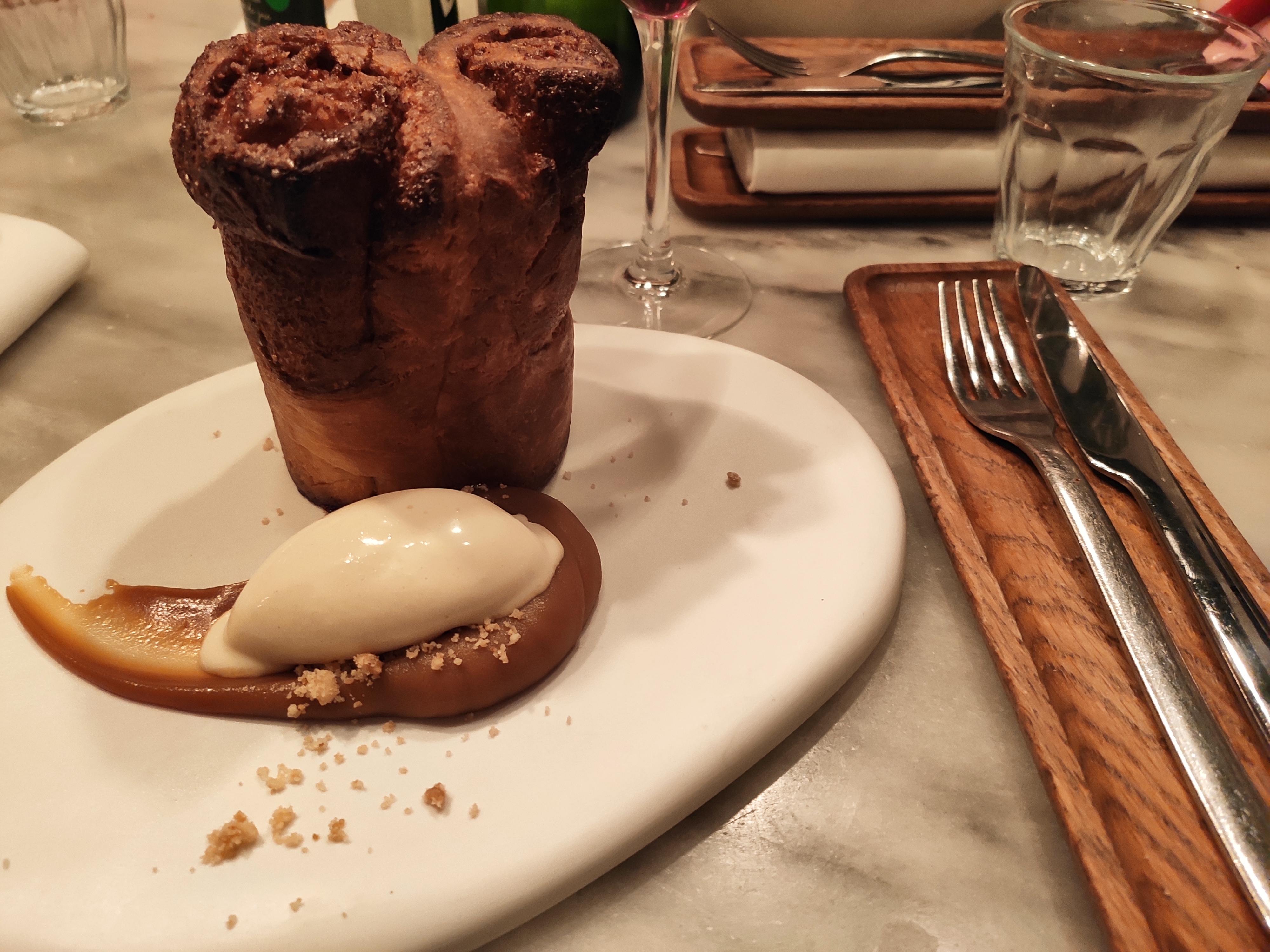 Lieu très charmant, serveurs aux petits soins, cuisine recherchée. J'ai goûté en entrée l'artichaut, en plat le faux filet au risotto d'épeautre (une delice!) et en dessert la brioche à la cannelle et caramel beurre salé! Tout délicieux! La vue de la pointe de la tour Eiffel visible à l'étage rajoute un petit plus!