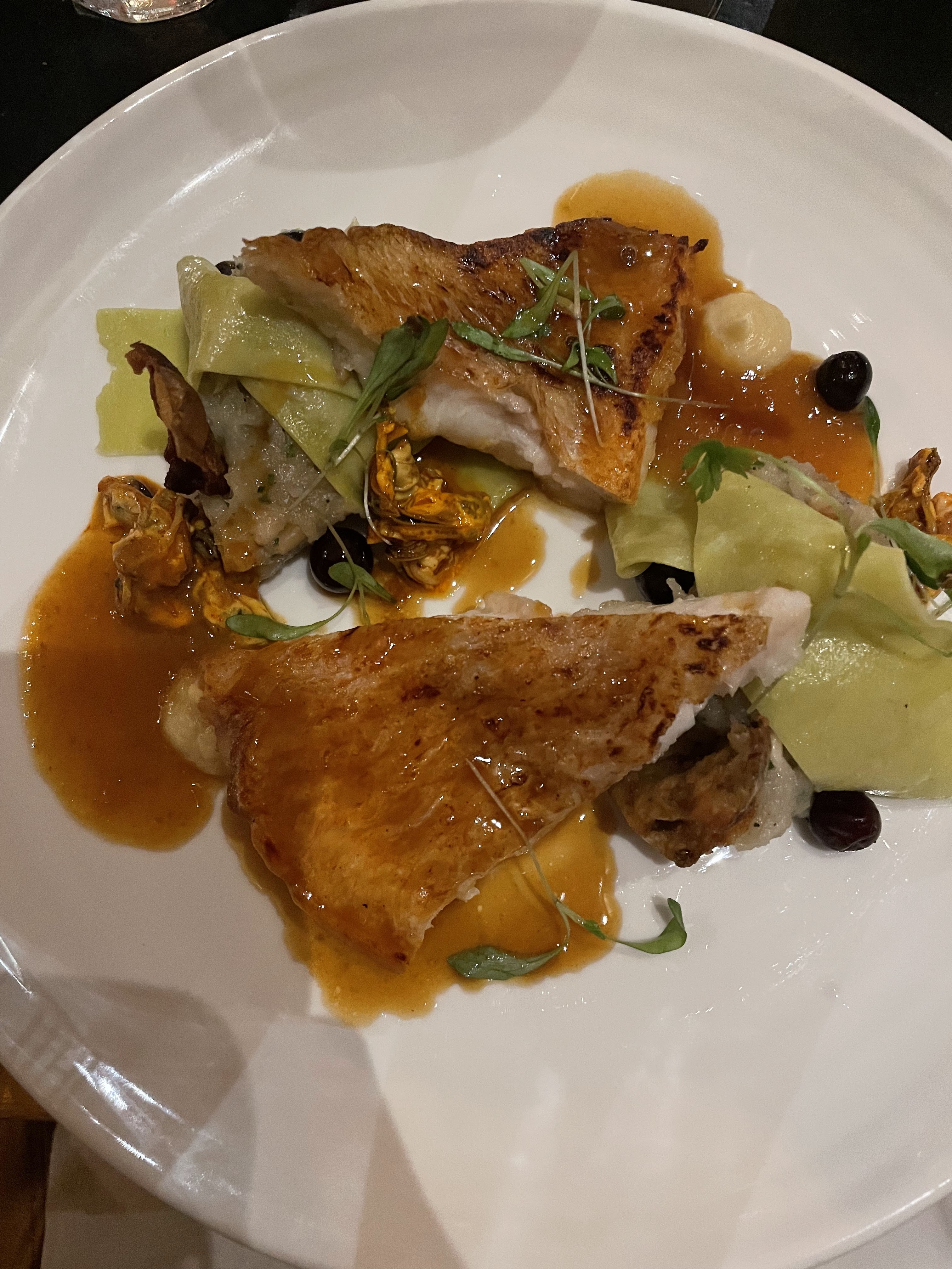 Excellents produits. La sandre était tendre et la fusion avec la sauce et fruits exotiques très bonne, le dessert aussi parfait. Notre serveur était un peu prétentieux et discourtois mais les autres serveurs au top pour l'attention des tables.
