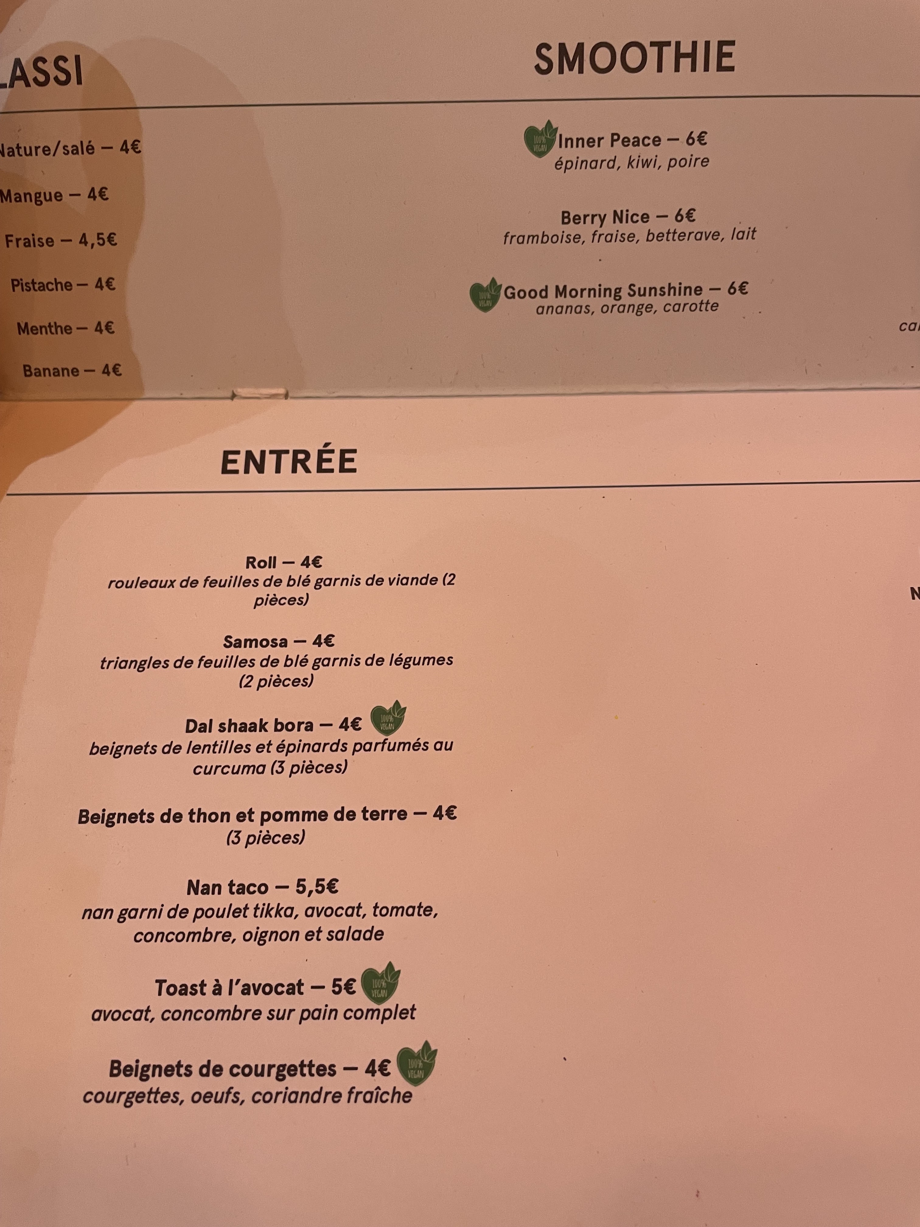 Tout d'abord, bonne initiative de labelliser les plats végans ! Le curry d'aubergines est très bon. Le burger aux naans est trop cher pour ce que c'est ; pour 10 €, il devrait au moins y avoir des frites ou des pommes de terre sautées en accompagnement. Les smoothies sont bons, mais dans le mien, il y avait beaucoup trop de mousse, ce qui est un peu relou quand ça coûte 6 €.