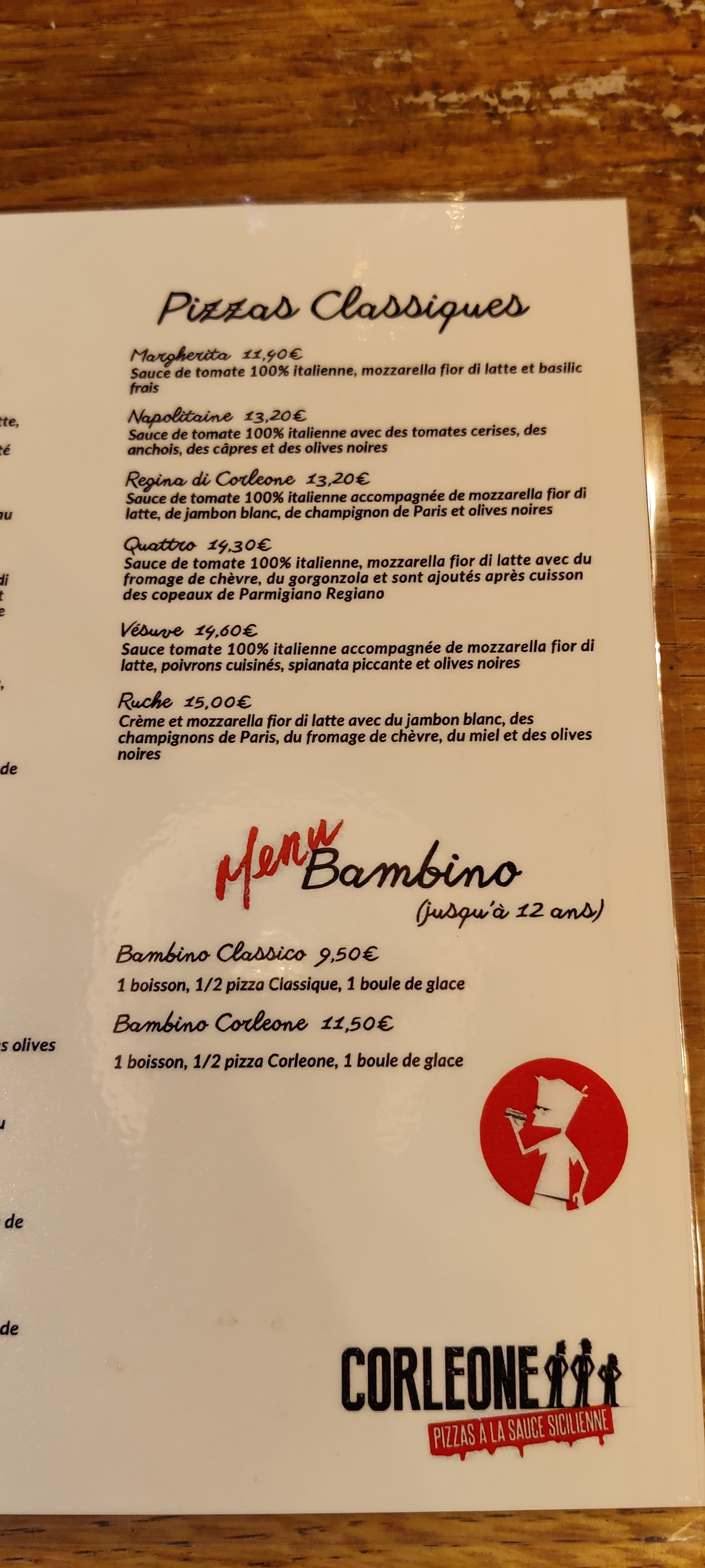 nous adorons venir au Corleone entre les pizza qui sont tous simplement excellentes bien garnies et une vrai pâte à pizza et le personnels toujours agréable le sourire aux lèvres et les serveuses qui prennent le temps de jouer avec nos filles hors que la salle et pleine et un grand simple merci pour votre professionnalisme