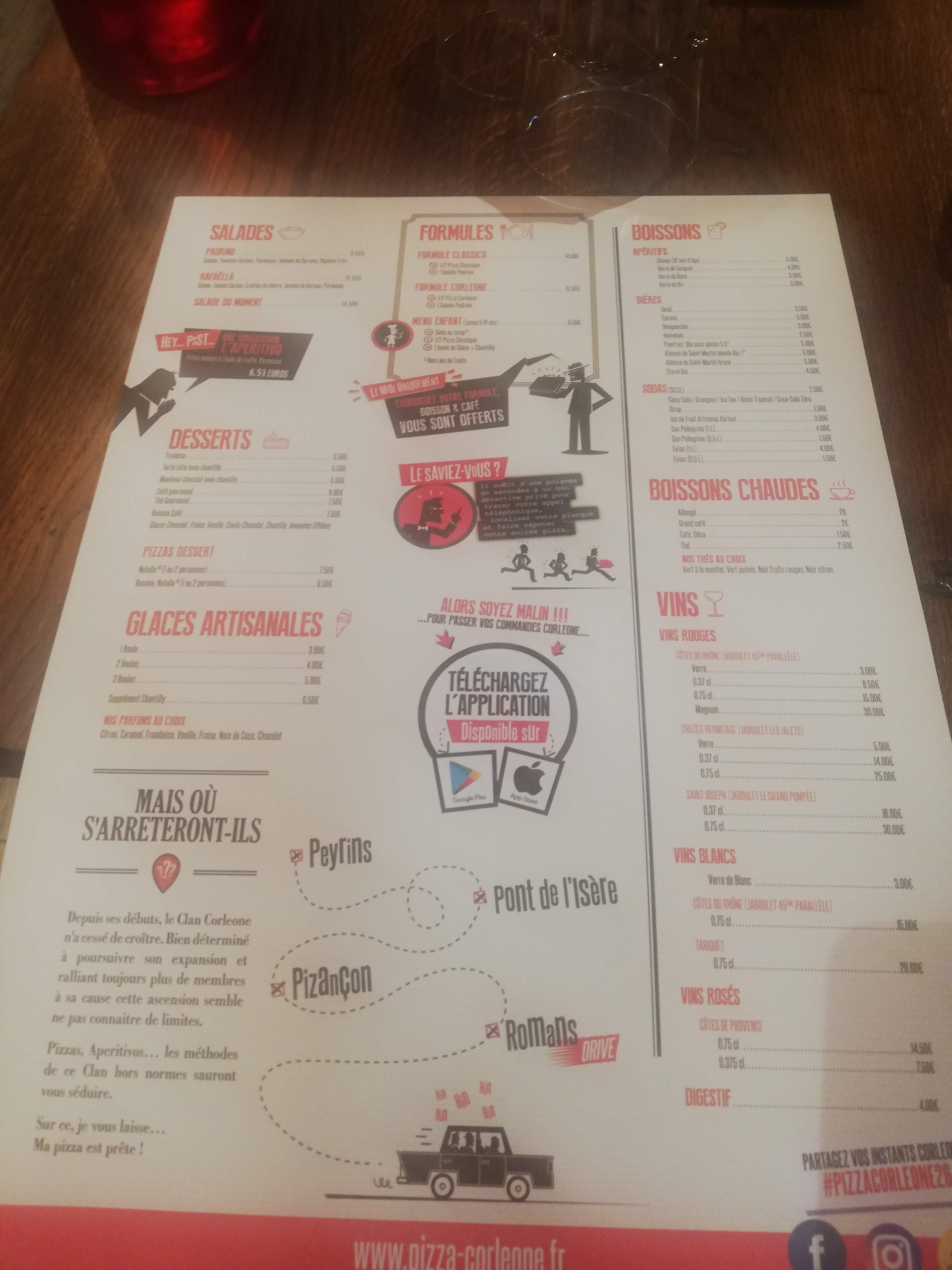 nous sommes des habitues de corleone pont de l isere, aujourd hui tres deçus de nos pizzas. il y manquait beaucoup de sauce tomates ,la pate n etait pas fraiche et ayant pris une etna il y manquait aussi de la merguez, dommage car d habitude on adore mais la vraiment pas terrible