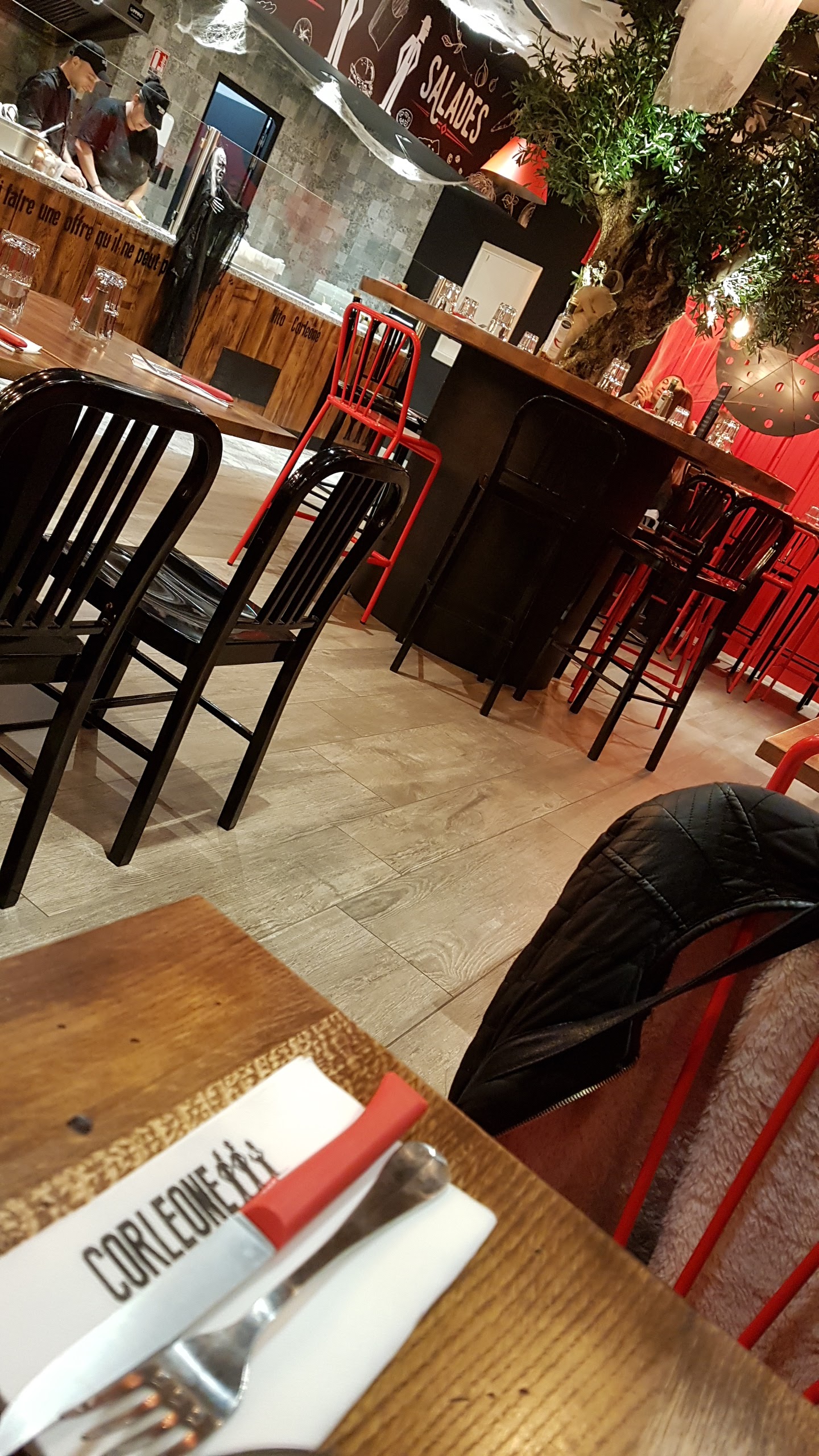 Les pizzas sont plutôt bonnes et généreuses. Mais pas au feu de bois. Le concept de fabrication derrière une vitre est sympa mais à double tranchant : en effet le client voit « tout ». Donc, quand un jeune pizzaiolle touche le couvercle de la poubelle blanche située derrière lui (qui pourtant s’ouvre avec le pied) puis remet directement les mains dans la pâte, niveau hygiène c’est plutôt limite... Attention aussi ce n’est pas un resto italien : ne vous attendez pas à trouver des pâtes au menu. Nous y avons mangé un dimanche soir, ambiance très familiale, salle pas du tout cosy, on est plus proche de l’ambiance fast-food que du charme romantique à l’italienne. En même temps, Don Corleone n'était pas là pour rigoler...