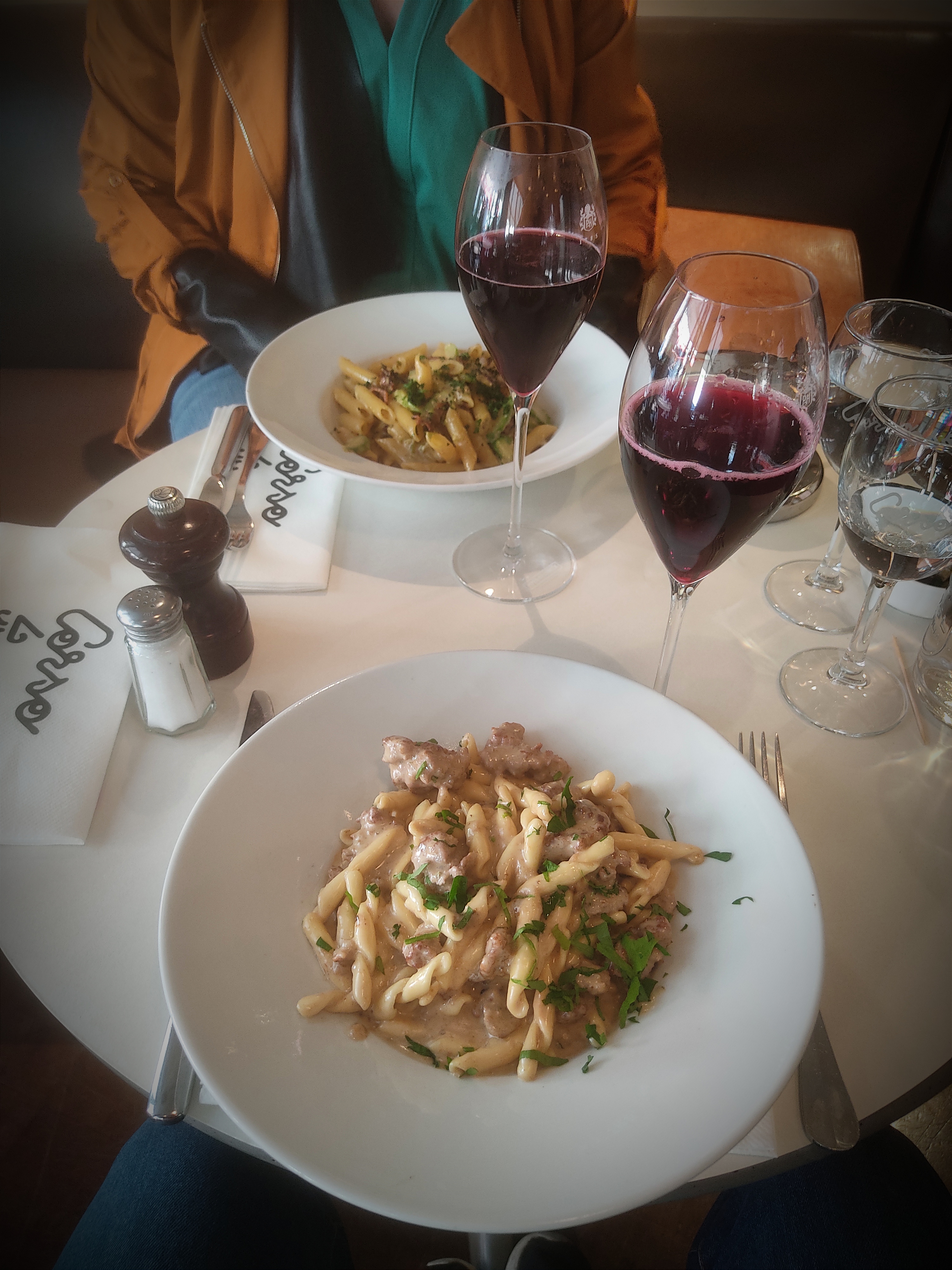 Les penne boscaiola sont excellentes ! En revanche, le gâteau au chocolat et amande est immangeable : la bouteille de sirop d’amande avait due être renversée dans mon plat…