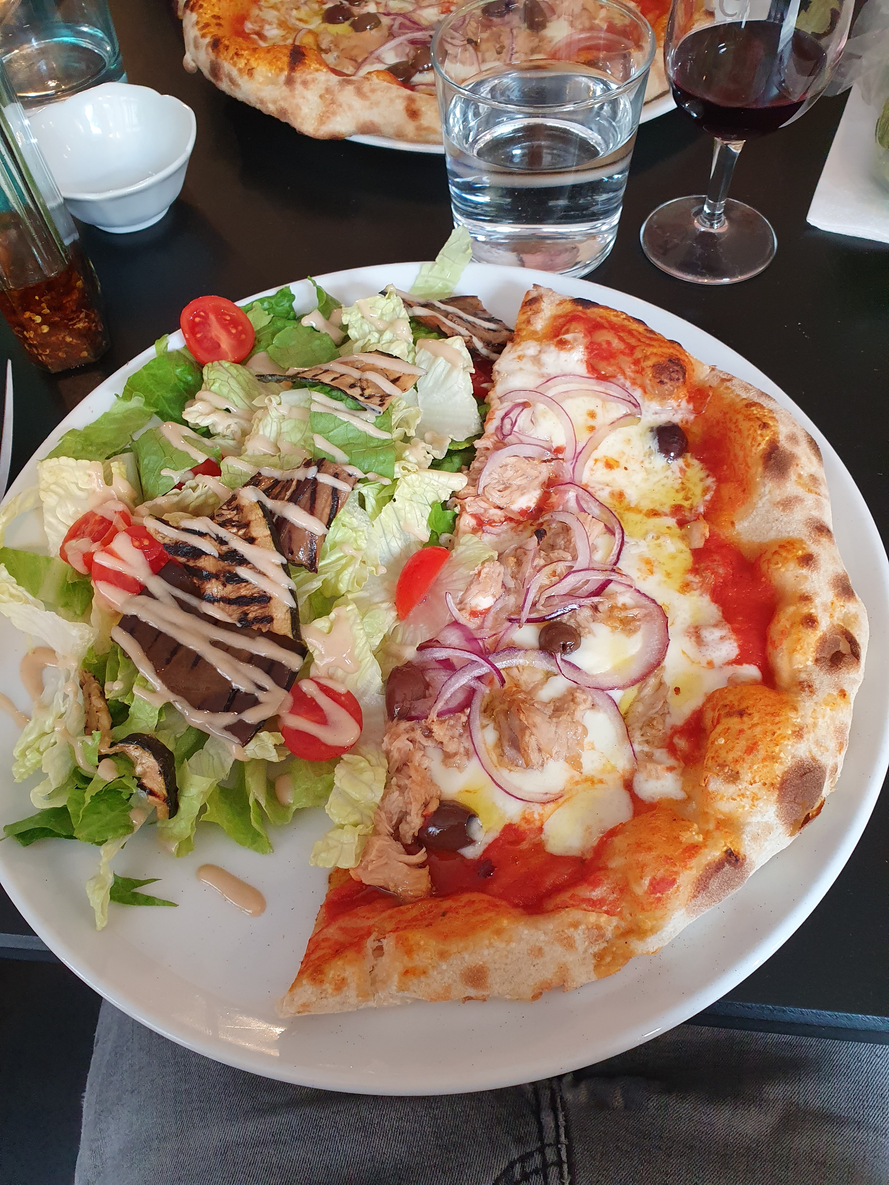 Bonne pizzeria. La possibilité de pouvoir prendre une demi pizza avec salade est très appréciable. La pizza au thon est très bonne. Ambiance du restaurant sympathique. Vin au verre moyen.