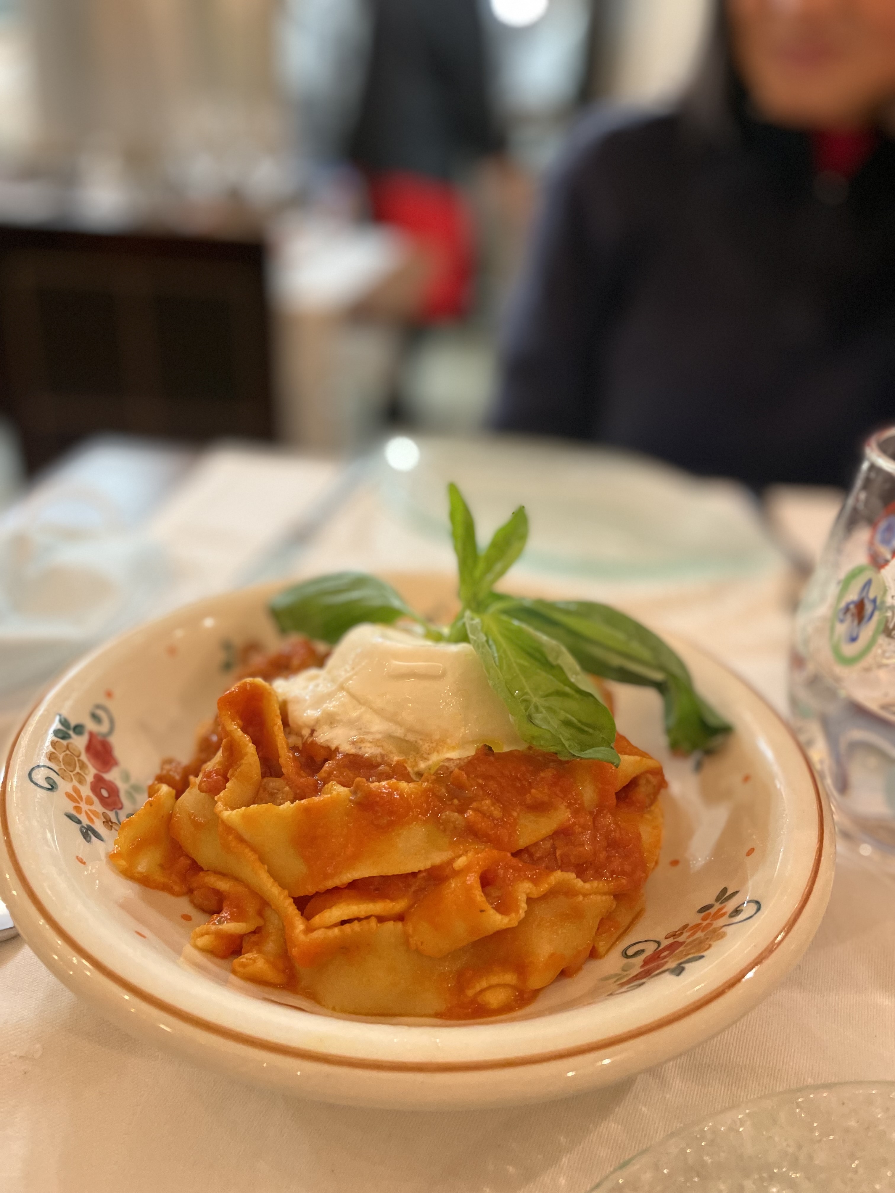 Les portions sont un peu plus petites mais la nourriture est délicieuse. Je recommande de faire un style familial car nous avons pu essayer une tonne de plats différents. Nous avons eu le veau frit avec des pommes de terre (incroyables et croustillantes), des nouilles pappardelle à la sauce bolognaise (toutes deux illustrées ci-dessous et très savoureuses). Nous avons également commandé du poisson, des raviolis et des tagliatelles crémeuses. Tout était tellement délicieux et nous avons tout mangé. La nourriture est sortie rapidement aussi, ce qui était génial car nous avions faim.