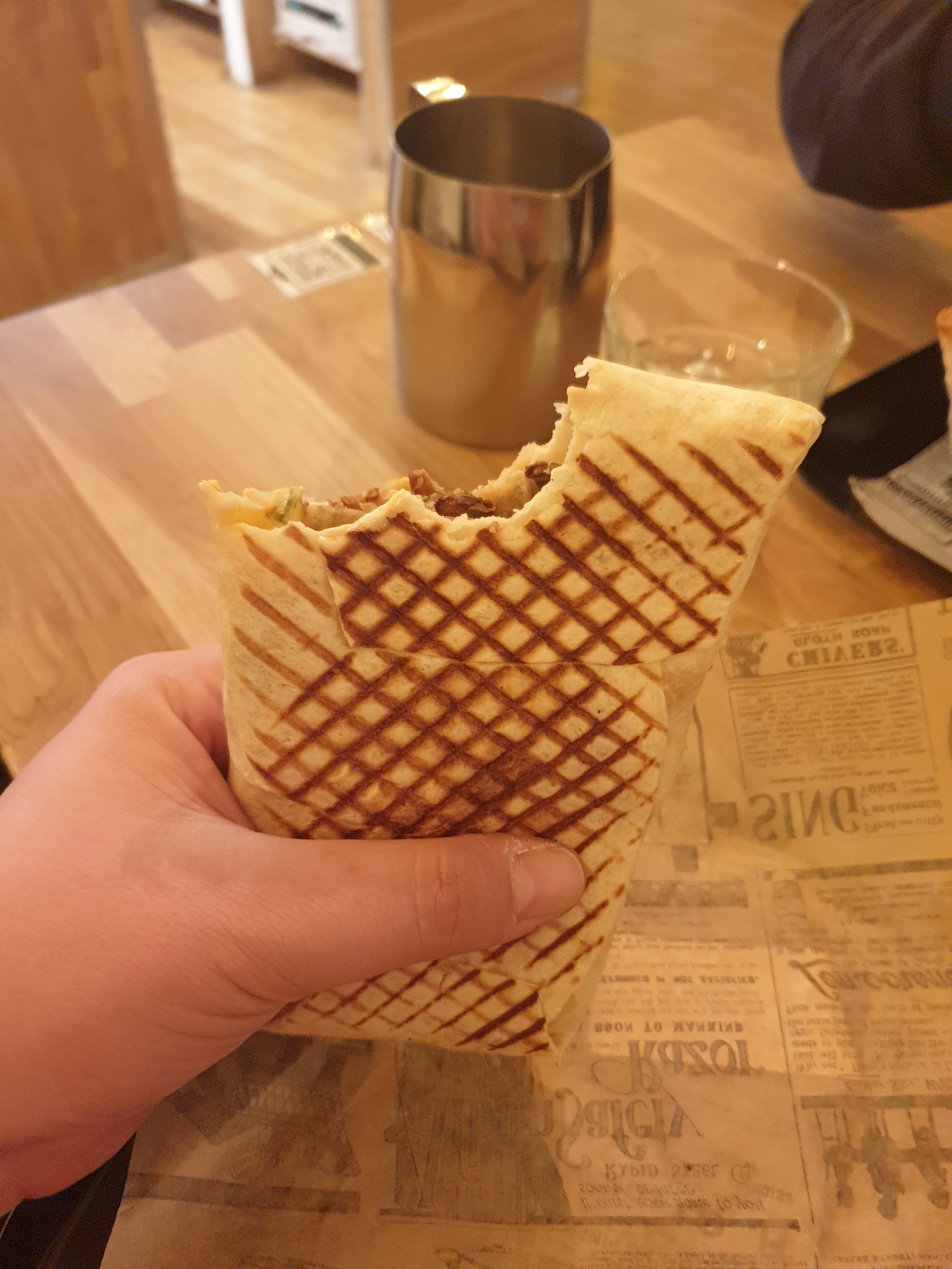 Nous avons mangé sur place avant d'aller assister à notre séance de cinéma. Si les plats n'étaient pas mauvais, j'ai trouvé qu'il n'y avait pas assez de saumon dans le wrap. Ou, plus précisément, il y a tellement de crudités qu'on ne sent absolument pas le saumon. Cela étant, j'ai beaucoup moins appréciés les collègues qui arrivent et qui se comportent comme à la maison sans se soucier des clients présents. Que les équipes s'entendent bien tant mieux. Cependant, il y a des comportements à éviter devant des clients.