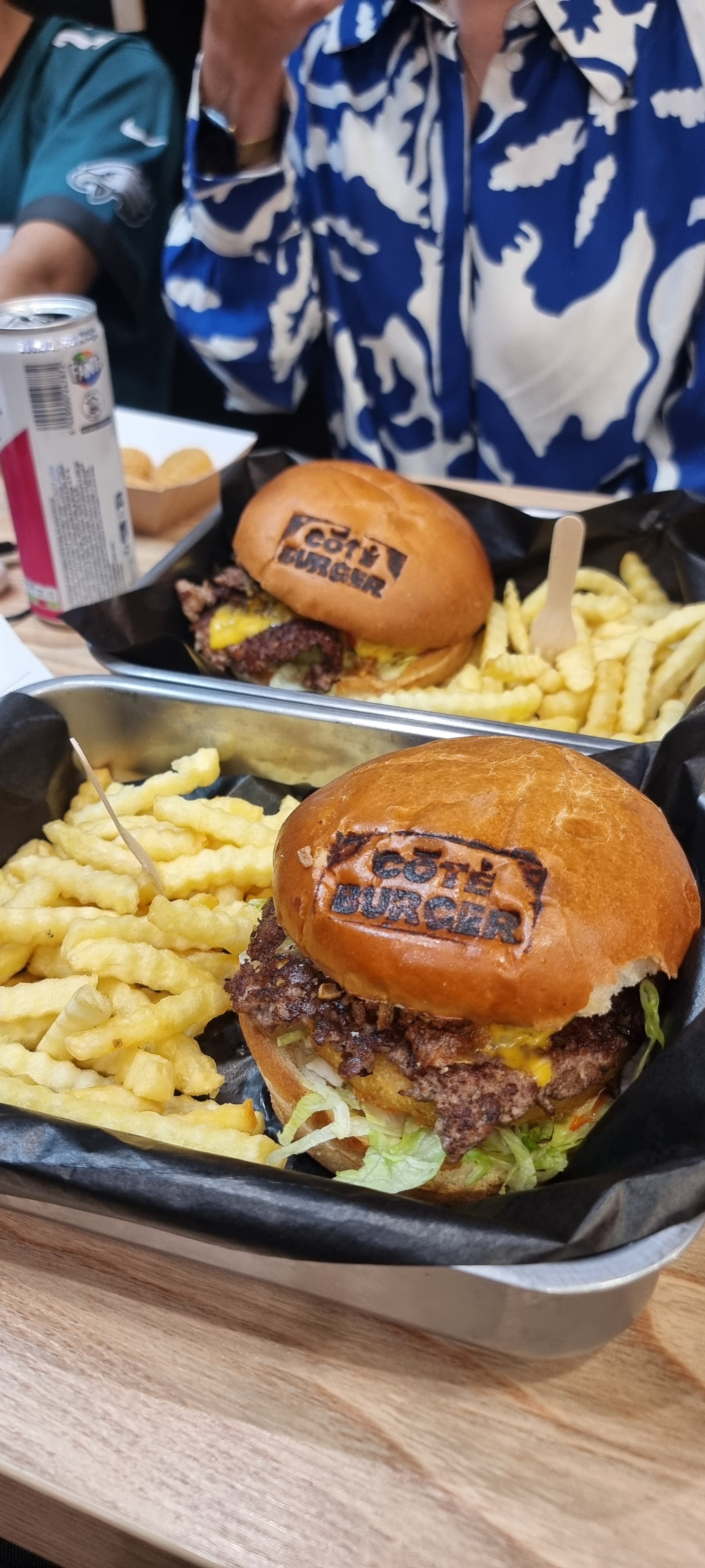 Je suis allé à Côté burger le lundi 26 février 2024 pour tester ce resto qui se situe au centre-ville de Nice. Pour le déjeuner, j'ai commandé un smash burger 🍔 Sweet en menu avec des frites ondulées 🍟 et une canette de Fuze Tea à la pêche 🍑. Et avec ce menu, j'ai pris des pinces de crabe 🦀. Les plats ont été délicieux et ce smash burger 🍔 est le meilleur que j'ai mangé. Le steak est frais et il y en a une bonne quantité comparé à d'autres fast-foods. Le smash burger 🍔 est à la fois exquis et beau avec le nom du resto gravé sur le pain. En plus, le personnel a été sympathique et serviable. C'est pour ces raisons que je mets 5 étoiles ! ⭐⭐⭐⭐⭐