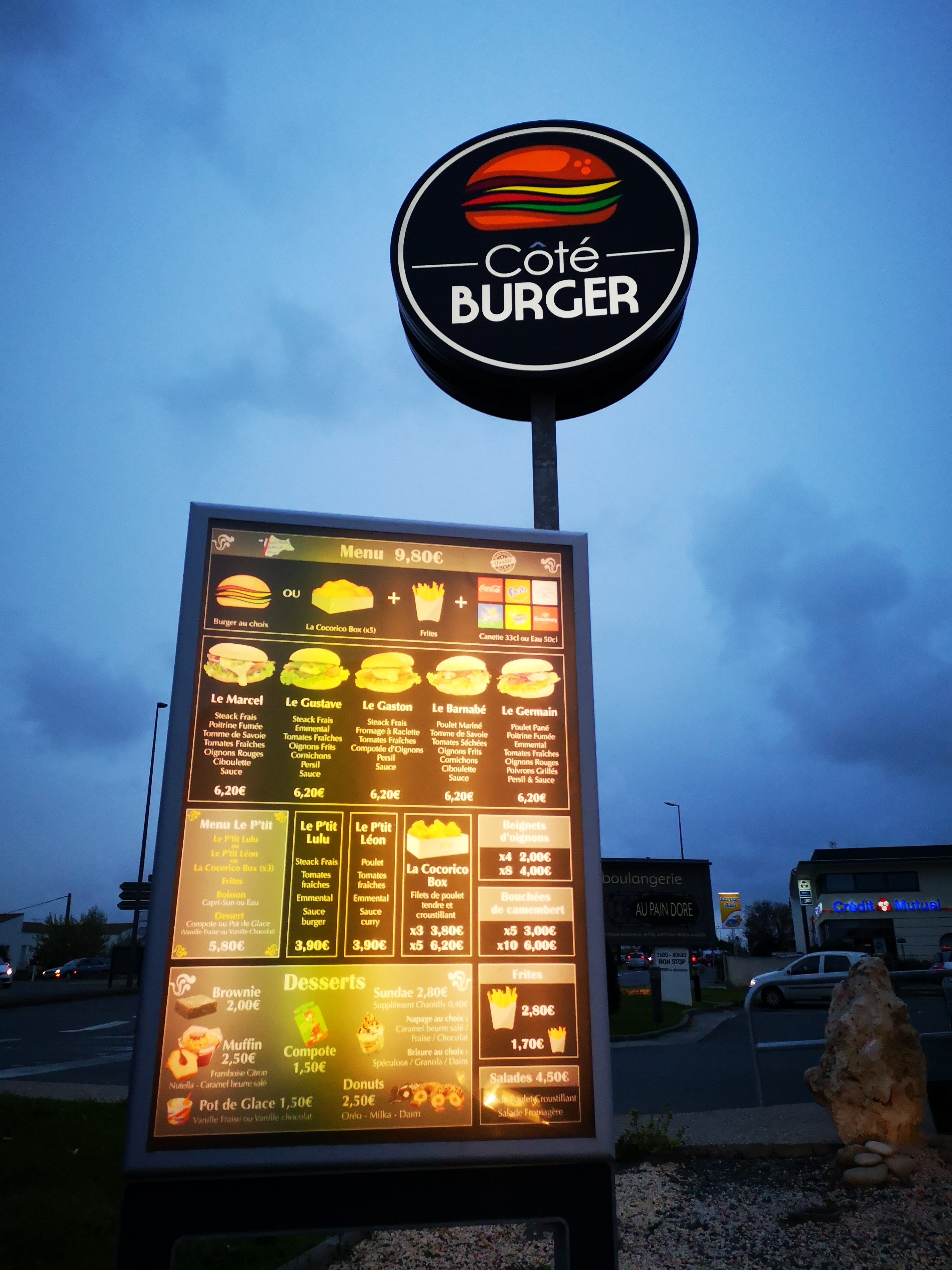 Facile d'accès avec parking devant l'entrée. Les burgers sont fabriqués à la demande. Ils sont excellents, comme tout ce qui est proposé. Personnel accueillant. Tarifs corrects pour des produits de bonne qualité. Seul bémol, l'endroit est petit. Pour manger à l'intérieur cest assez compliqué, difficile de s'asseoir pour déguster. Possibilité de drive. Pour les amateurs de bons burgers variés, frites ou autres choses gourmandes, vous pouvez vous y rendre sans craintes . Souhaitons que cela ne change pas !! Et voilà, le temps passe, par contre, chez Côté Burger, rien ne change. C'est bon, c'est bon. Non, c'est très bon. Et en plus, ils sont polis et sympas. Changement dans la continuité ! Bravo ! Souhaitons que cela continue. Merci.