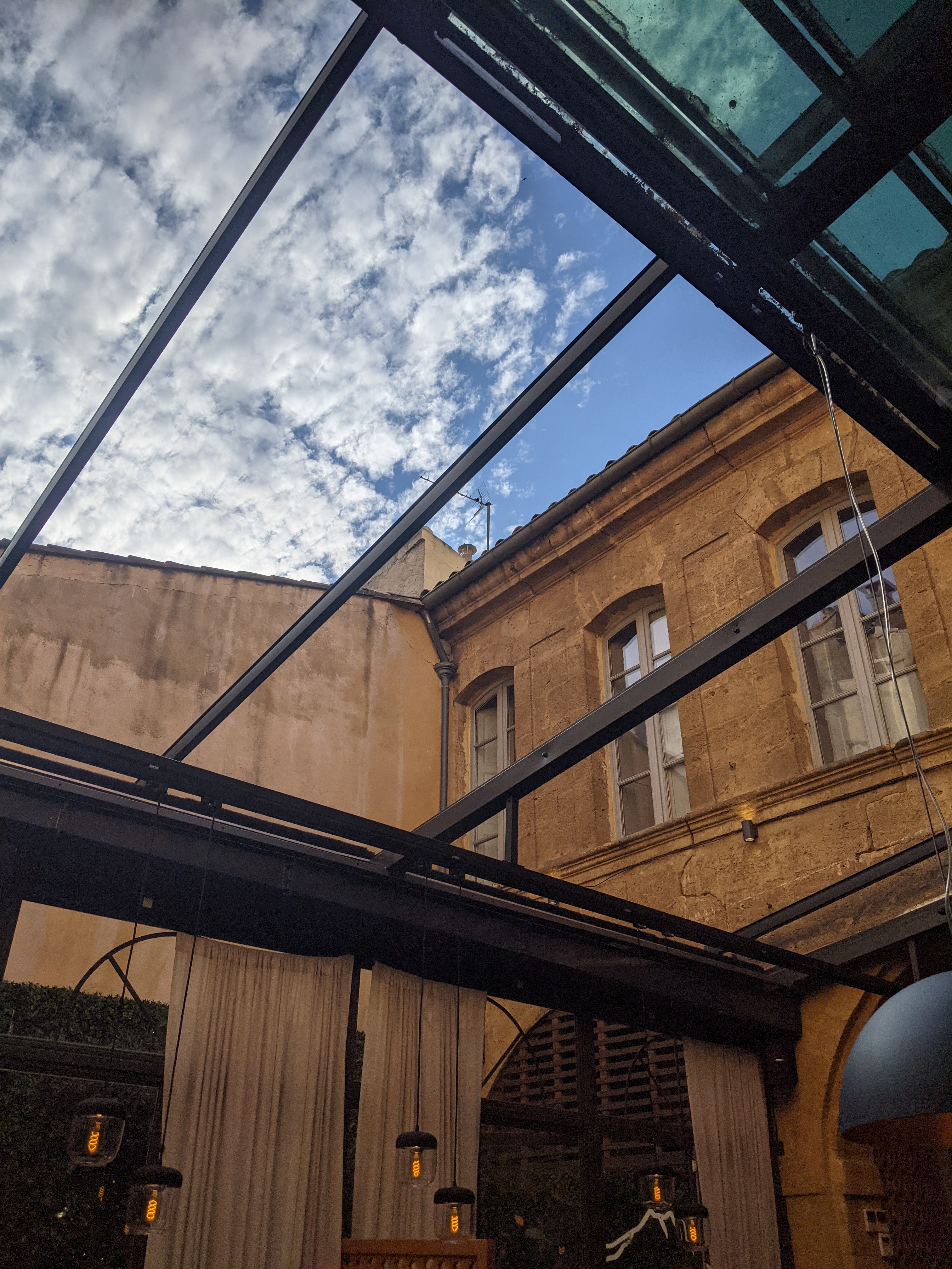 Très bon restaurant. Le cadre, une cour d'hôtel privé, est particulièrement agréable, intimiste, moderne, vert et à l'abris du vent. Un petit écrin calme et classe au coeur d'Aix. Les cuissons sont maitrisées, notamment le pigeon Wellington superbement fondant. Les plats sont très bons sans être renversants, une cuisine en finesse qui plaira au plus grand nombre. En revanche le dessert à su se démarquer avec le mariage de l'aloé vera, de la framboise et du citron vert en pavlova, pour une touche fraiche très appréciable. De même pour le petit accompagnement du plat, une purée soyeuse et délicieusement assaisonnée aux herbes et à la truffe. Le service est doux, accueillant, et souriant, un plaisir !