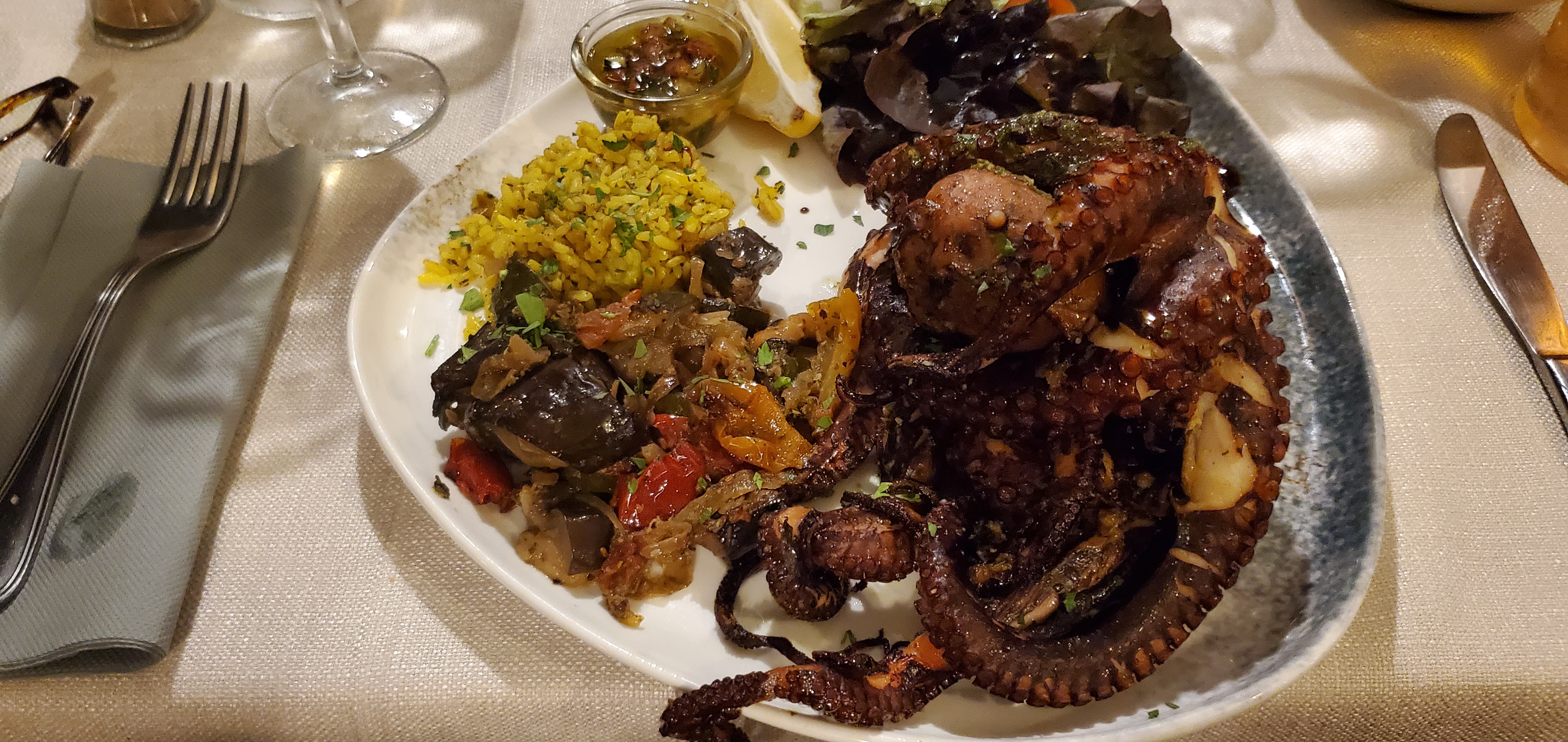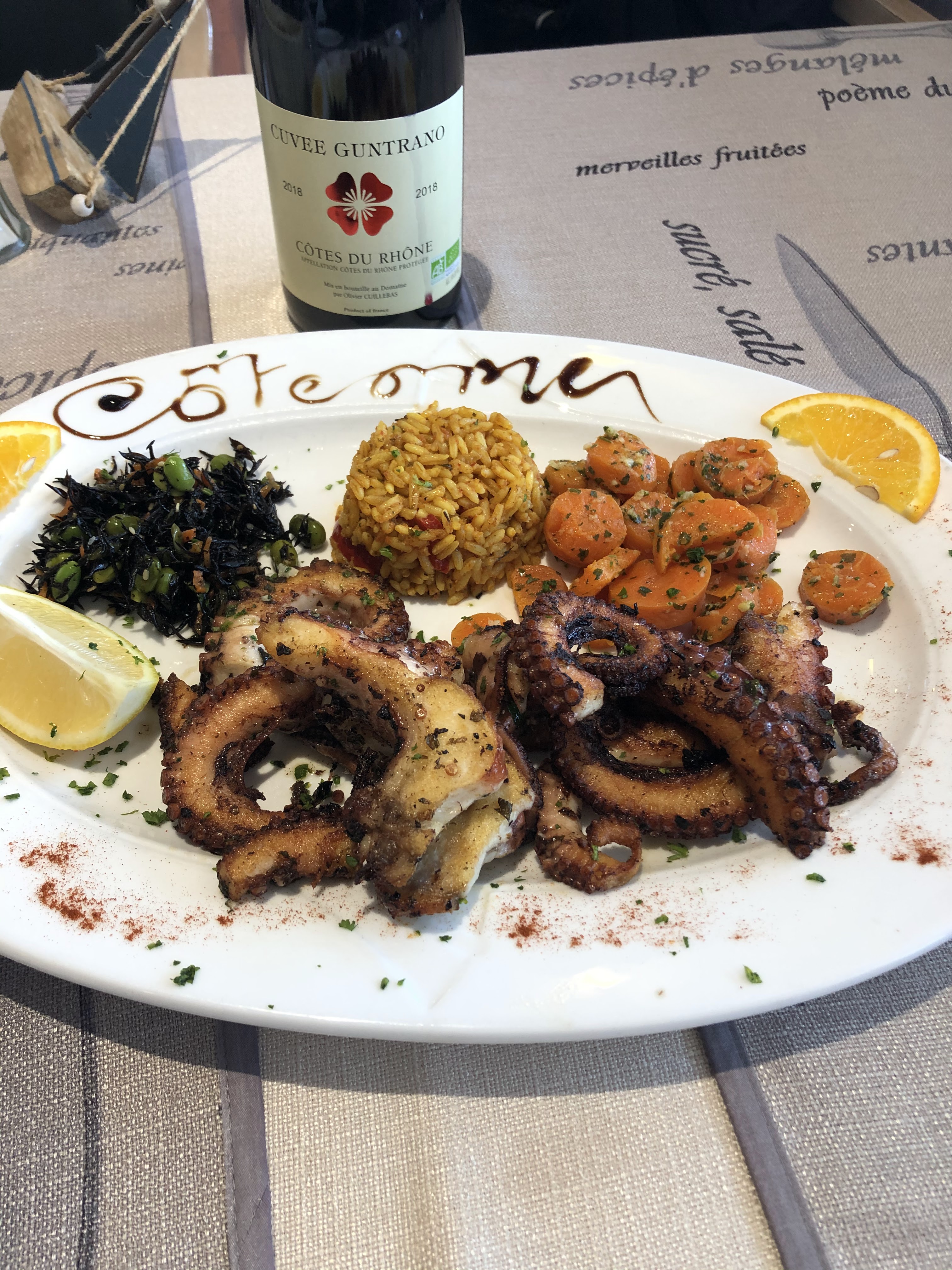 Accueil chaleureux par toute l'équipe du restaurant. Les tables sont bien espacées entre les clients. Les plats étaient très bons et copieux, notamment la daube de poulpes et les deux poissons (dorade et loup) bien frais. Les prix sont corrects. Il manquerait un peu plus de choix dans les entrées, et dommage que les bulots soient indiqués 'surgelés' Niveau musique, du Céline Dion pendant tout le repas, ça fait beaucoup !