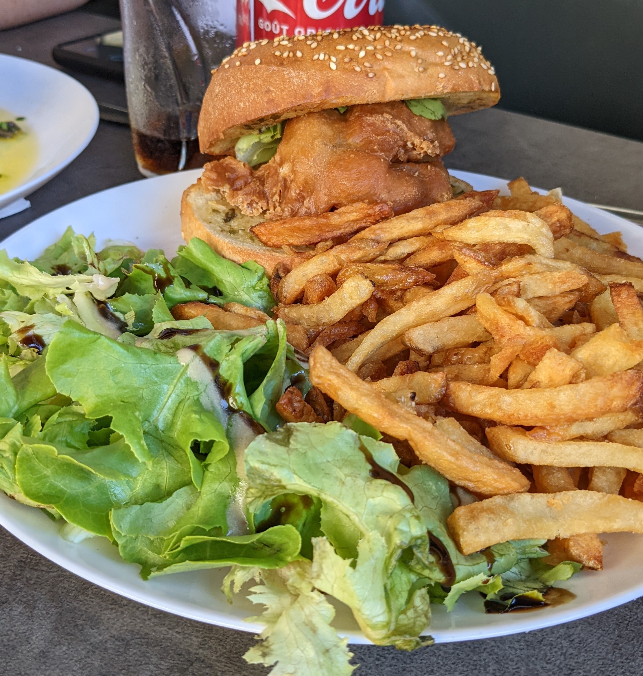 Serveuse au top. Bonne ambiance et belle vue. Pour le plat : j'ai pris burger au poisson (dorade) / salade et frites maison. Ce fut très moyen : pain trop cuit, trop de sauce dans le burger, dorade qui semble être surgelé au vue de la forme et des formes régulières d'herbes à l'intérieur. Ca mérite donc cette note moyenne. Je m'attendais à un filet frais de dorade au vue de l'endroit.