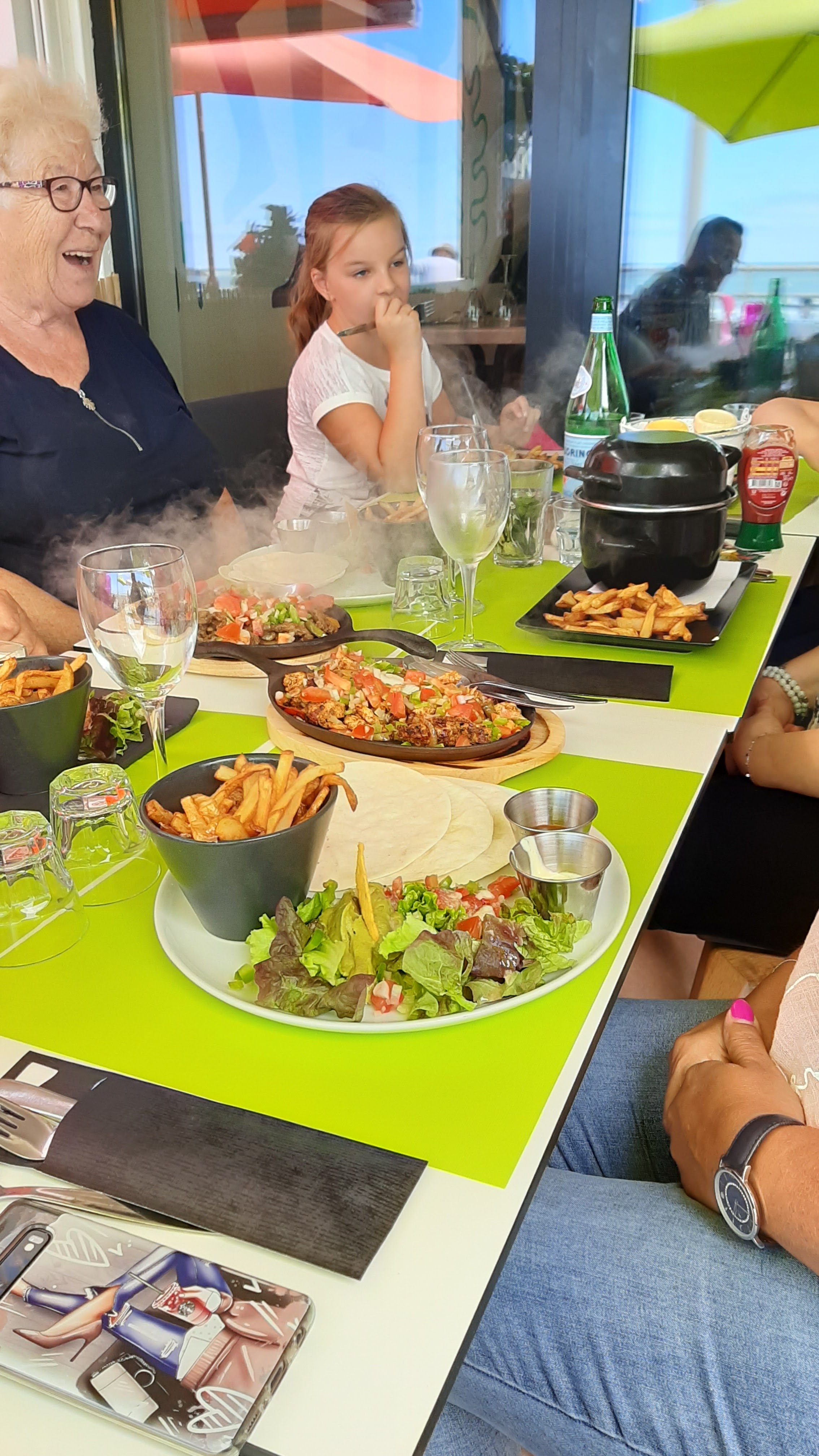 Un vrai restaurant digne de la gastronomie française ! Et c'est un ancien chef cuisinier qui vous laisse ce commentaire. Situation: terrasse au bord de l'océan avec vue imprenable sur la grande plage. Personnel très agréable et efficace. La patronne au service et son homme en cuisine. Sourire et ambiance détendue. Sur le repas, il n'y avait vraiment RIEN à contester. Tout était cuisiné maison avec des produits frais. Les moules à la crème sans sable ni crabes et avec une sauce à la vraie crème. Oignons et persil frais...et frites fraiches ! Entrecôte du boucher du coin, tendre, goûteuse et cuisson maîtrisée (si si, ca existe encore). 300gr de bohneur... Fish & Chips (dos de cabillaud) avec sauce tartare maison. Juste excellent. Fajitas de boeuf ou de poulet, présentation très réussie (je ne veux pas tout dévoiler). Viande bien épicée, garnitures et sauce appétissantes. On recommande ! Menus enfant avec de vrais hamburger a la viande hachée maison et frites fraîches. Ils ont vidé leurs assiettes...sans commentaire. Desserts : la tarte meringuée de Céline ;) pas trop sucrée et le biscuit sablé craquant...une vraie reussite. Chocolat liégeois avec de la bonne glace qui a le goût du chocolat. La brioche perdue. Les souvenirs de l'enfance ressurgissent. C'est vraiment bon. Café et petit digestif pour finir ce bon moment passé en famille. Les portions sont très correctes. On a vu passer de chouettes assiettes pour d'autres tables ainsi que de belles pizzas (énormes) qui donnaient envie. Tout était chaud, bien présenté. On sent bien à chaque bouchée que c'est une recette cuisinée avec des produits de qualité. On sent l'envie de faire plaisir. On sent que le bonhomme en cuisine se fait plaisir ! Merci Monsieur. Bonne continuation à vous. Nous reviendrons dès que possible vous voir. Des lorrains ravis avec la peau du ventre bien tendue