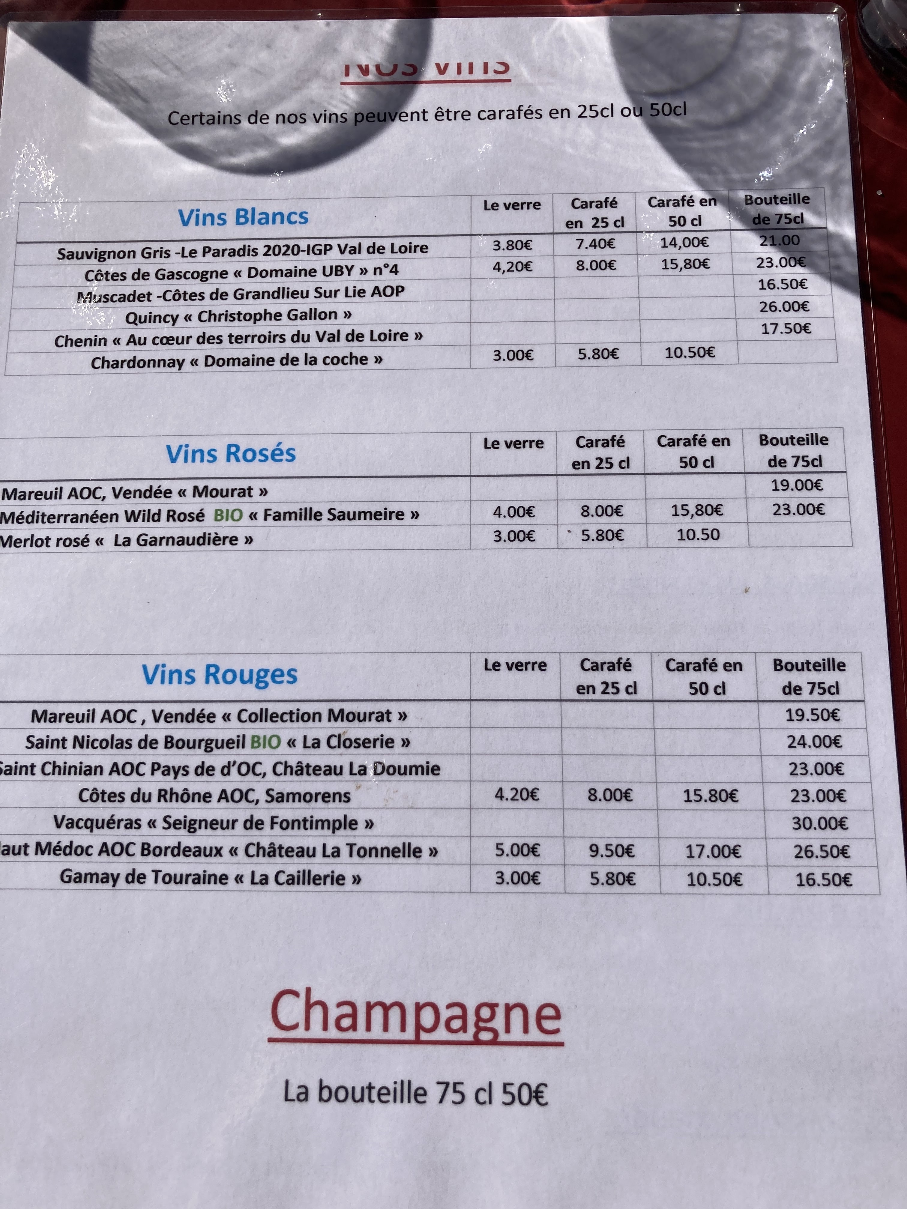 Supplément frites proposé par le serveur et ajouté sans annoncer le prix de.. 4€ !! A 2 doigts de râler quand on demande une carafe d’eau alors qu’il fait près de 30 degrés. Sens du service à revoir… Qualité correcte mais sans plus