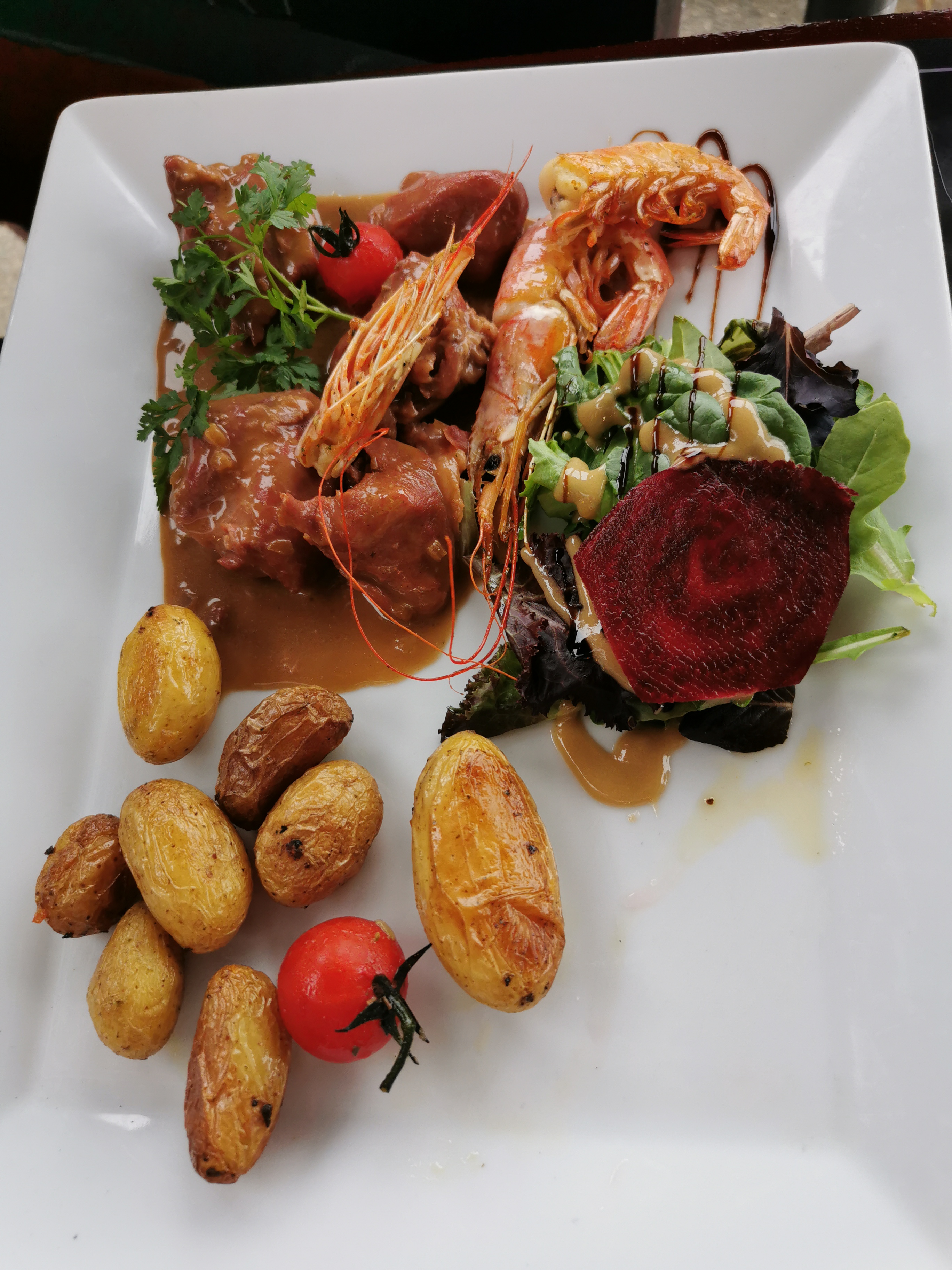 Bonjour, Nous avons découvert ce restaurant par hasard, en allant voir le port et nous avons réservé quelques jours suivant. Nous avons été bien accueillis, en terrasse. Les serveurs et serveuses sont sympathiques et le service est rythmé comme il faut. Pour les entrées, ma femme a choisi le ''camembert au chorizo'' (servi dans une cassolette) et pour ma part, j'ai choisi le ''carpaccio de boeuf'' au pesto et aux copeaux de parmesan. Nous avons été satisfaits. Pour les plats, ma femme a choisi ''moules marinières et pour ma part, j'ai choisi la spécialité maison, à savoir : la joue de porc aux gambas. Le ''fondant de porc aux gambas'' est une découverte vraiment intéressante, car l'association des deux est vraiment savoureuse. La portion est plutôt correcte, mais j'aurais aimé avoir plus de joue de porc quand-même.. Concernant les ''moules marinières'', il faudrait peut-être songer à les présenter de manière classique (en marmite), afin de les garder dans leur jus de cuisson et ainsi pouvoir préserver leur bonne température.