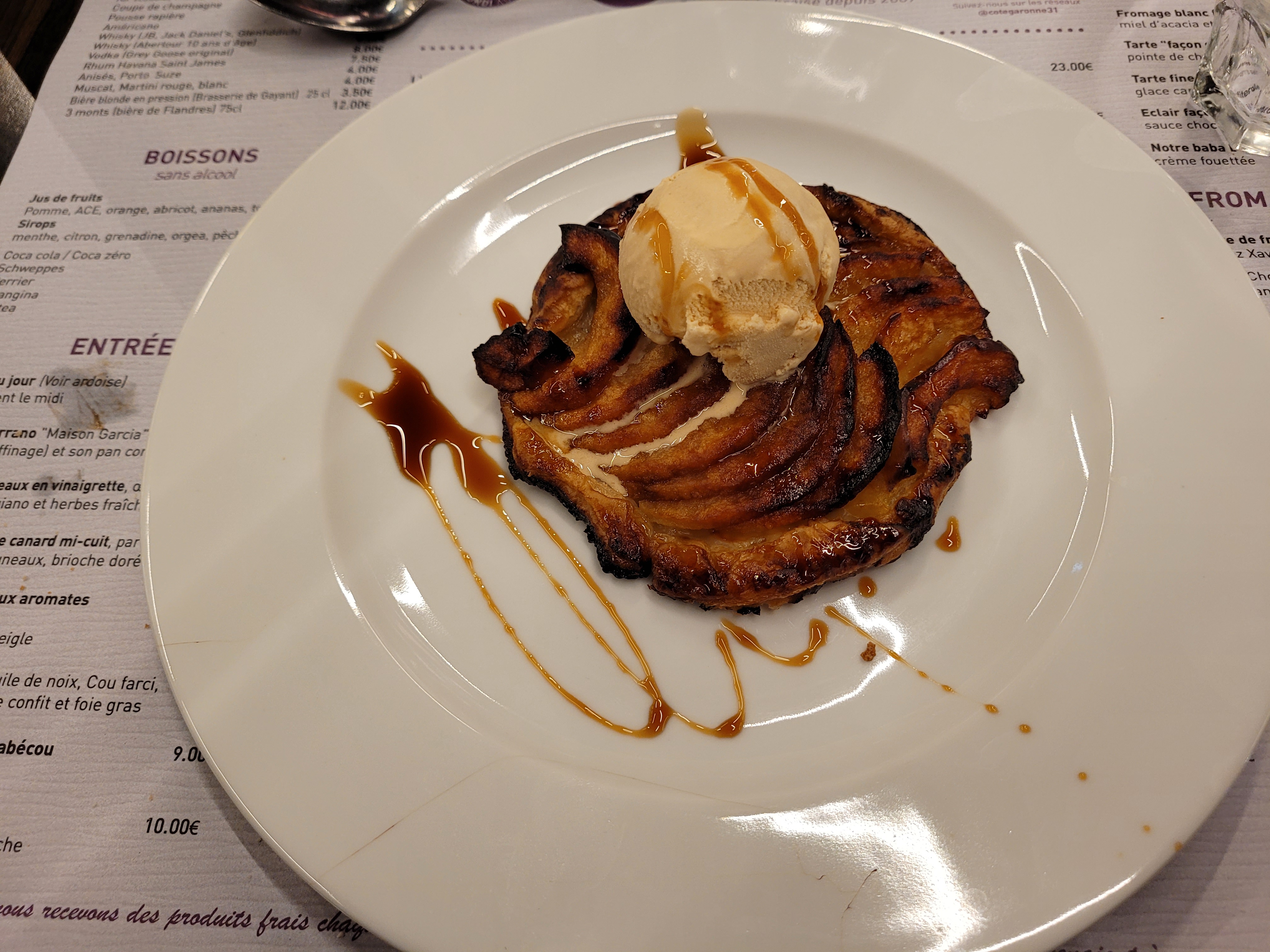 Une belle entrecôte saignante grillée dans une cheminée est, pour moi, la promesse d'un moment délectable. Je n'ai pas été déçu. Bien que je n'en aie pas pris, j'ai vu des desserts sur des tables voisins servis en portions généreuses. En somme, le Côté Garonne fait plaisir aux gourmands. Le cadre est classique et le service a été mené avec professionnalisme. J'ai senti le patron un peu direct et tendu, rien de bien gênant, mais c'est contraire à l'esprit de détente qui, à mon avis, doit régner dans un restaurant.