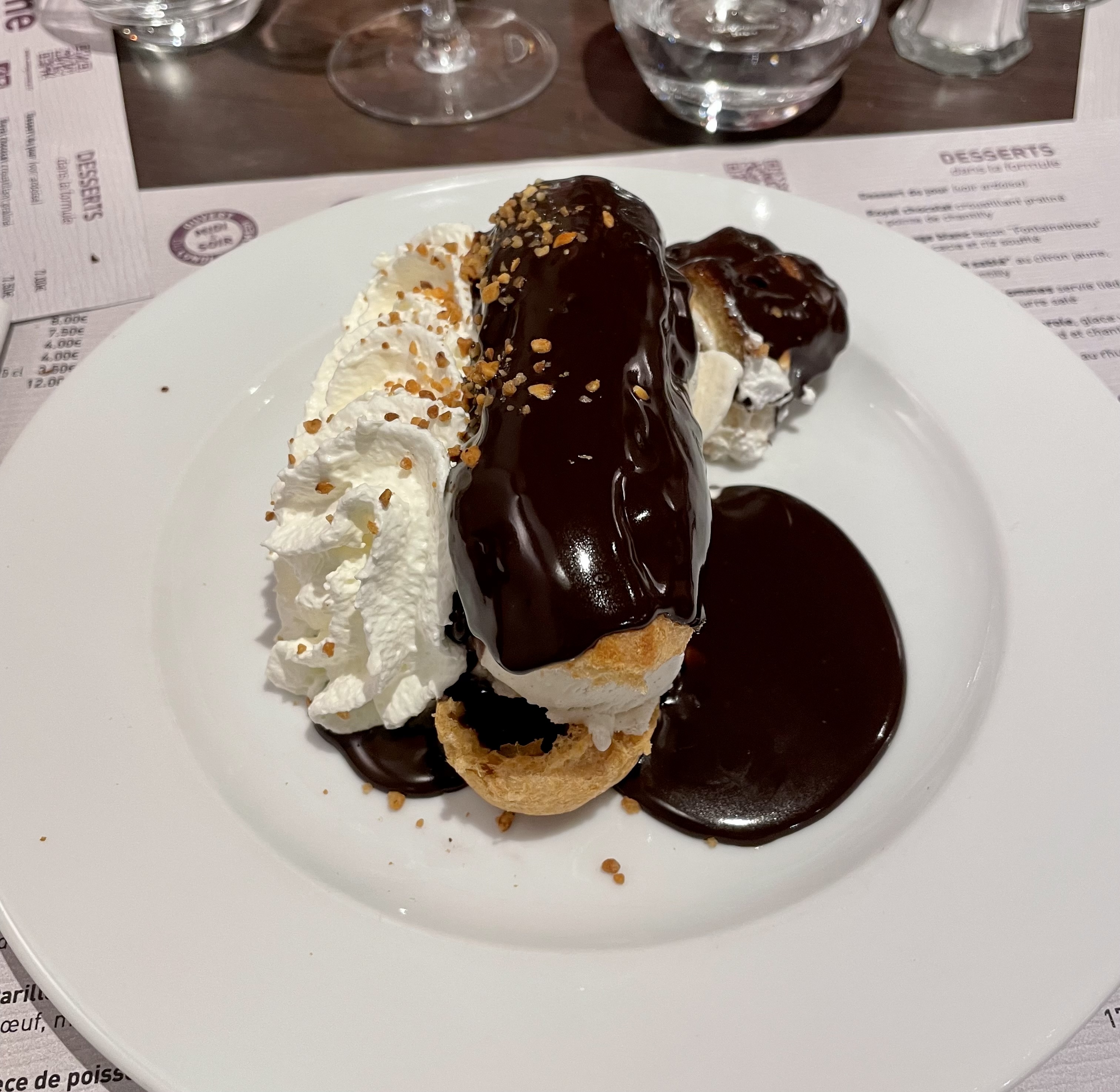 Malgré un restaurant complet et n'ayant pas réservé le personnel nous a trouver une petite table avec un accueil chaleureux. Les 3 plats que nous avons choisi étaient globalement bon, avec un très bon pour mon andouillette 5A grillée au feu de bois. En revanche servir un éclair façon profiteroles tout droit sorti du catalogue d'un fournisseur industriel est indigne de l'établissement. Le plus décevant est l'attitude du directeur qui n'a pas dénier réagir à ma remarque sur ma déception, faite en toute amabilité et qui n'a vu en moi qu'un titulaire de carte bancaire tout préoccupé qu'il était par les encaissements!!!!