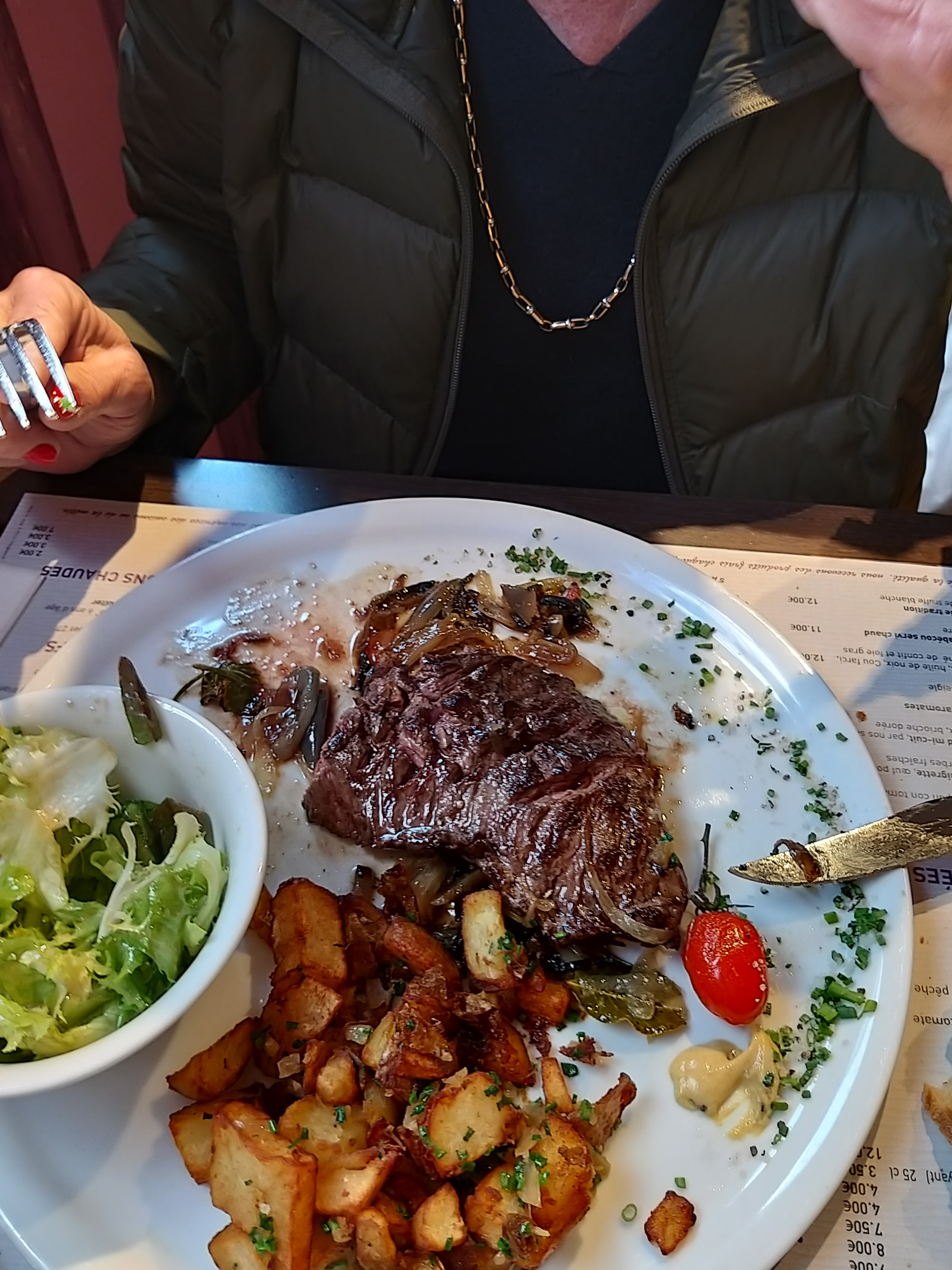 Je suis venue avec ma copine. On a bien mangé (entrecote 350 grammes à 19€) prix raisonnable avec bon personnel. Grillade de viande juste à l'entrée.