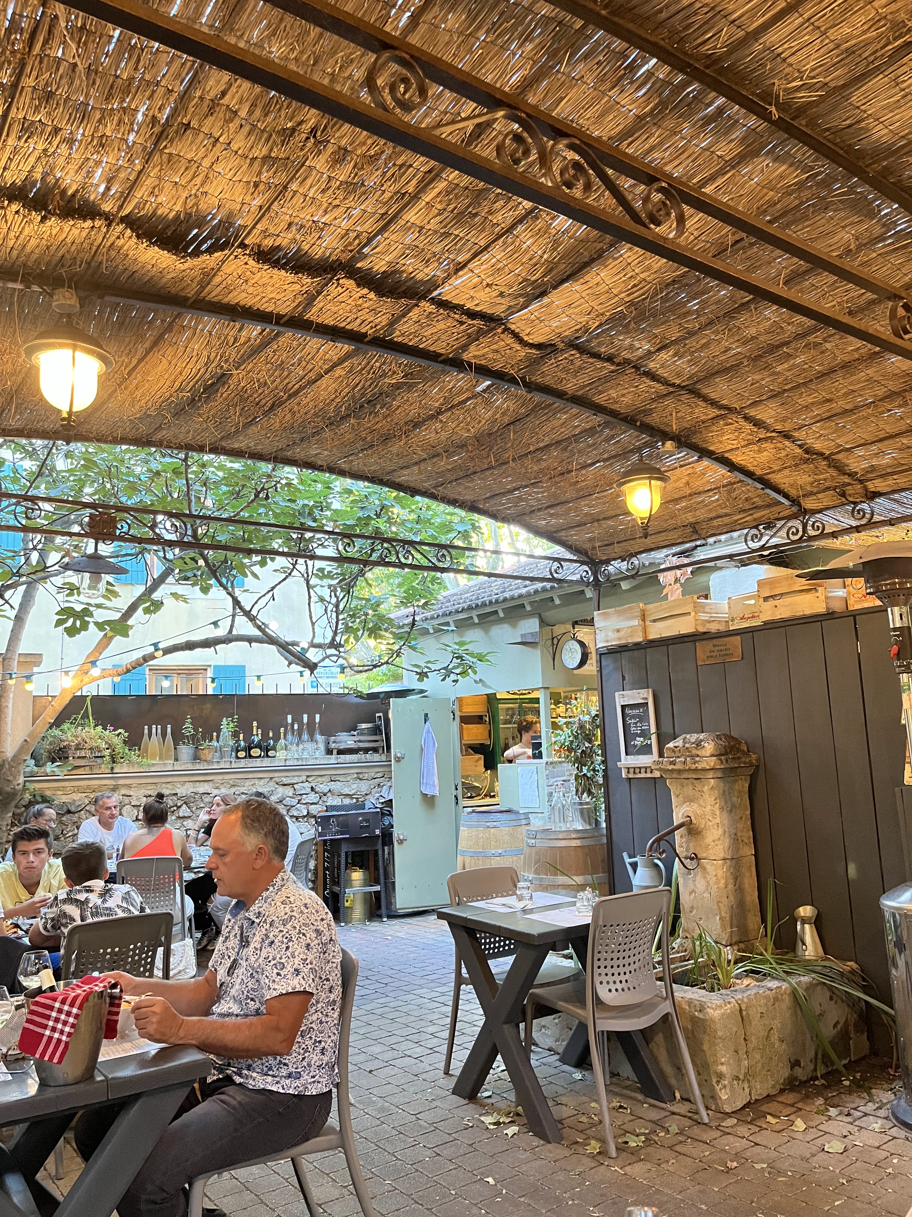 Sous les platanes avec le bruit des cigales.un petit restaurant avec une cour intérieure ombragée qui sert de super salades et un viande de qualité grillés aux petits oignons