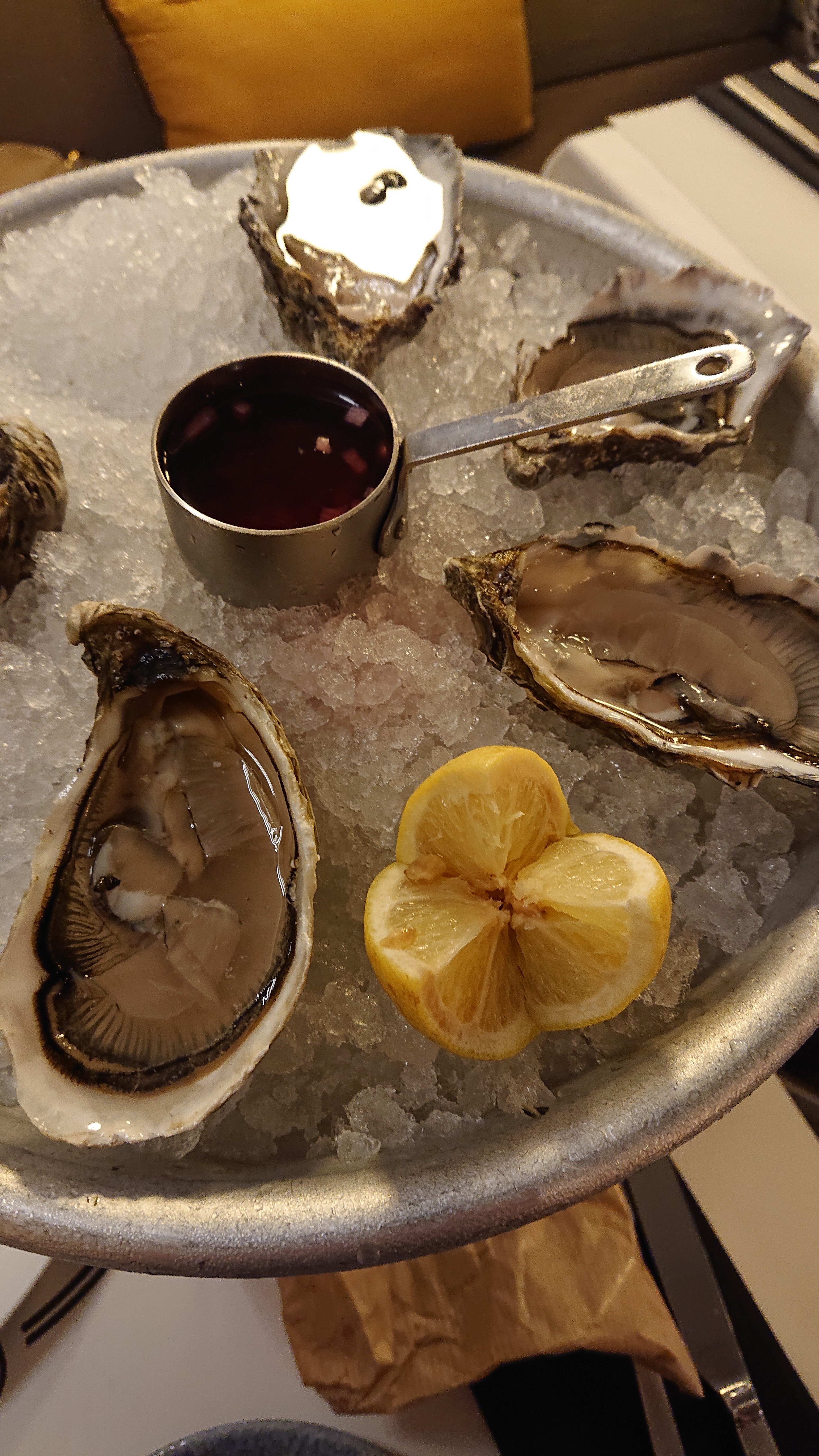 Très déçue car au premier abord le lieu est attirant, déco sobre et chic. Nous sommes donc rentrés dans l'établissement pour dîner. La carte était appétissante mais les prix pas donné.... j'ai choisi une raviole de langoustines à 25 euros...alors comment dire.... c'était bon mais rien dans l'assiette... côté ambiance ça aurait être pu très agréable avec la musique jazz mais totalement gâché par des commentaires excessifs de certains clients et du patron de la diffusion des matchs de foot retransmis dans la salle de restauration. Par contre point positif les serveurs.
