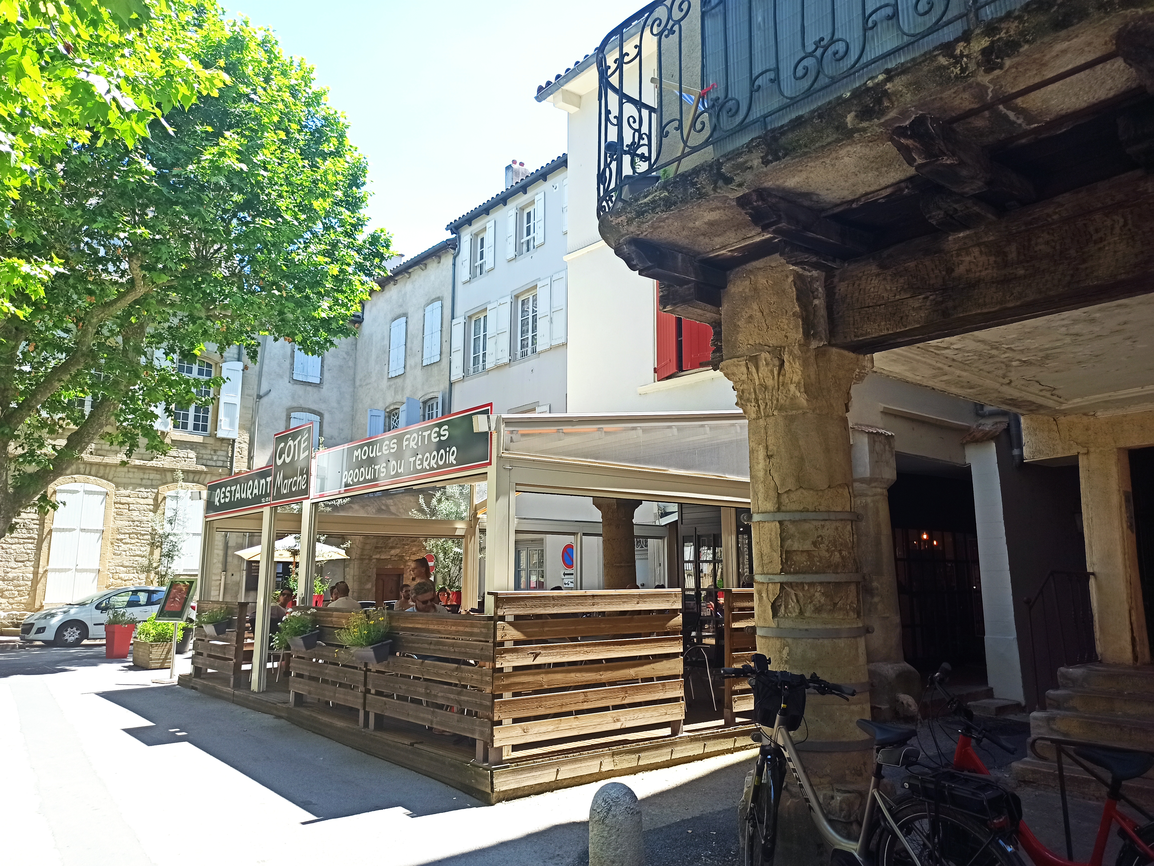 Restau sympa terrasse à l'ombre des platanes. Service agréable et nourriture correcte mais ce n'est pas du fait maison . Nous sommes arrivés à 14h et accueillit avec le sourire. Service rapide mais apparemment on nous a dit de ne surtout pas y aller aux heures de pointe. Par contre on a trouvé que c'était cher. Ils se gavent sur les apero et desserts.