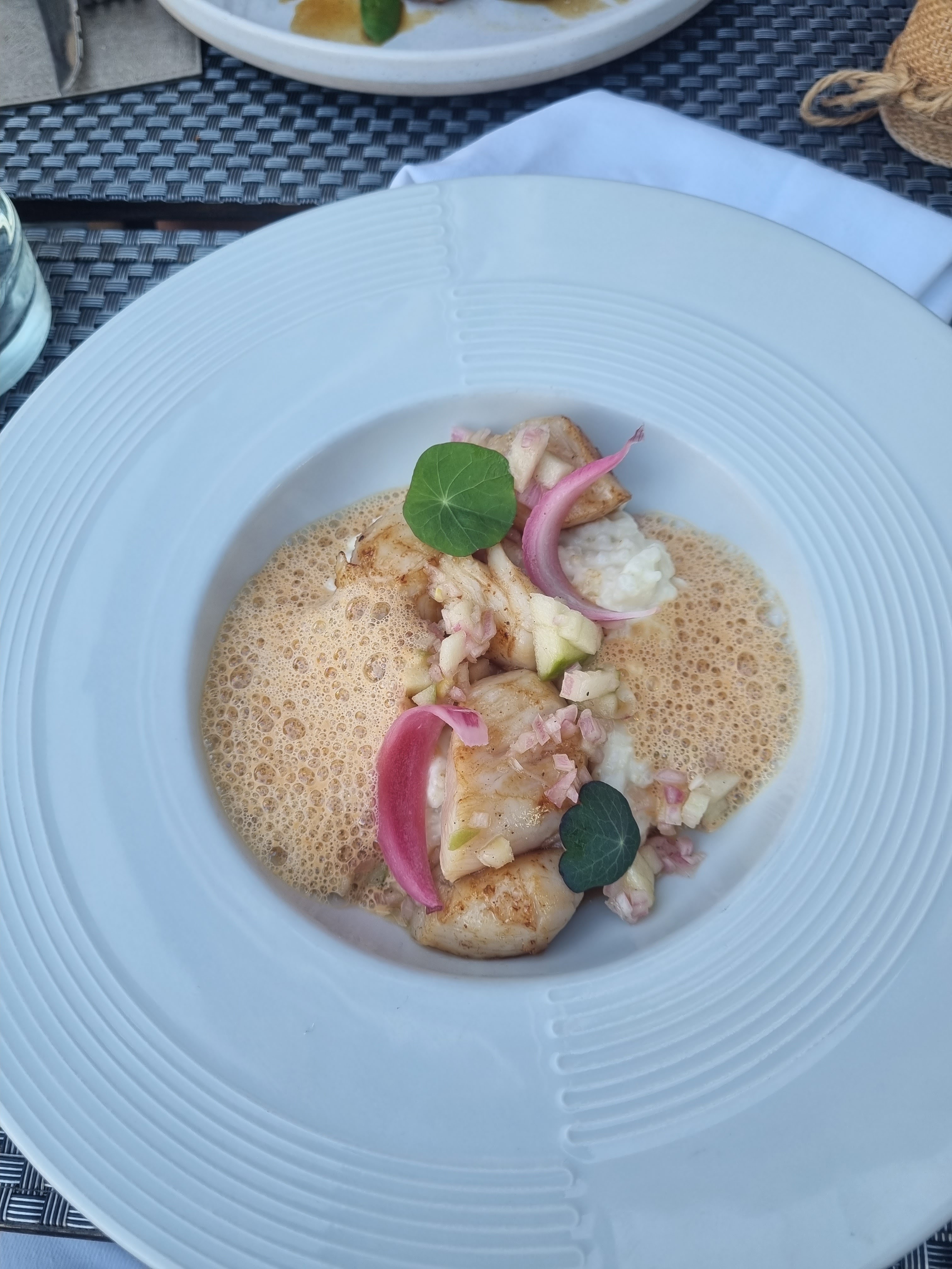 Accueil très agréable, St Jacques et risotto à l'encre de seiche cuisinées parfaitement avec un peu d'acidulé grâce aux échalotes et pommes granny. Une vraie réussite et une belle adresse