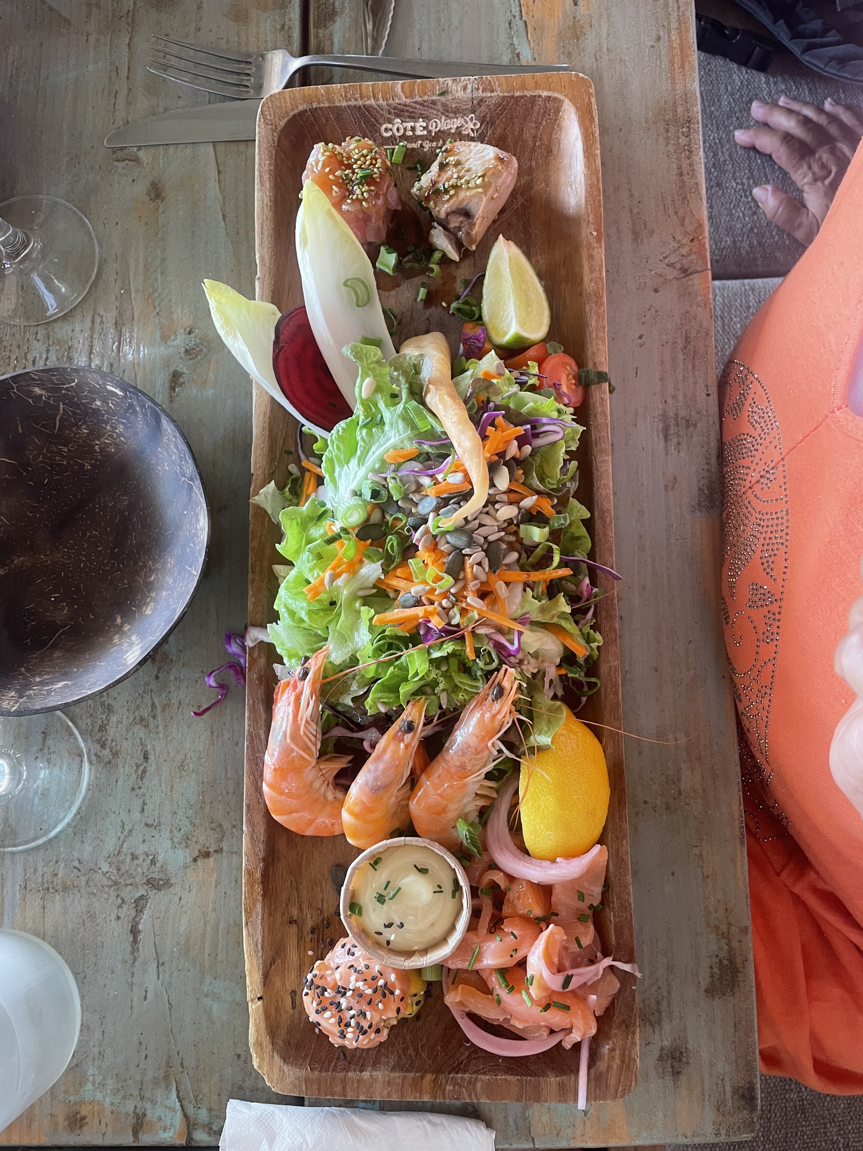 Service convenable, qualité de la nourriture passable, sèche caoutchouteuse et mal assaisonnée . Mauvaise surprise car nous étions 9 et nous avons été contraint de prendre les formules barbecues ( ils ne servent pas de plat il y a plus de 8 personnes par table) . Résultat : une partie de notre groupe est allée manger ailleurs ce qui a mis une mauvaise ambiance pour notre aprem ( mais nous avons cependant pu prendre des plats, en photo la salade Cote Plage ) , sans compter qu'il n 'y avait pas de salade Burrata à la base mais que finalement du stock serait revenu comme par magie Pas très bon rapport / qualité prix, seul le service m'a semble irréprochable ( bien que un seul passage du plagiste en l'espace de 2h )