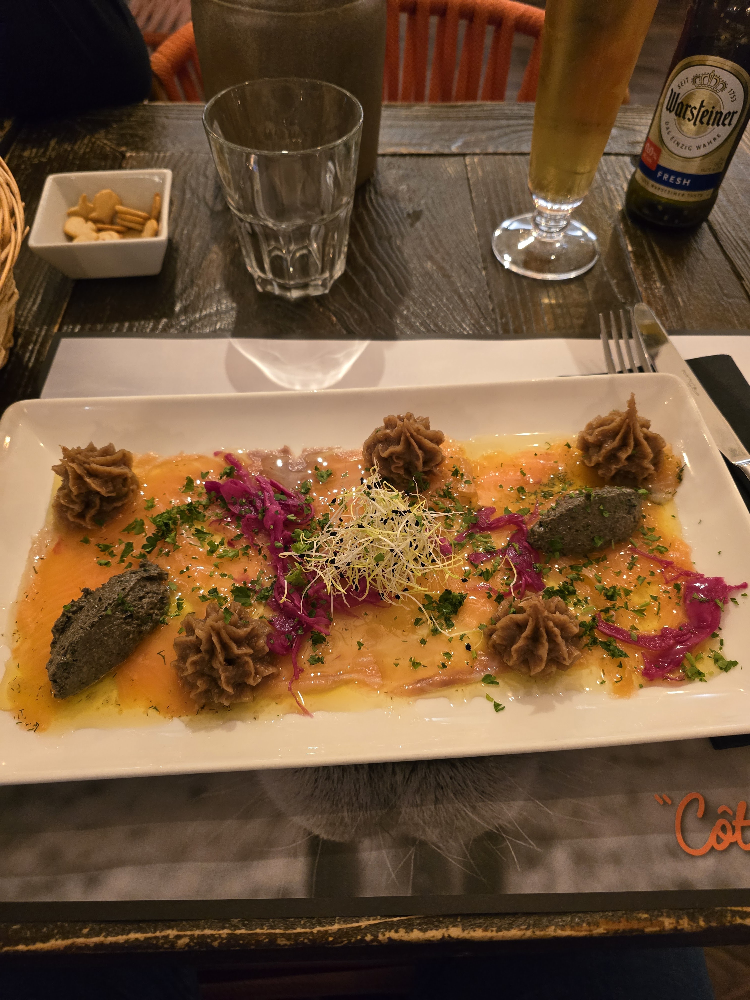 Houmous délicieux. Gravlax d’agrumes avec saumon excellent. Foie de veau sauce secrète du chef succulent.