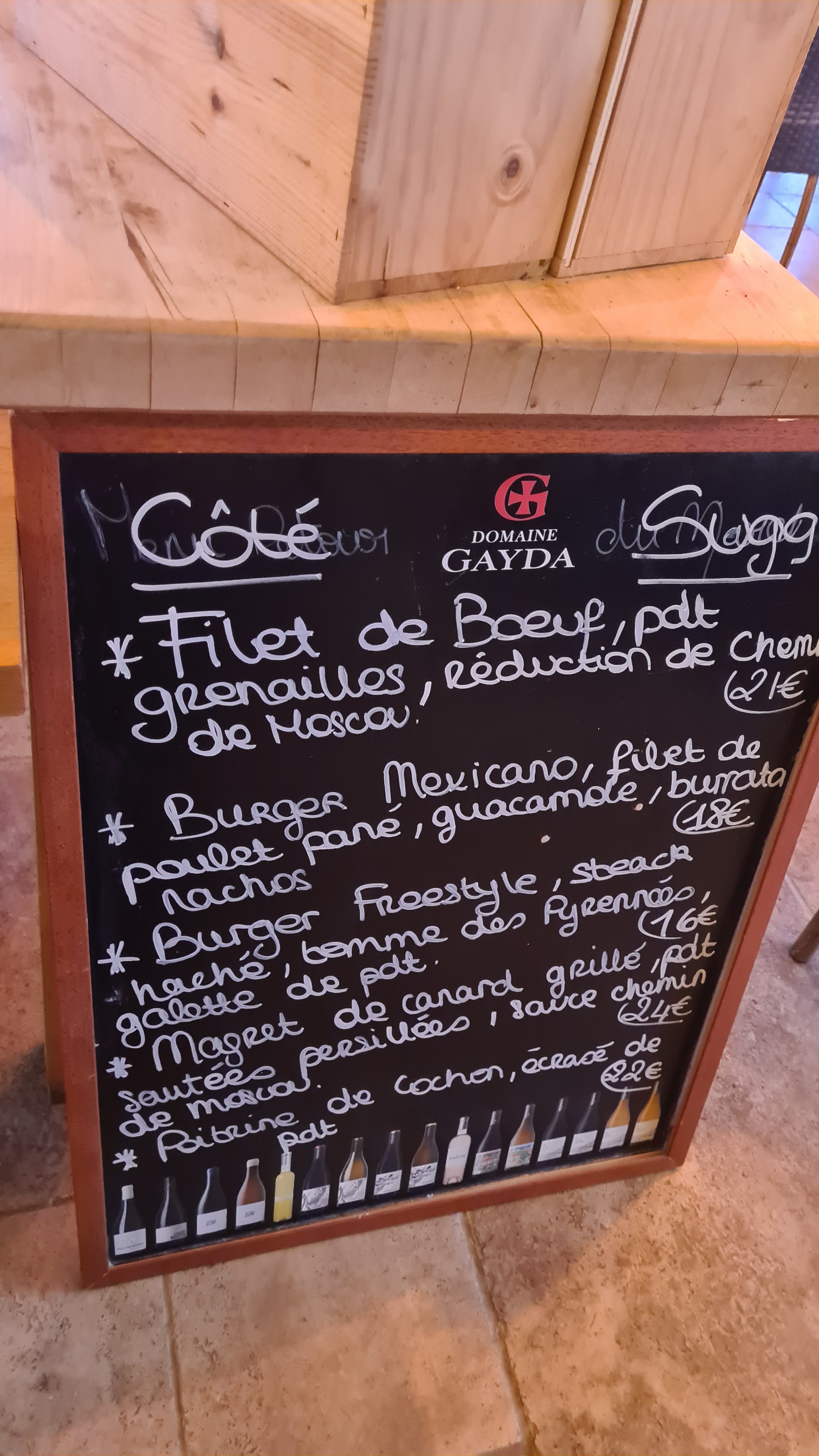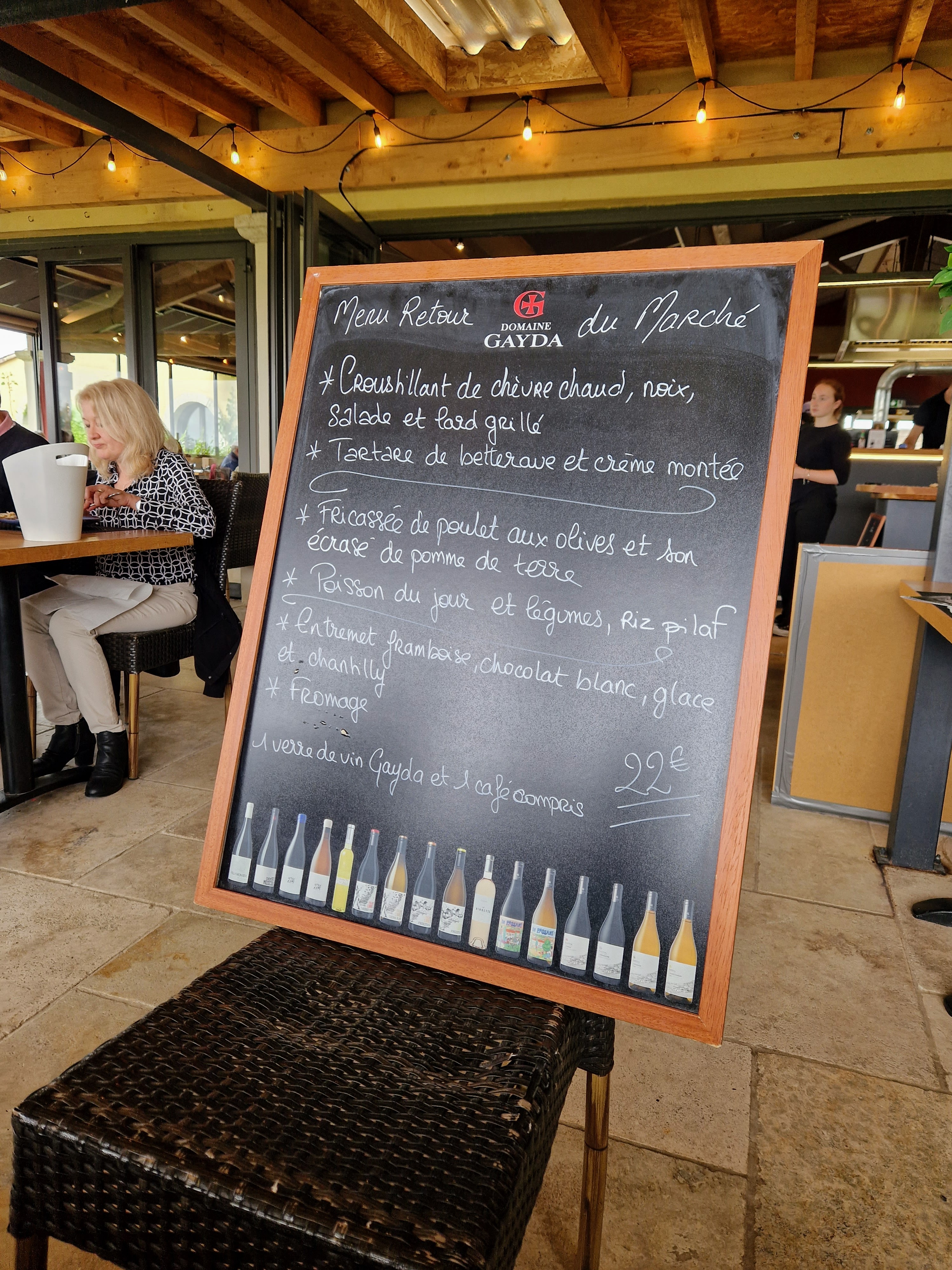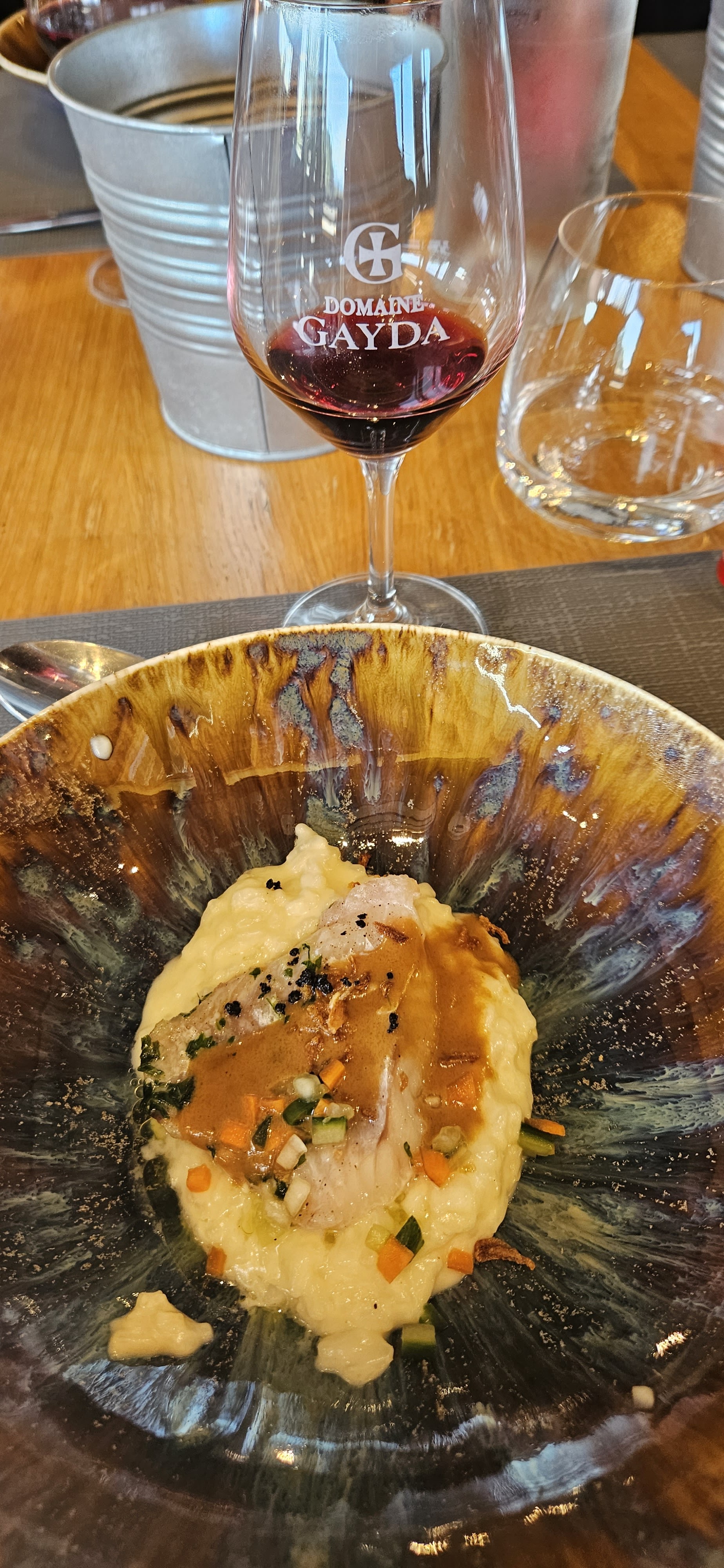 Une bien belle table au Domaine Gayda Des plats variés et de qualité, une carte de suggestion et un menu du marché, la carte des vins du Domaine et une très belle vue dégagée Service pro Ça donne envie de revenir goûter d'autre proposition !