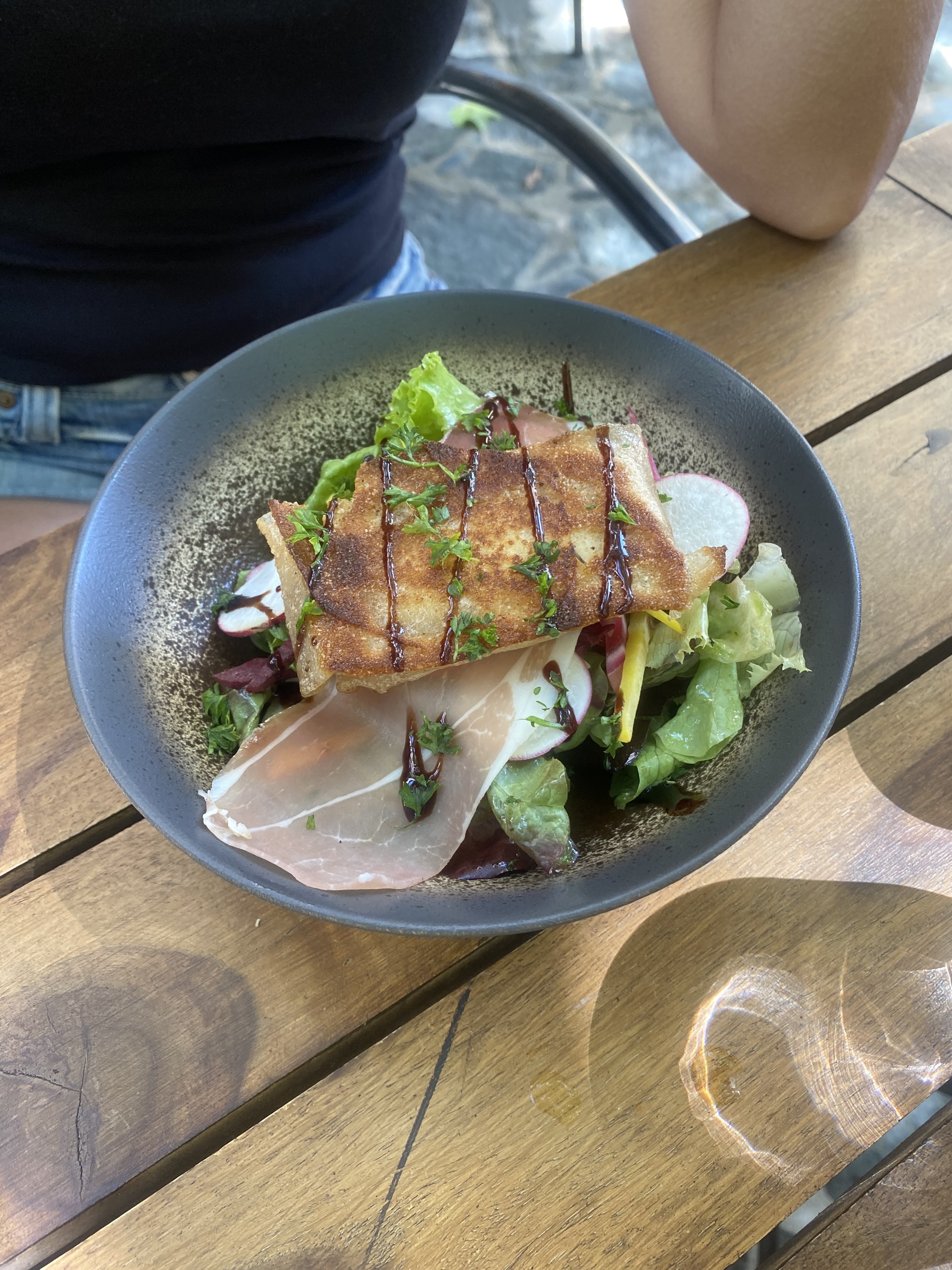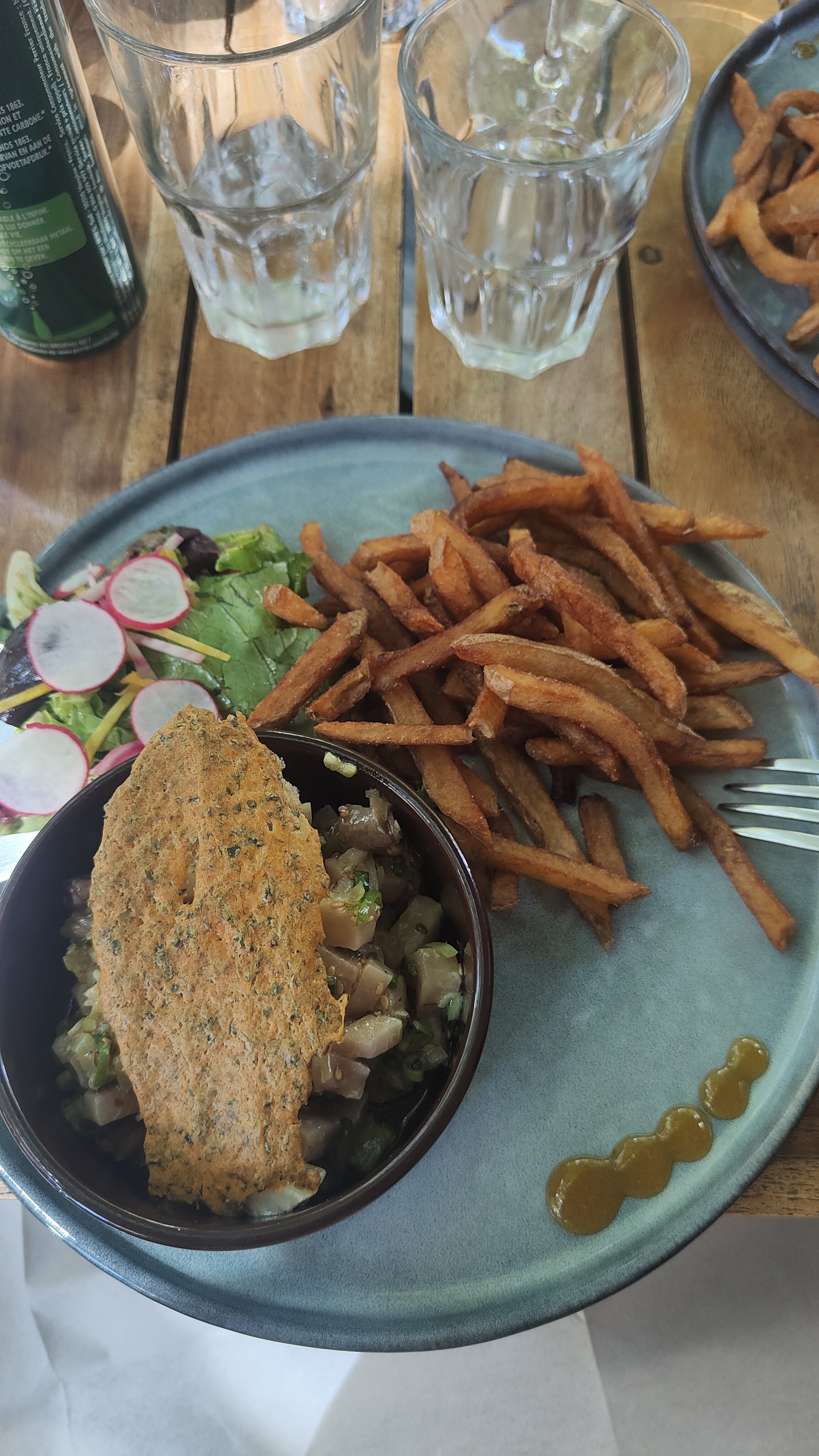 Déjeuner en amoureux sous les platanes, foie gras excellent, aïoli très bon ( peut être un petit manque d ail ?) bière blanche et rosé du pays dans les mêmes ambiances! De très bonnes bases en pâtisserie !!!! Petite finition, la tuiles maison avec le café ! Je recommande.