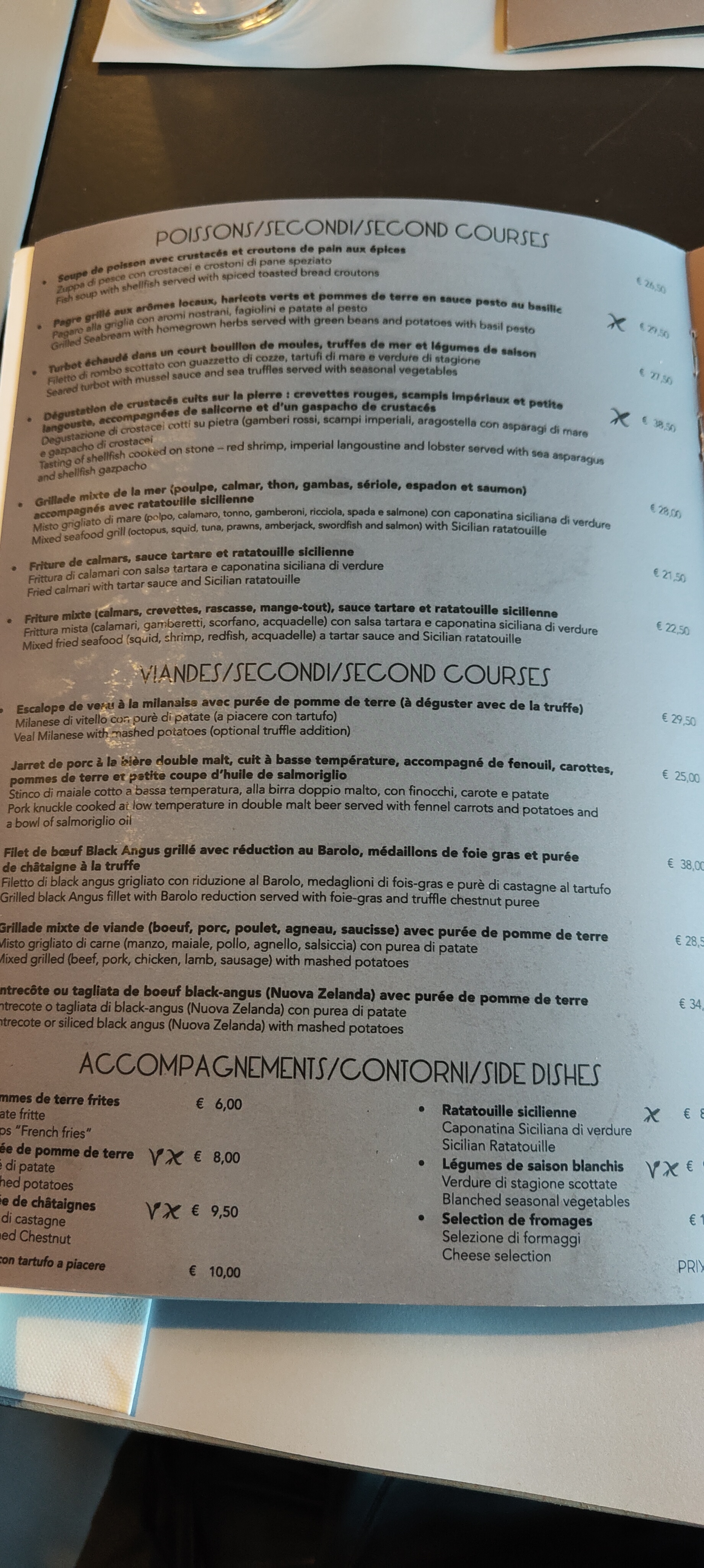 Bonne expérience, je recommande vivement ( pâte genre tagliatelles aux crevettes gambas sauce truffe olive / grillade de poissons : saumon poulpe thon ... tiramisu ) Les - : Carte compliqué à lire bcp d'infos plusieurs langues Places restreintes sous la tonnelle Prix élevé pour les desserts (8€ un tiramisu) Serveurs : parle mieux italiens anglais que Français Les + : Des plats savoureux avec des mets deceptions bien travaillés Une qualité et fraîcheur des ingrédients Une décoration moderne dans l'aire du temps Un service rapide Carte anglais français italien
