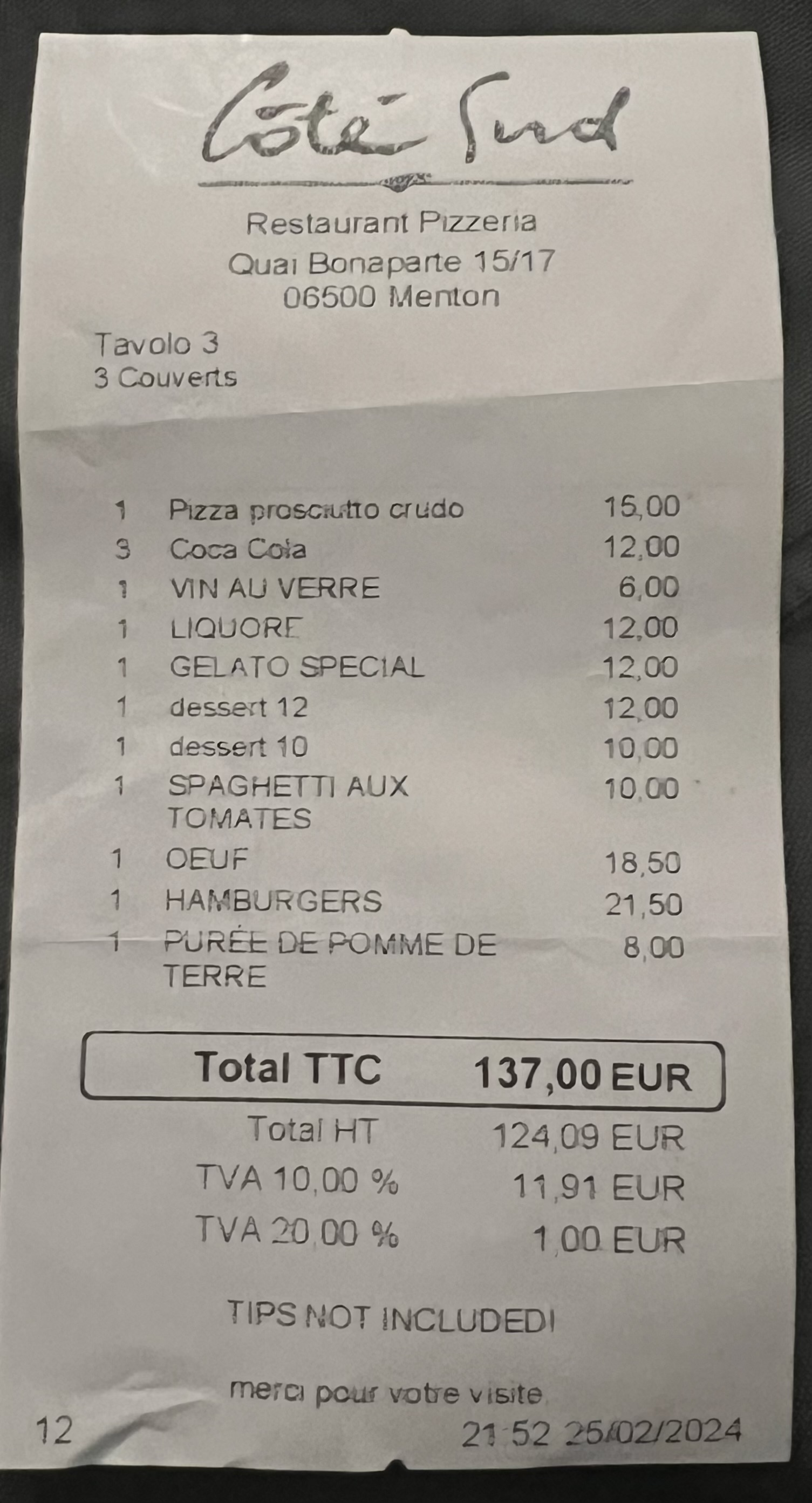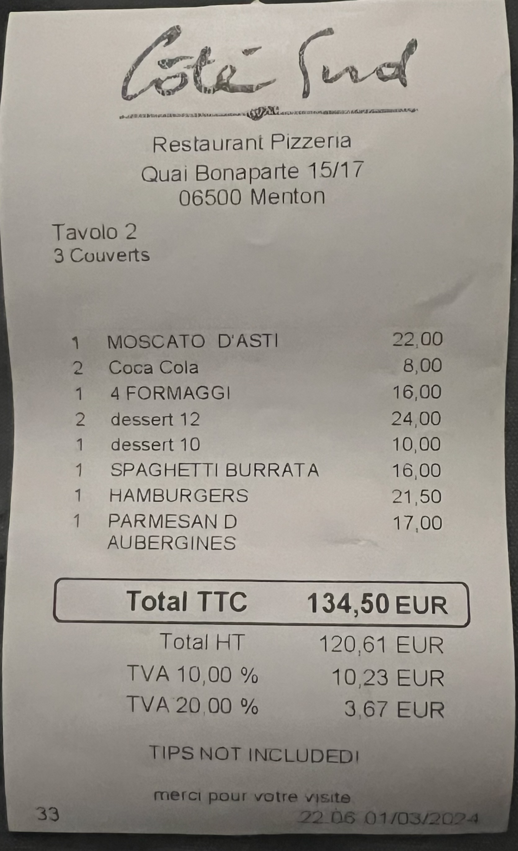 C’est mardi, beaucoup de restaurants sont fermés à Menton. La saison se termine. En déambulant sur le port, mon attention est attirée par ce restaurant à présentation soignée qui donne envie de voir plus loin. Bel accueil par la maîtresse des lieux qui reste discrètement omniprésente. Le cadre est agréable et chaleureux, la carte raffinée et variée. Le service attentif et rapide. Nous avons choisi la grillade mixte qui est un sans faute servie à point comme demandé et une pizza Esteva, délicieuse, vraiment sans doute une des meilleures du coin, le tout accompagné d’un verre de vin blanc et rouge. Le limoncello est offert. Le repas est rythmé par le ballet de jolies serveuses en teeshirt et jupe beige nouée à la taille qui virevoltent avec sourire, délicatesse et attention autour des tables contribuant à renforcer l’ambiance chaleureuse de l’endroit. L’addition est de 62€, ce qui est très correct tant pour la qualité de l’accueil, des lieux et des mets. Sans nul doute, j’y reviendrais. C’est une très belle découverte.