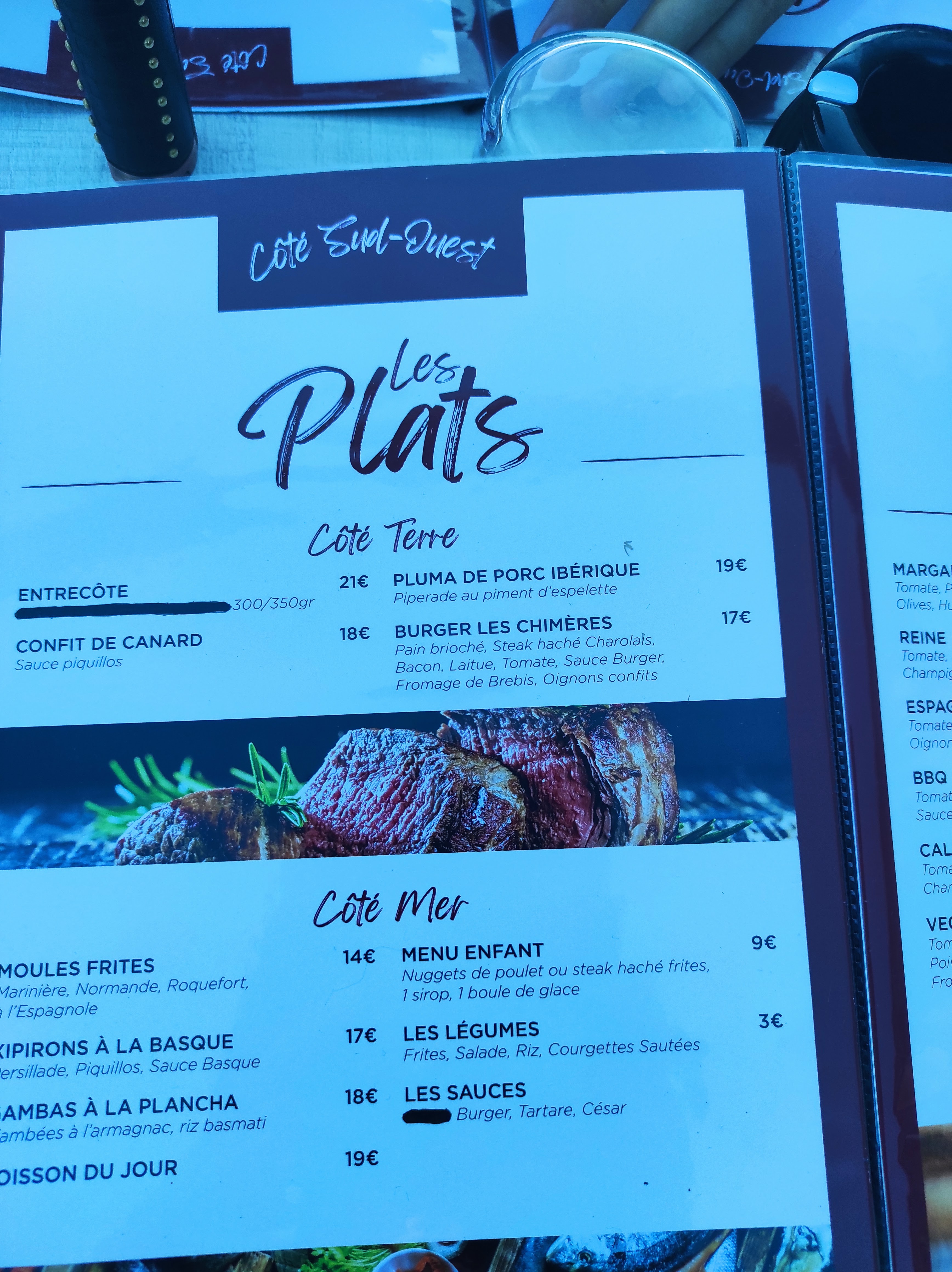 Du bon et du mauvais...on nous propose un rosé sans nous dire le prix (pas noté sur la carte,mais plus cher que toutes les bouteilles proposées). Moules déjà décortiquées!! Coquilles vides puisque toutes au fond de l'assiette, beaucoup trop cuites qui m'ont coûté un aller retour a la clinique de Bayonne pour intoxication alimentaire... Alors elles sont peut-être fraîches le matin quand elles arrivent mais combien de temps restent-elles dans la gamelle au coin du piano ?? (Du feu) Vous pouvez y aller les yeux fermés pour le porc ibérique par contre dommage pour l'accompagnement , des frites surgelées...