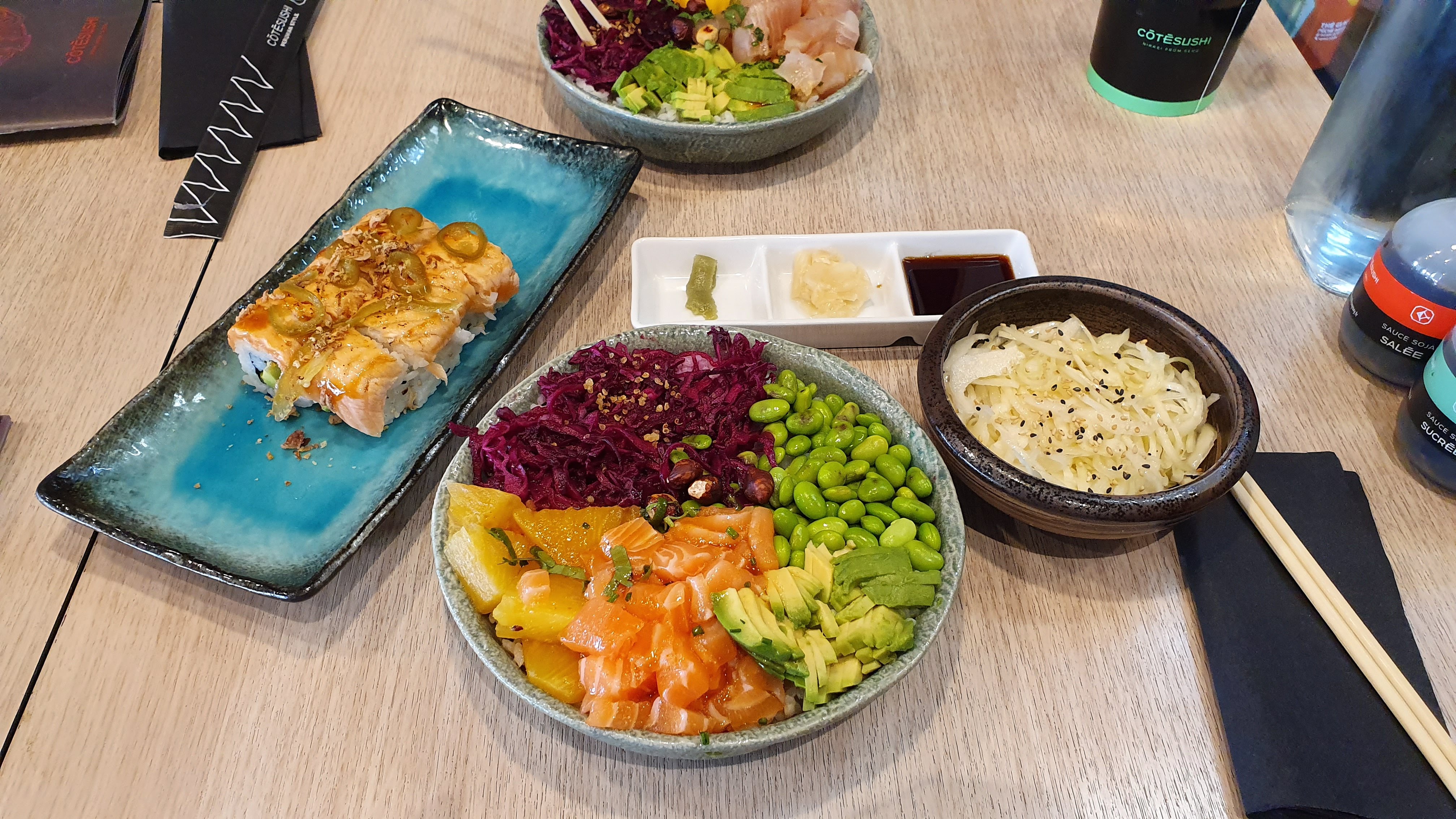 Côté sushi a le mérite de proposer des alternatives au « japonais » classique toujours sympa si on veut changer un peu. Et l’intelligence de proposer des sauces sans gluten à ceux qui ne m’en tolèrent pas ! Mais c’est toujours un peu cher....!!