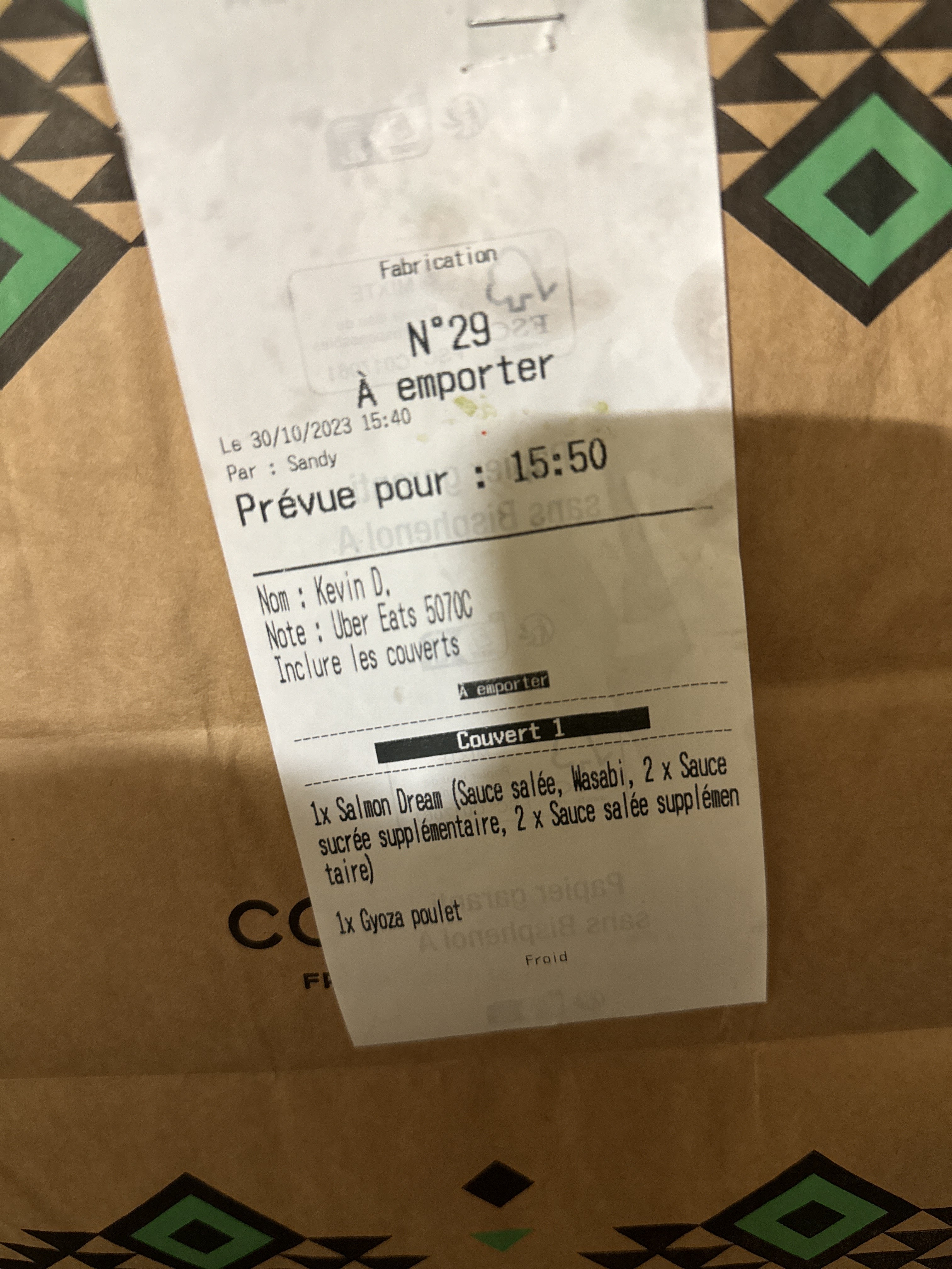 Commande Uber Eats nº29 du 30/10/2023 (servie par Sandy) : Vous pouvez m’expliquer comment je fais pour manger sans baguettes ? Et si je commande une sauce salée et en supplément une sucrée pouvez-vous également m’expliquer comment je fais pour goûter les deux si seulement un seul récipient est fourni ? Je ne sais pas si la personne qui a préparé ma commande est nocive mais « merci » de m’avoir obligé à manger directement avec les mains !