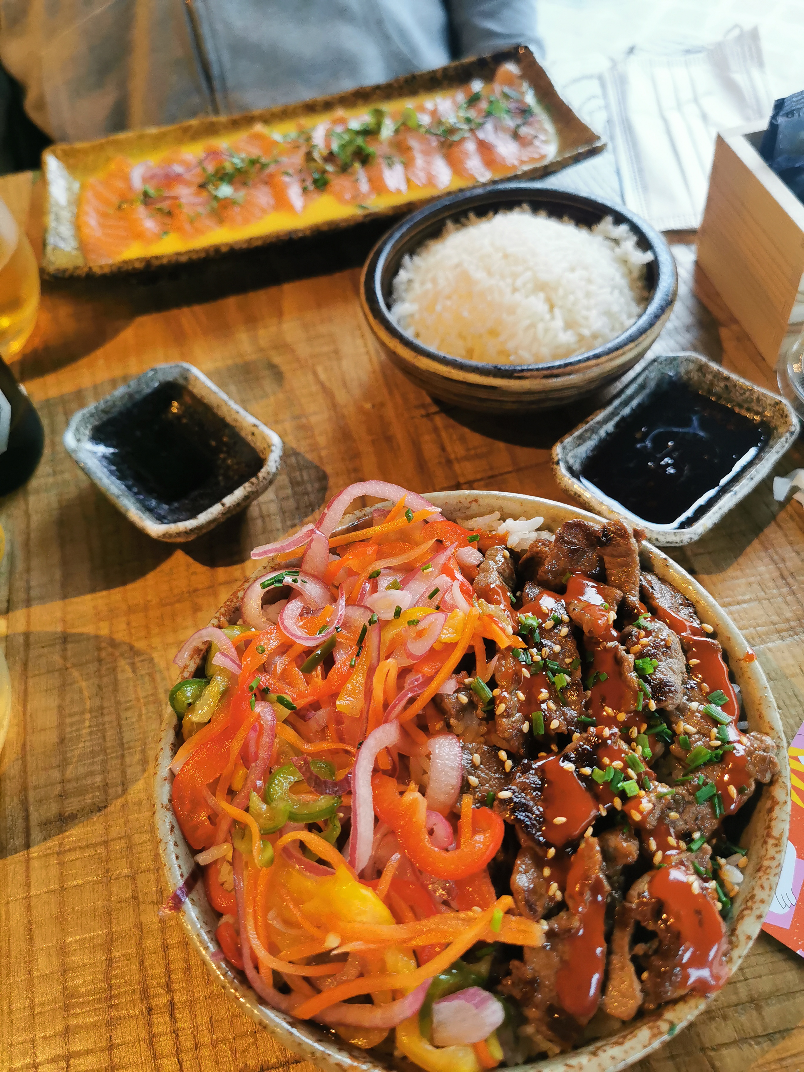 Pas grand grand-chose à dire à part je n'y retournerais plus service trop long il manque des ingrédients et il nous manqués des plats de plus un balai incessant de livreur et la timbale les livreurs viennent chercher leurs batteries et bien sur vous mangez à côté du local à batterie super et j'ai goûté une assiette de puré d'avocat sans fleurs de lotus car il n'y en avait plus au goût d'oignon sans commentaire et le dessert servi dans les assiettes de la pizzeria qui communique au restaurant à déconseiller....je pense que la pizzeria ne vaut pas mieux car le pizzaiolo venez fumer sa clop devant le côté sushi énorme reconnaissable à sa tenue bien sûr à bonne entendeur bon courage.