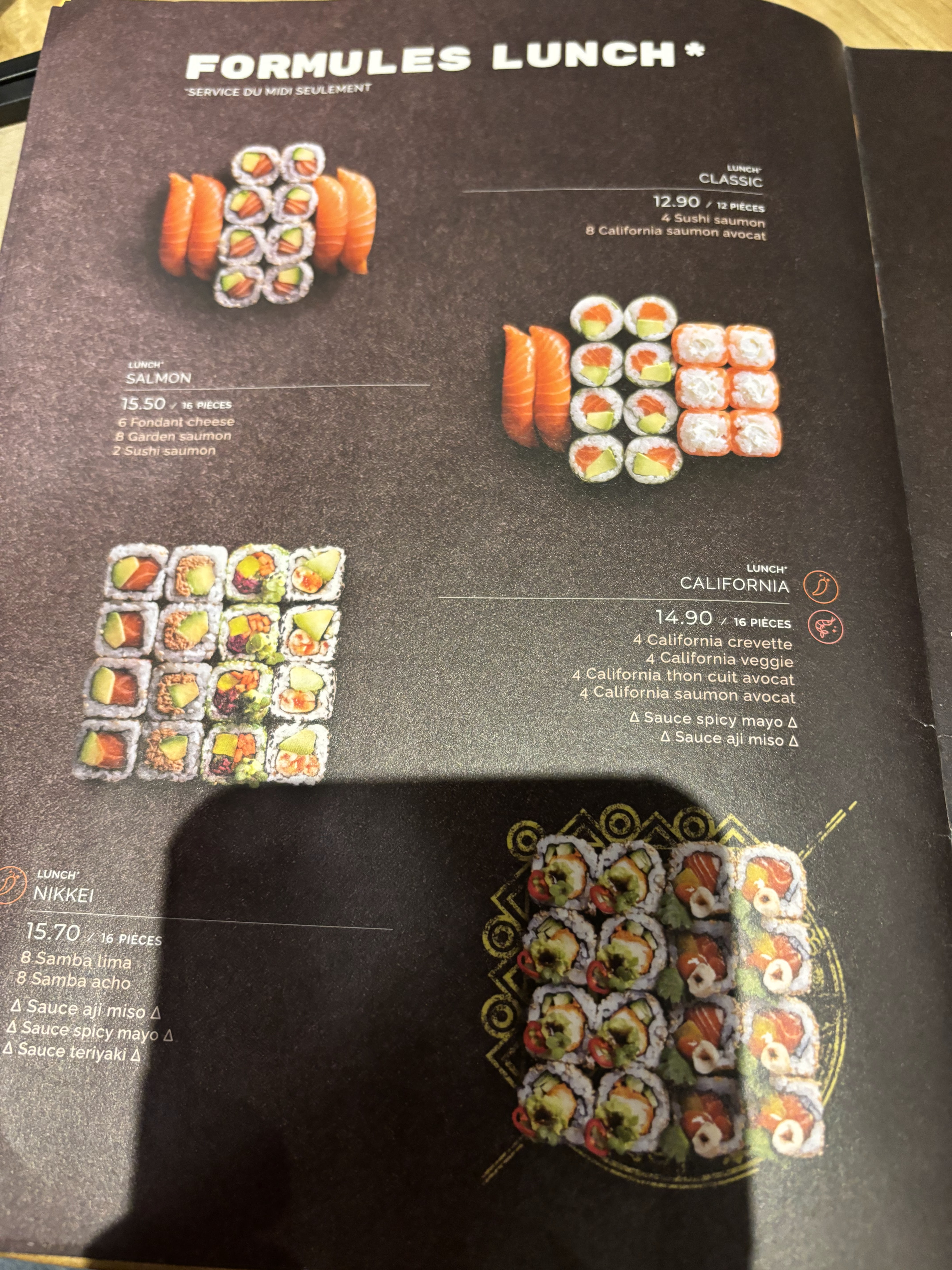 Je ne peu pas noter le service et l’ambiance car ma commande était en livraison. Cependant, la qualité des sushis était vraiment questionnable, le saumon avait un arrière gout de poisson pas frais et même le thon cuit était médiocre. Rien à dire sur les sushis au poulet cependant.