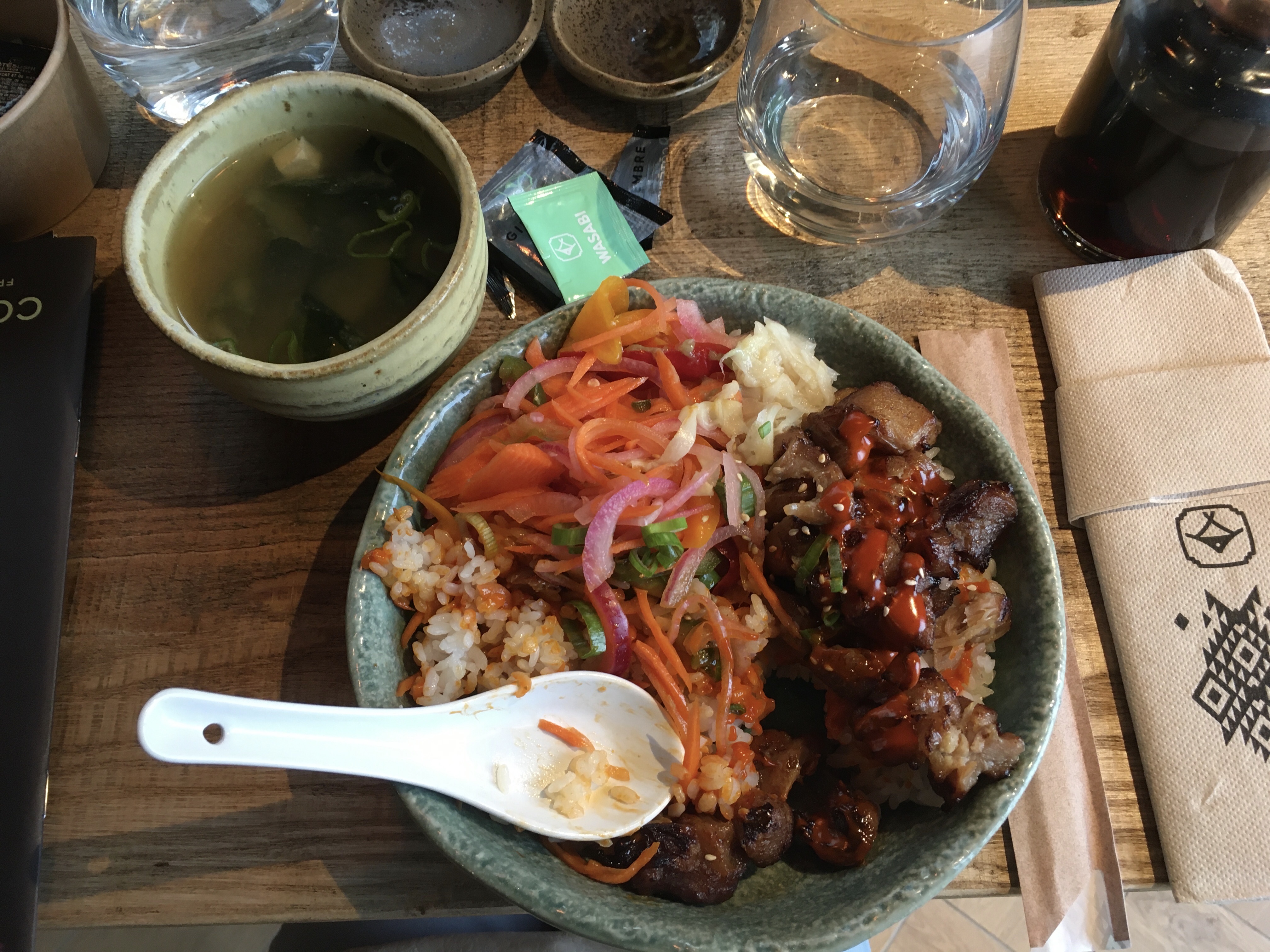 Nous avons commandé à emporter car la salle n’était pas ouverte (19h). Merci pour les mochis en plus !